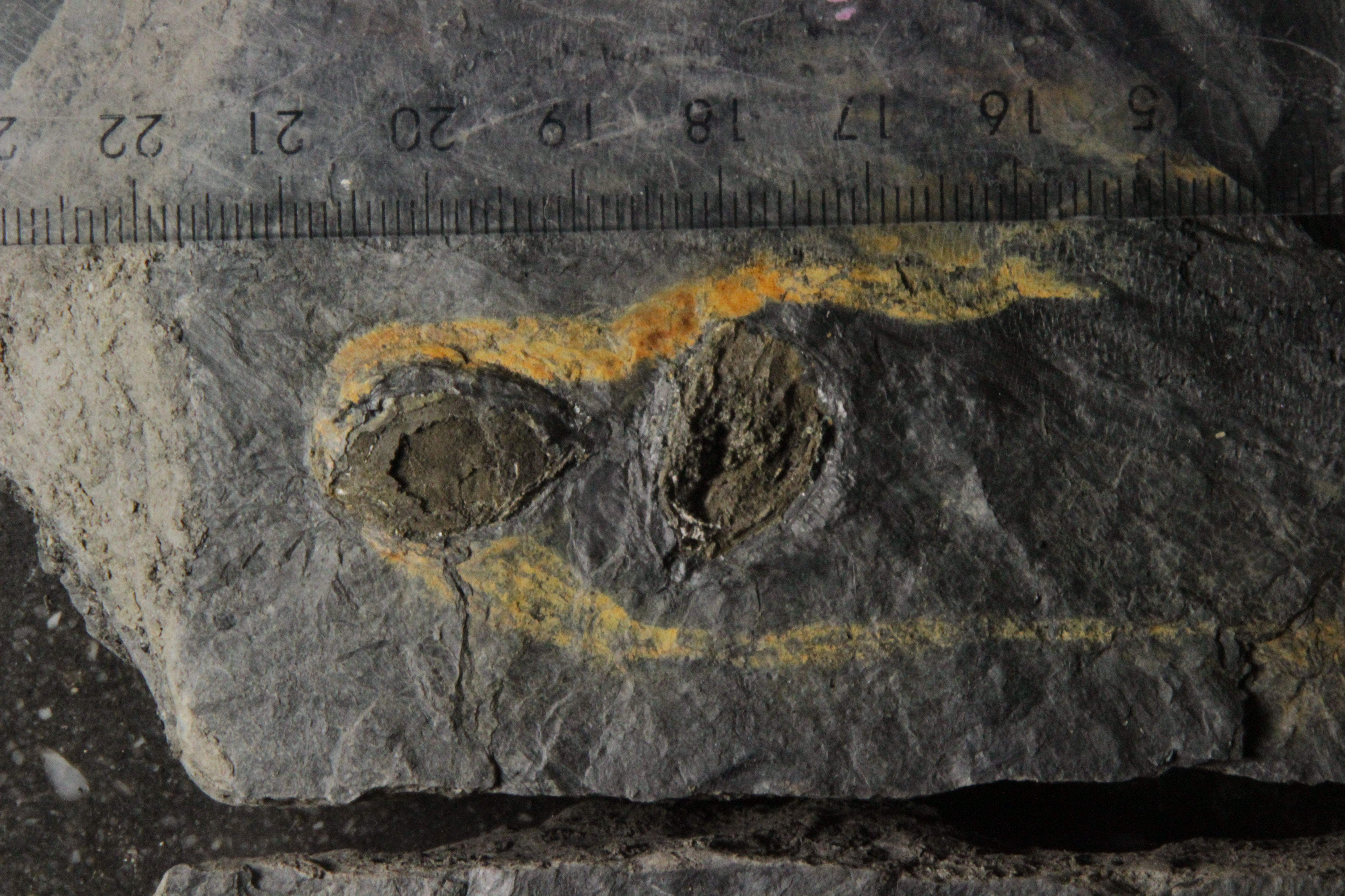Bij die eerste dacht ik eerst misschien aan zaden? Iets van Cordaïtes ofzo. Maar ik weet de schaal niet van zo zaden.