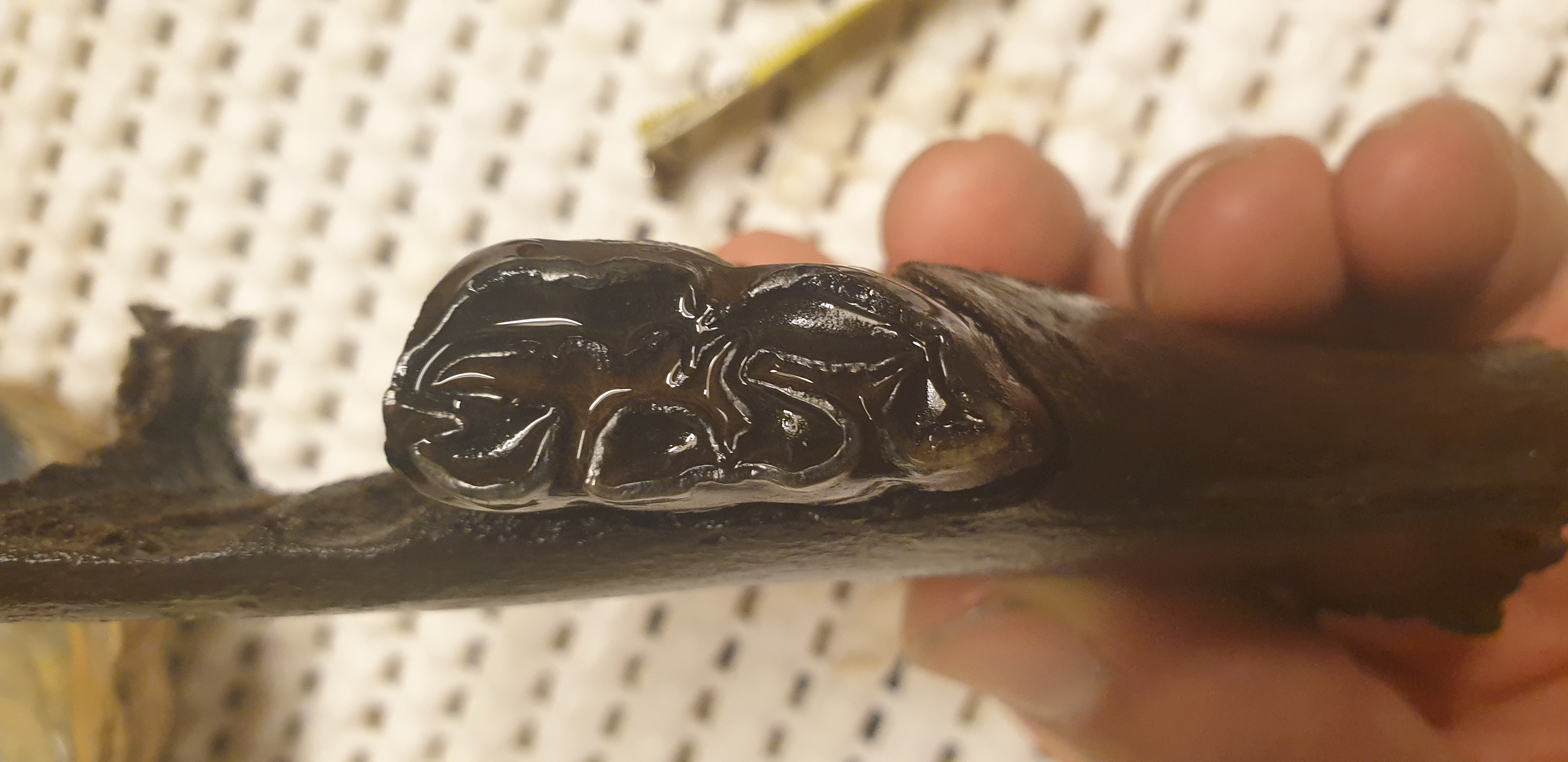 Je ziet op de 3e foto dat die dicht bij de mond zat.