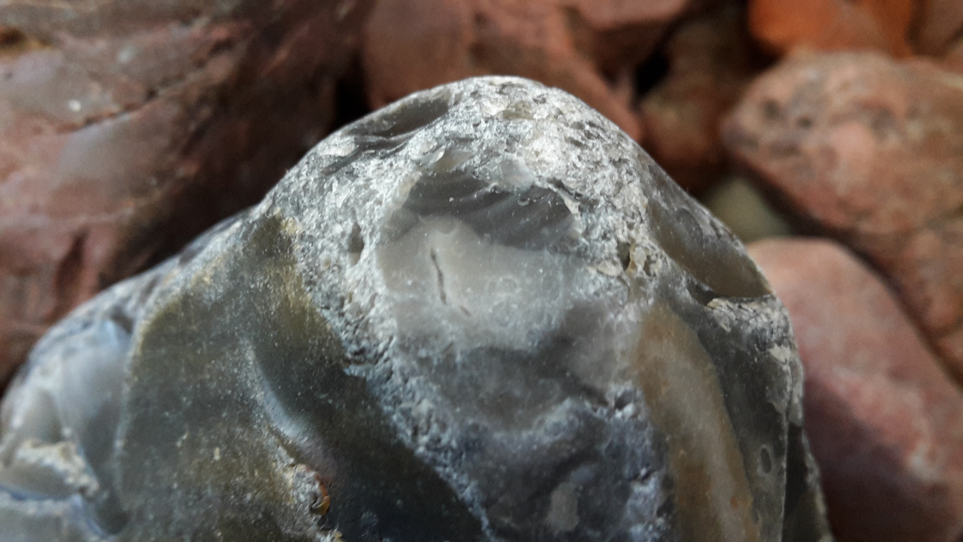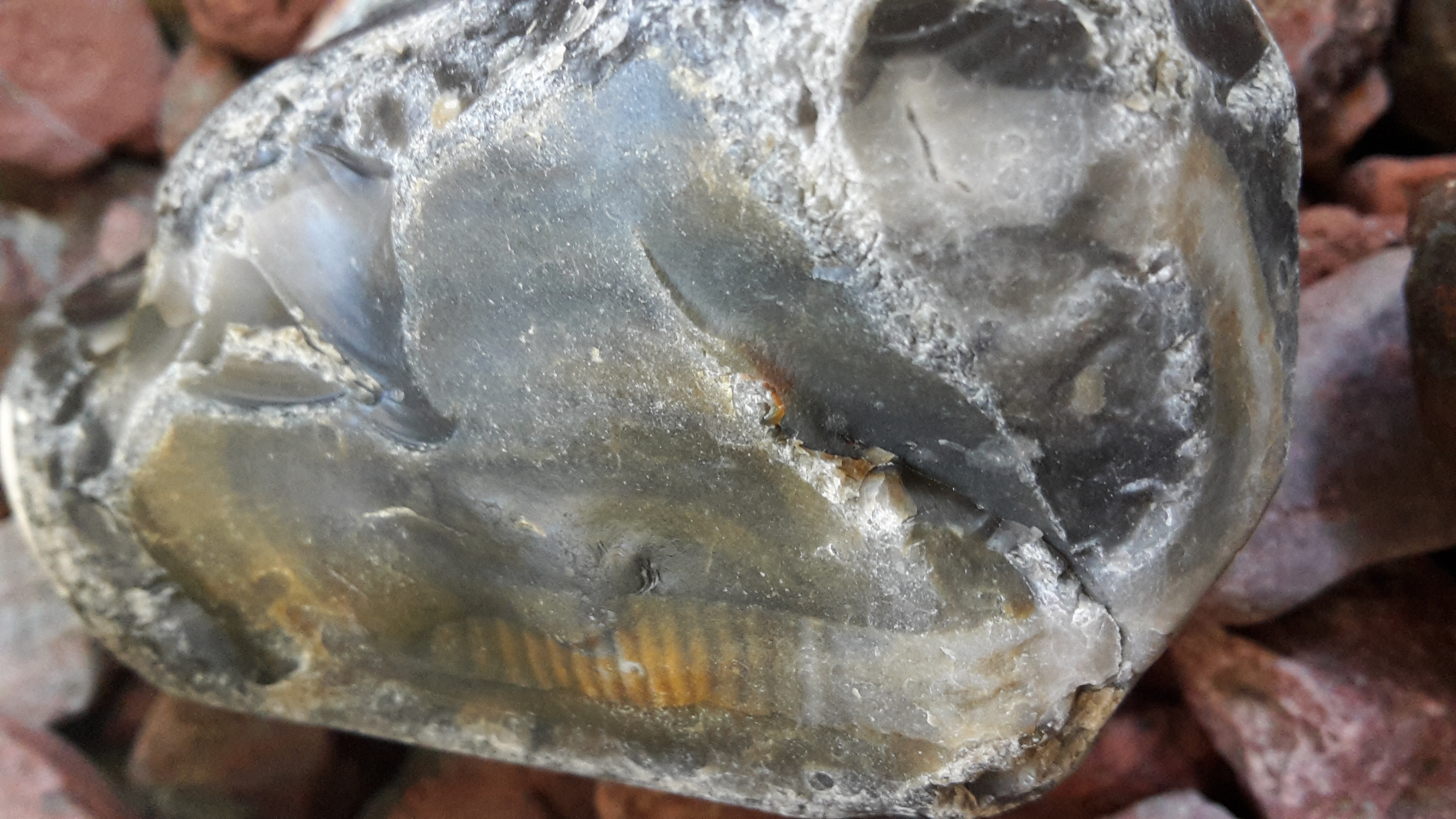 Afgelopen week vond ik dit stuk vuursteen van 9 cm lengte waarin een worm lijkt opgesloten. De worm is ongeveer 8 cm.