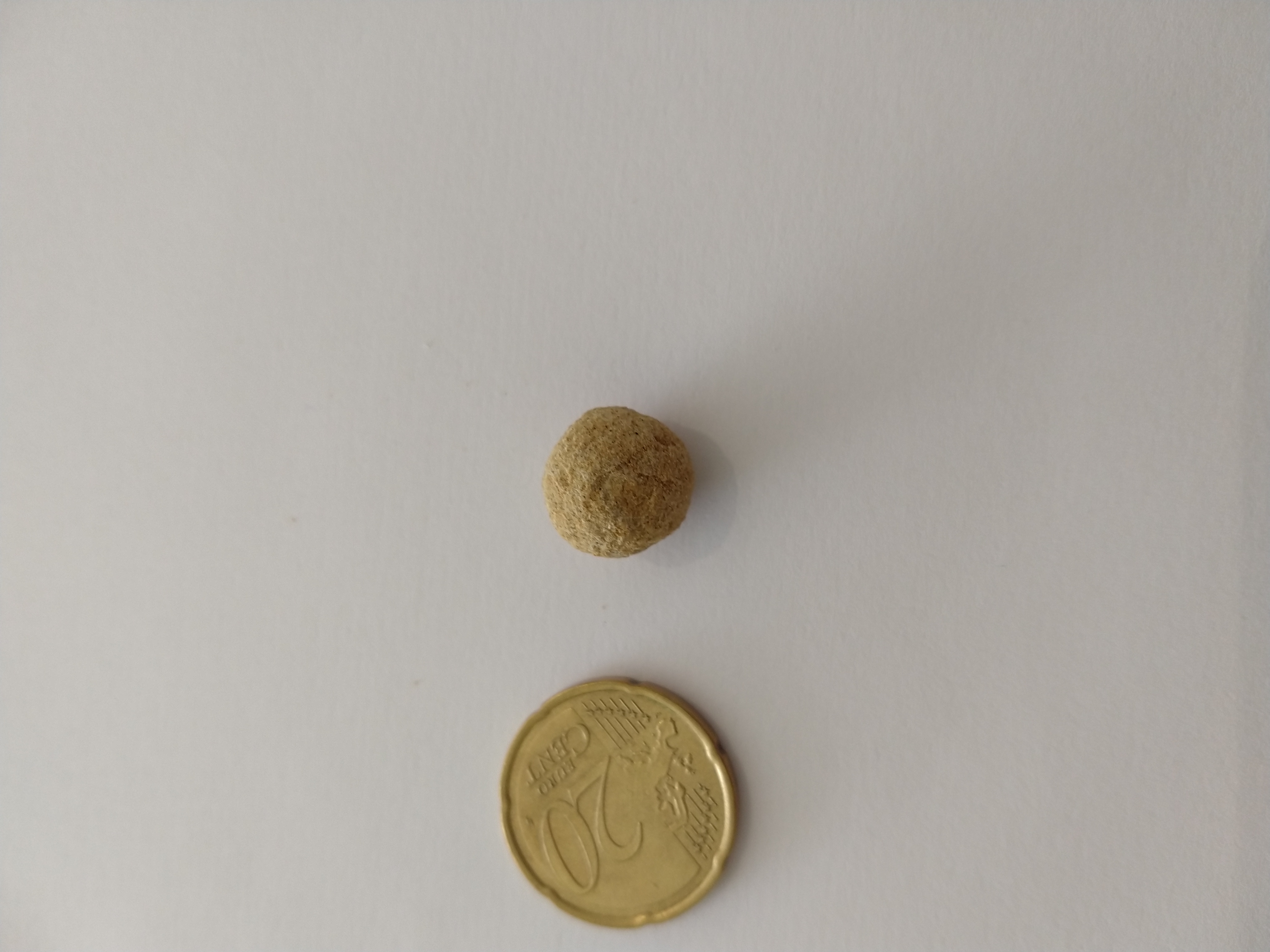 1) Deze steen had een vreemde vorm. Wij dachten dat hier misschien wel een fossiel kon inzitten. Toen ik deze thuis heb opengeslagen met een hamer zat er een versteend balletje in deze steen? Wij hebben deze steen gevonden langs een mergelklif. (Foto 1 & 2)