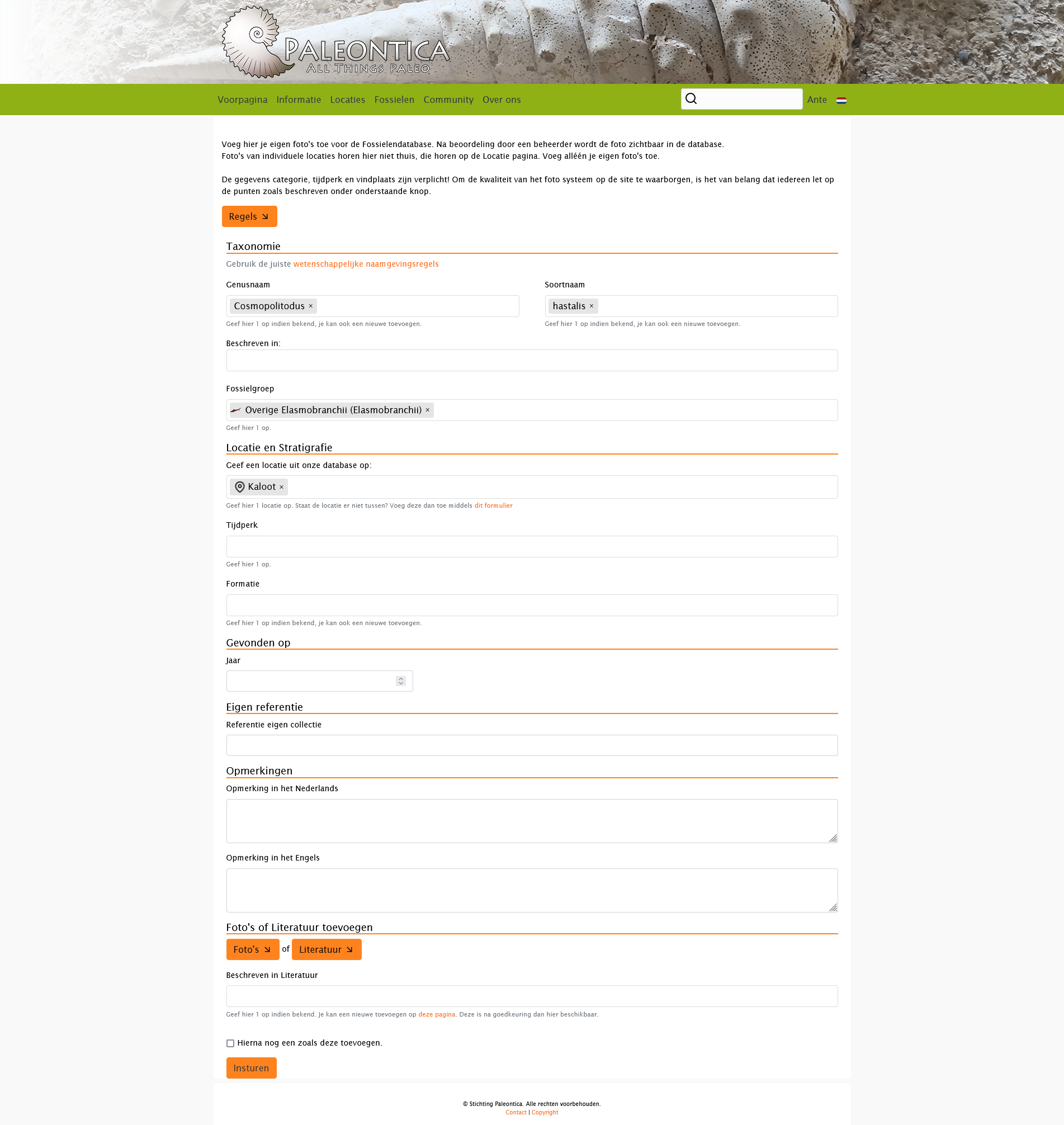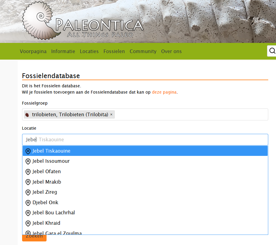Na de overgang naar de nieuwe versie zal de voorpagina er als volgt uit zien: Ook het zoeken van locaties is wat visueler gemaakt. We hebben een mooie kaart met pinnetjes waarop je kan klikken en daaronder een lijst met alle resultaten gesorteerd op type Het zoeken van fossielen is ook makkelijker gemaakt. Overal over de site zul je zulke dropdown-menutjes vinden die verschijnen als je iets begint te typen. Dit helpt jou de juiste te vinden en ons om de database consistent te houden. Het toevoegen van fossielen werkt net zo. Waarbij eventuele extra velden verschijnen indien ze nodig zijn.