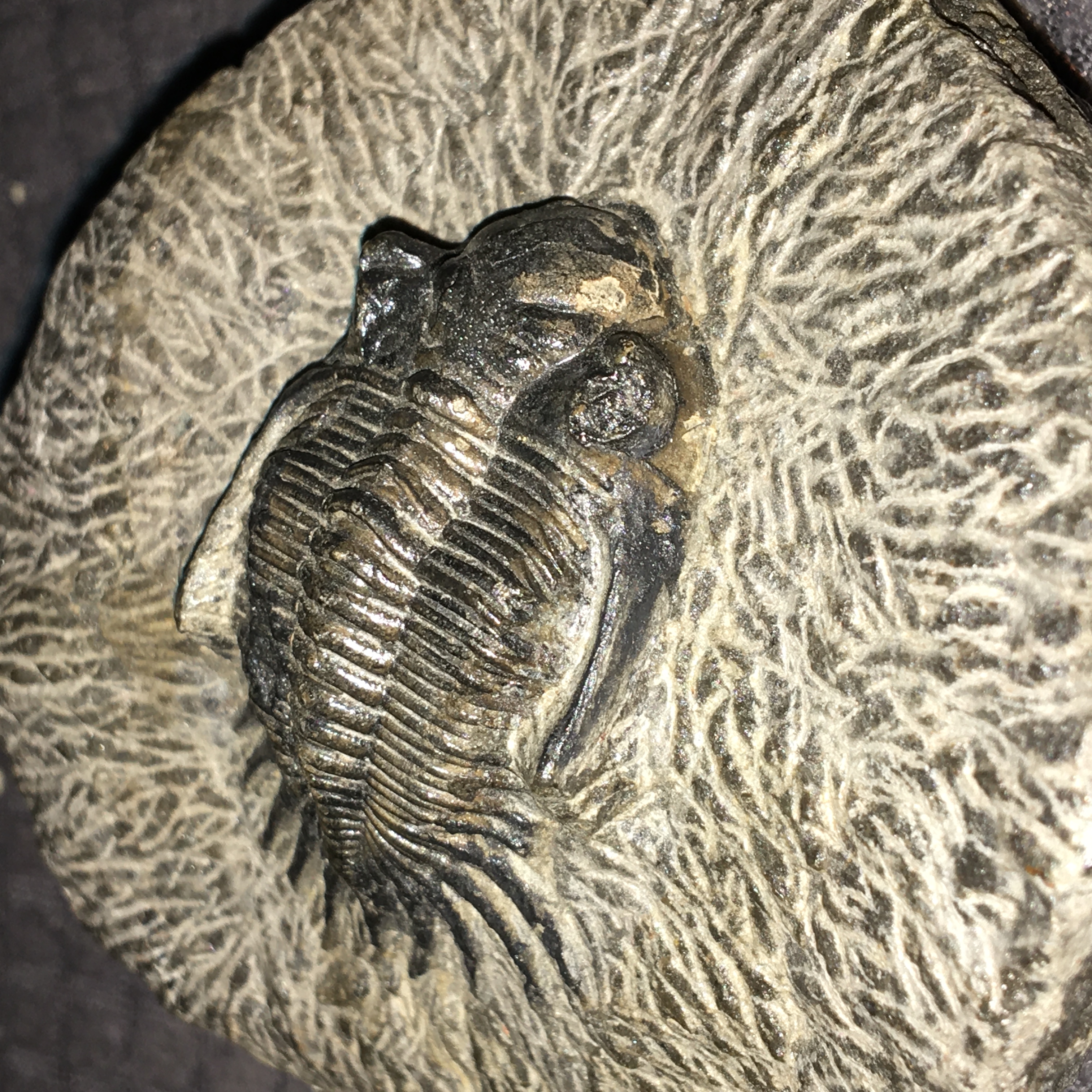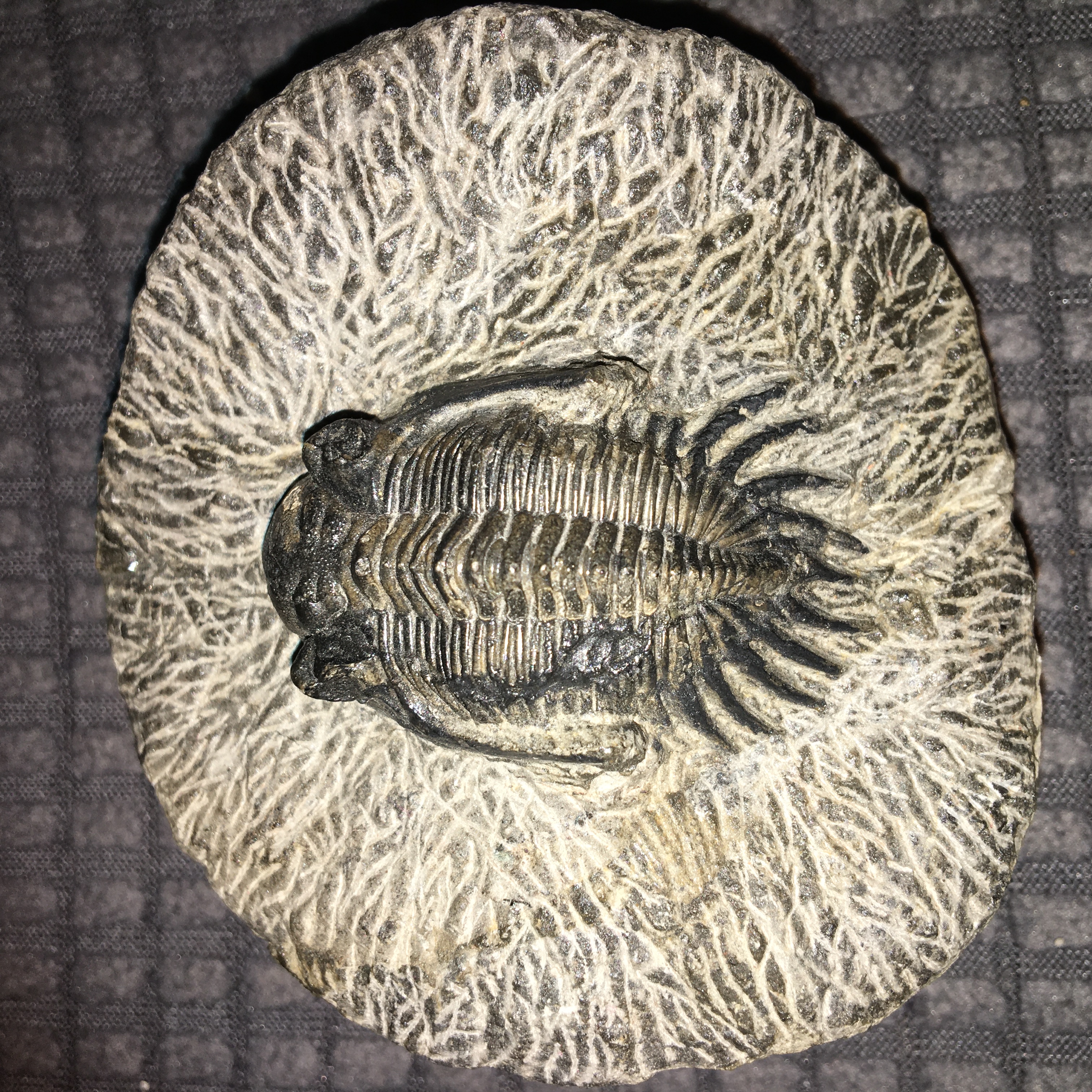 Ik heb deze trilobiet gekocht op de beurs van ACAM afgelopen weekend, maar er stond niet bij welke soort deze is. Zouden jullie kunnen helpen met het identificeren van mijn fossiel, mij lult het niet goed.
