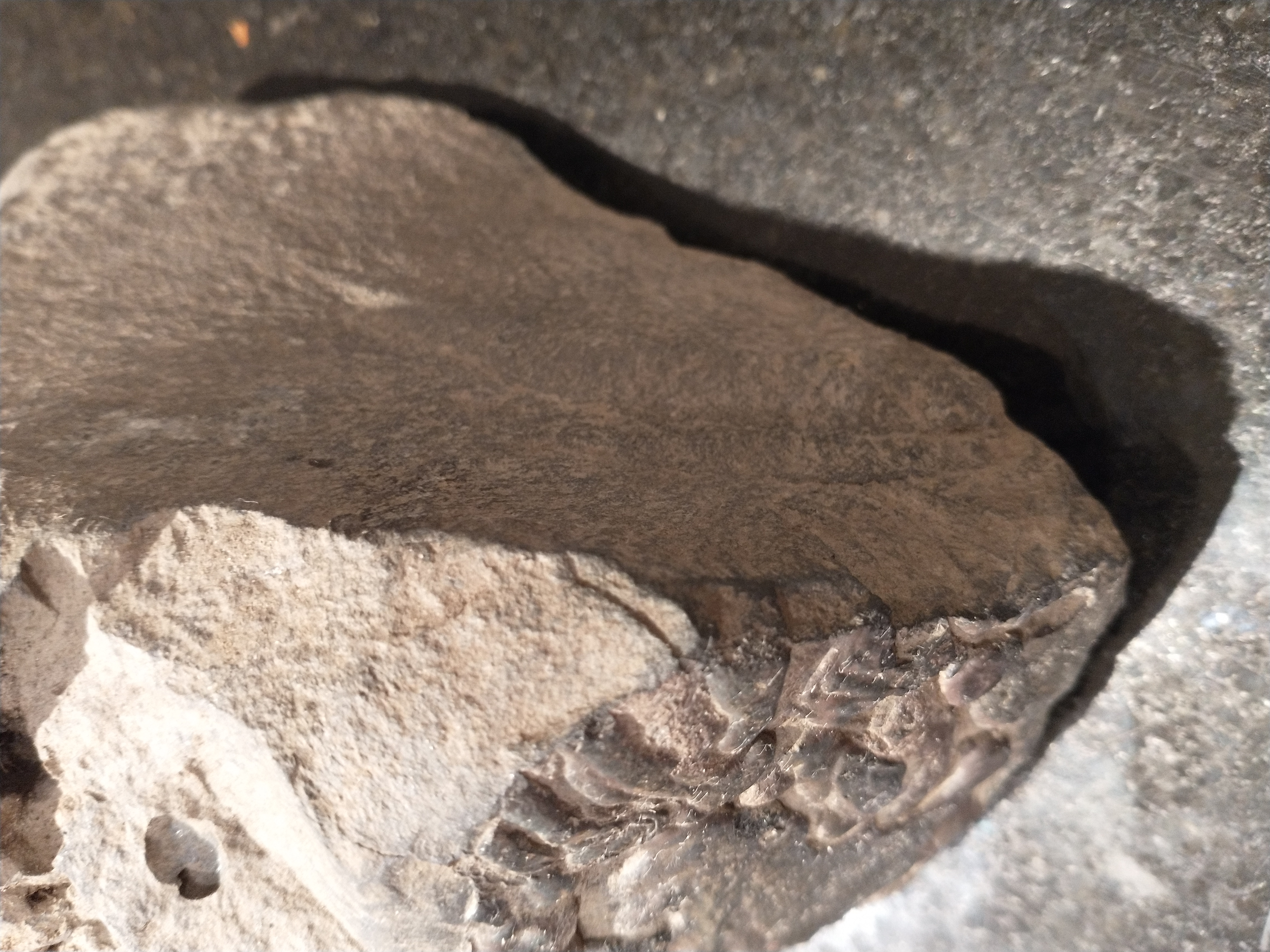 Net gevonden aan de oever van oude waterloop, ongeveer 20-30 cm onder de grond. De steen, vrij groot en zwaar, is overal magnetisch. Langs 1 kant bevat het een stuk wat lijkt op gesmolten metaal. Alsof het er over gegoten is... alhoewel het ook deel van de steen zelf lijkt. Moeilijk te zien. In de groeven soms kleine zwarte en blinkende steentjes, ook magnetisch.