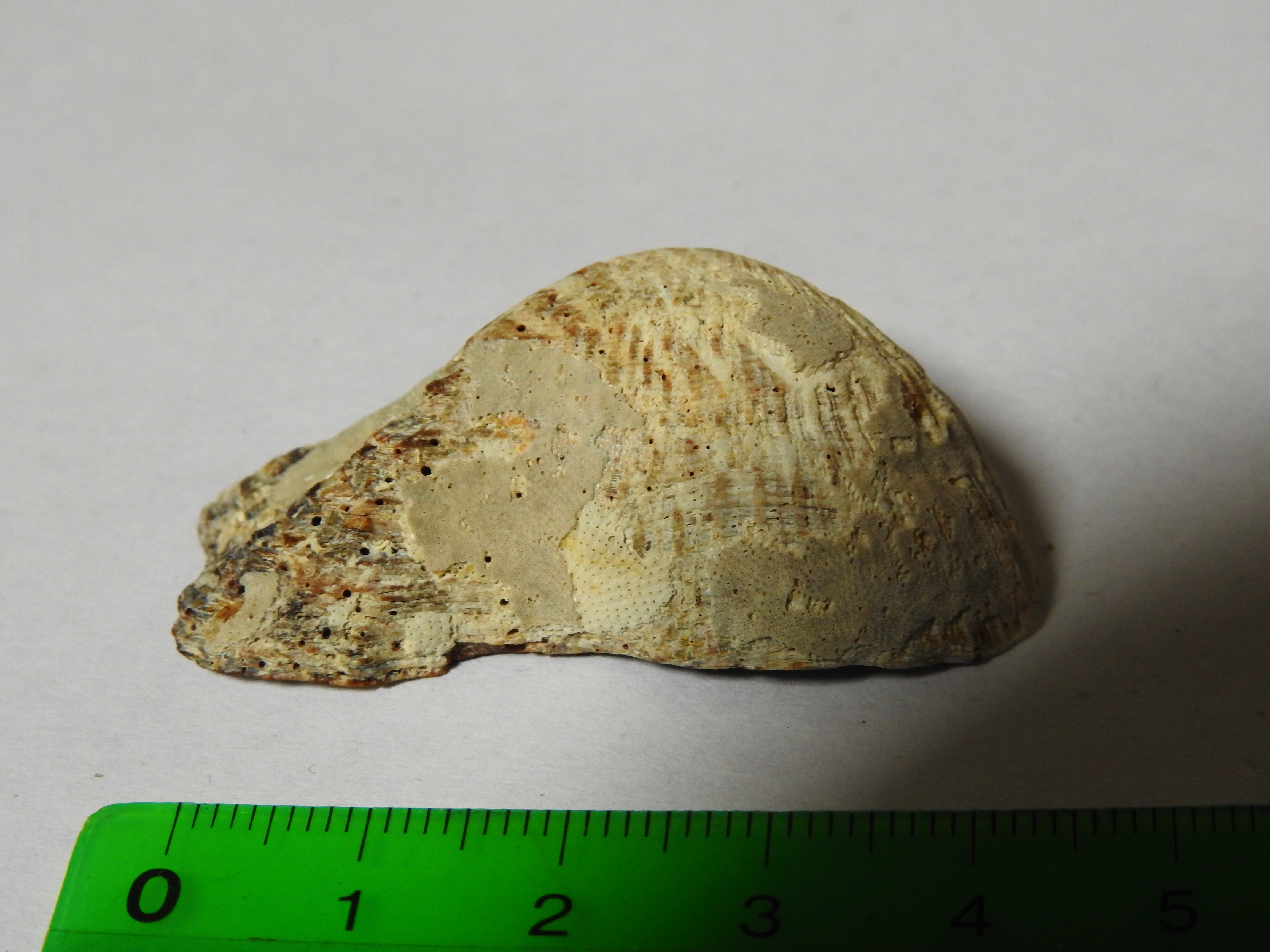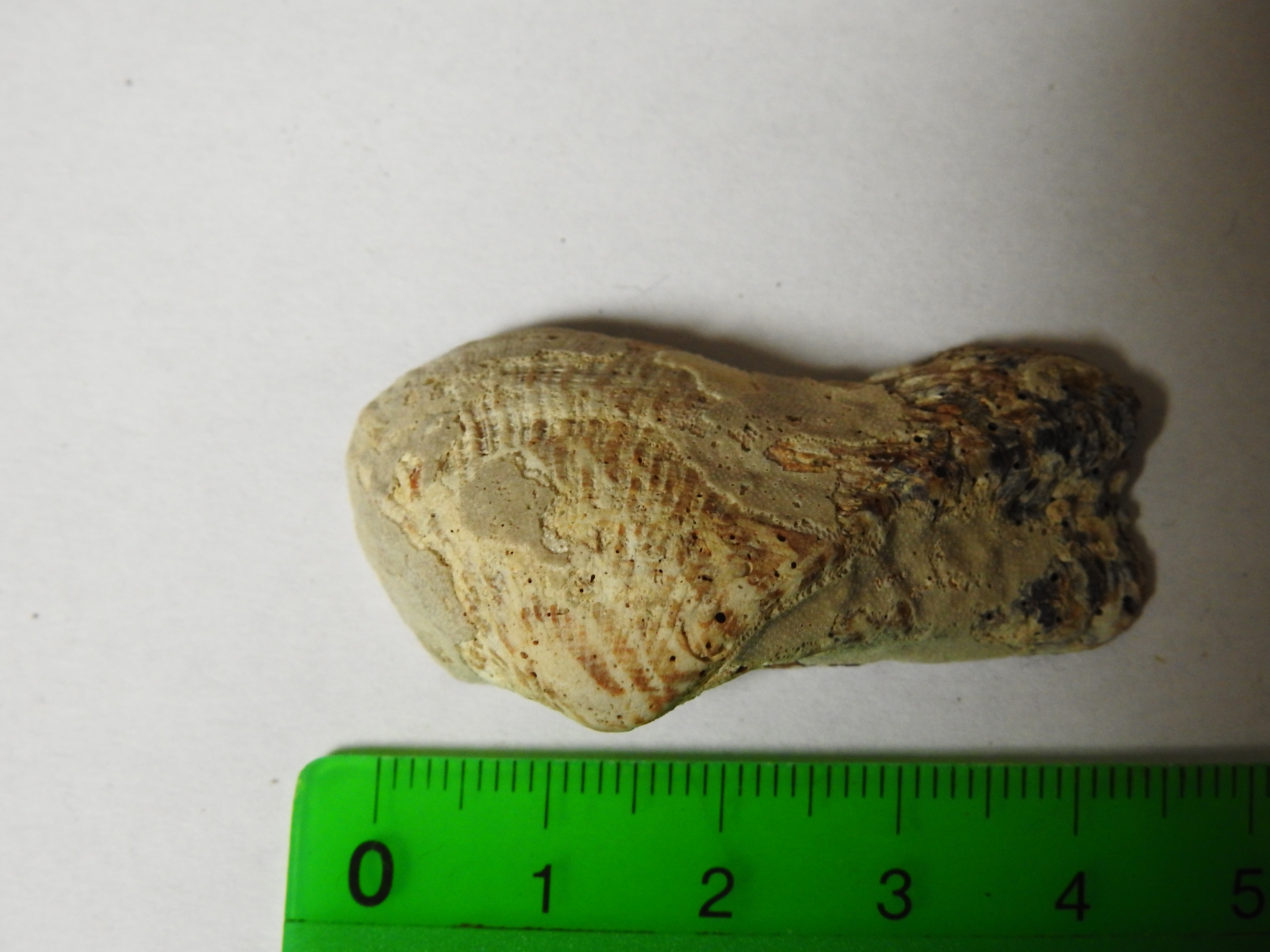 Op het eerste gezicht zien deze schelpen er niet fossiel uit. De bovenste is overgroeid door meerdere generaties bryozoa.