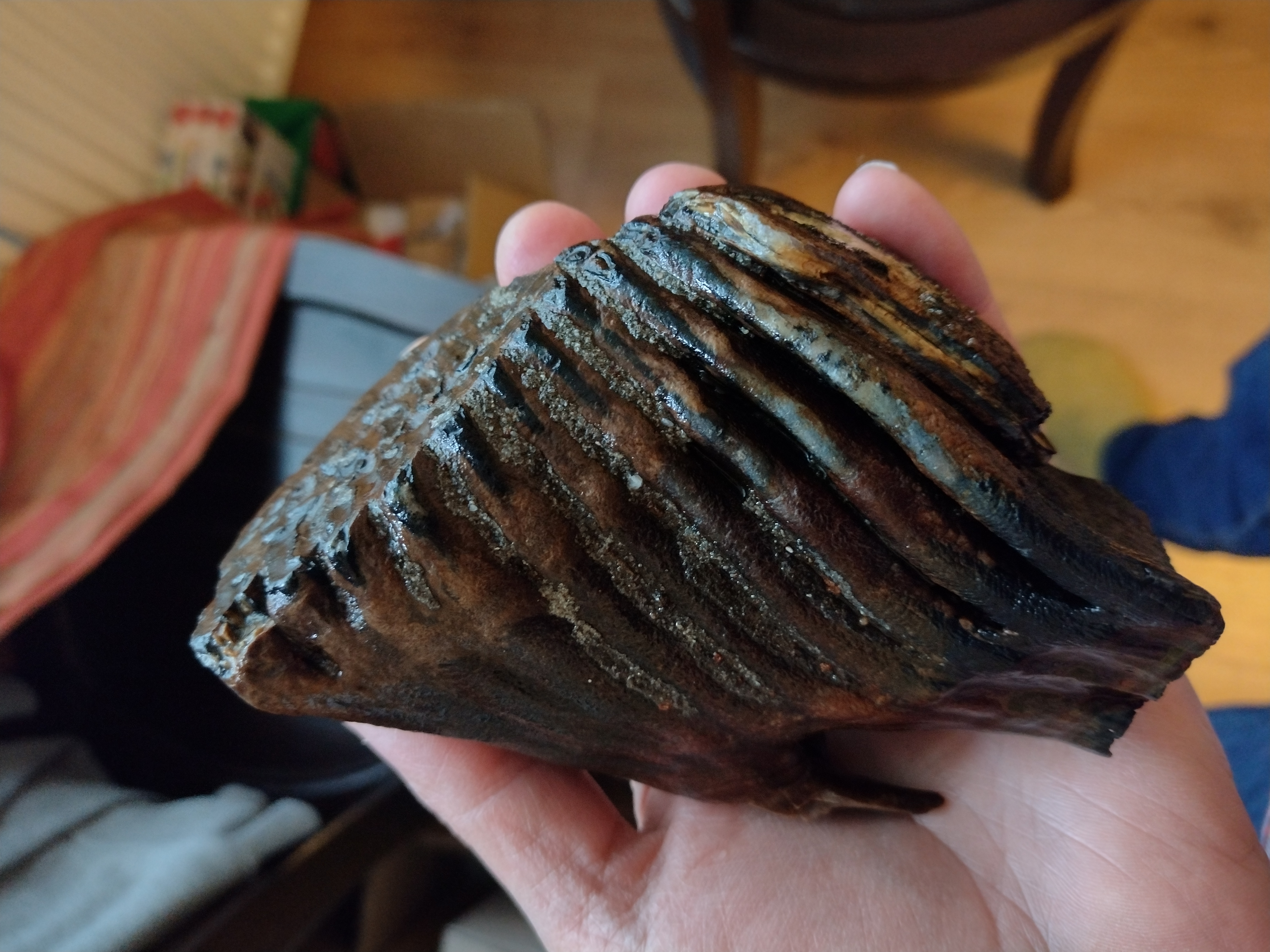 hallo allemaal, vorige week zaterdag de 15de, heb ik op de zandmotor vanuit het schelpenpad een stukje richting monster deze mooie grote fragment mammoetkies gevonden. Echter bij thuiskomst zag ik dat een stuk van de voorste wortel eraf was. het gaat om een stuk wortel "tube": onder het kauwvlak, daar zit al een beschadiging het stuk zat kennelijk al los en bij het oprapen en opbergen brak helaas een stuk van de wortel af, ik heb dat niet gemerkt helaas, maar het zat er wel! Gelukkig heb ik nog een klein stukje gevonden. Ook mis ik het achterste gedeelte van de mammoetkies maar dat was al bij het oprapen al zo. De kies is zo al mooi en ik ben er blij mee, maar onder het motto van nooit geschoten is altijd mis:)