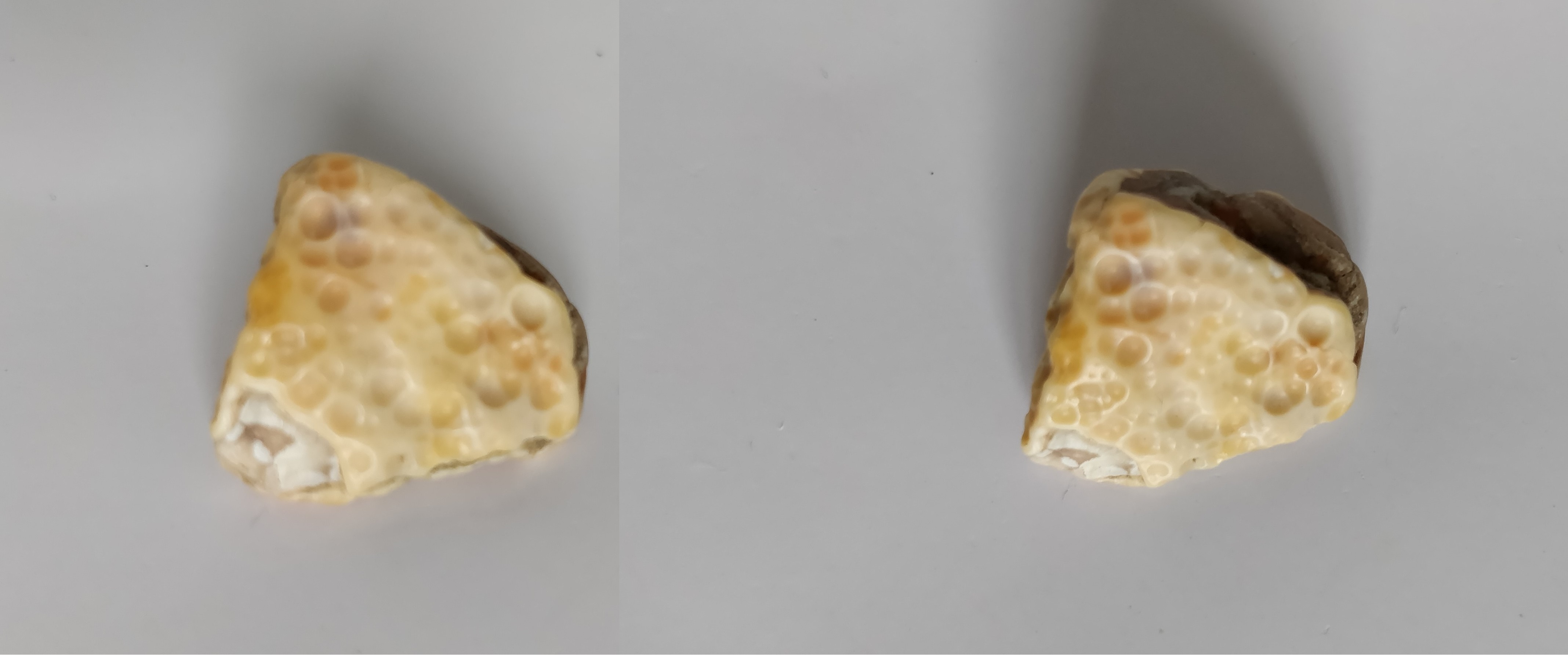 De eerste is een afdruk van een crinoïde, opgerold, gevonden in de omgeving van Givet. De tweede is een zeeëgeltje (Hemicidaris sp.). De derde is nog een vraagteken, maar vind ik wel een intrigerend stuk. Gevonden in een oude kalkgroeve nabij Fraillicourt. Boven-Jura, Oxforidiën (waarschijnlijk). Het stuk is in ieder geval volledig verkiezeld. Op de laatste foto's zijn wat details te zien. Mogelijk een spons? Op internet heb ik nog geen match kunnen vinden.