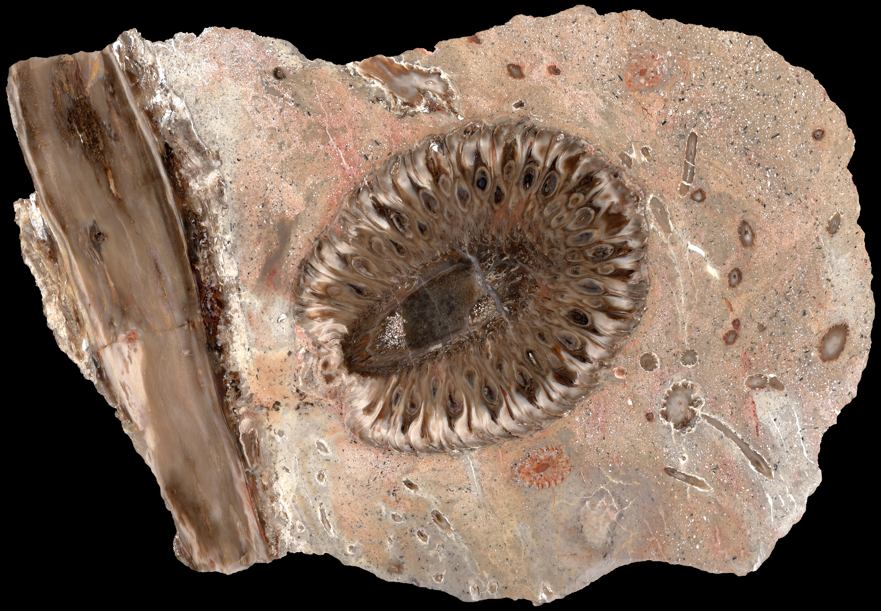 Araucaria mirabilis (Spegazzini) Calder 1953 zaadkegel uit het Jura (Bathonien-Oxfordien) van het "Cerro Cuadrado Petrified Forest" in Santa Cruz, Argentiniƫ. Vrij ongebruikelijk aan dit stuk is dat de kegel nog in de matrix ingekapseld zat tijdens het doorslijpen. Links is een eveneens in de lengte doorgezaagde tak te zien. Verder zit de matrix vol met verschillende aansnedes van kleinere twijgjes.