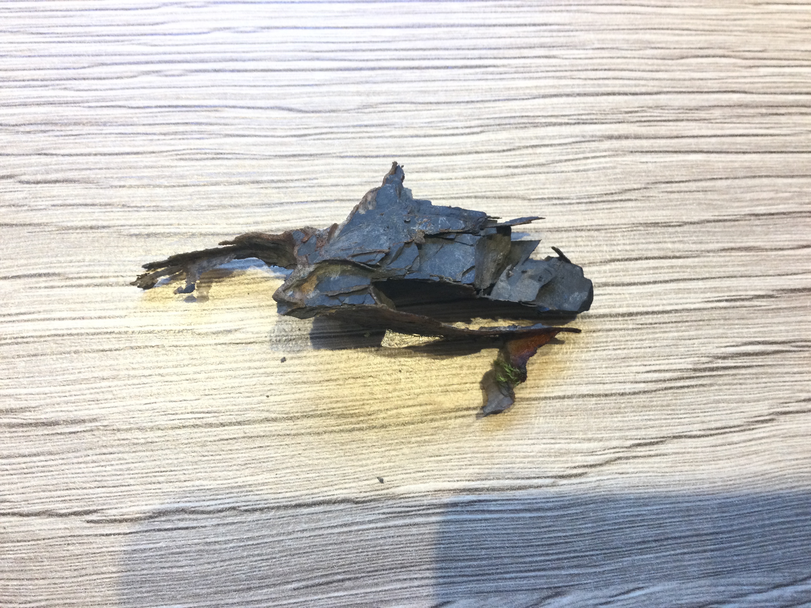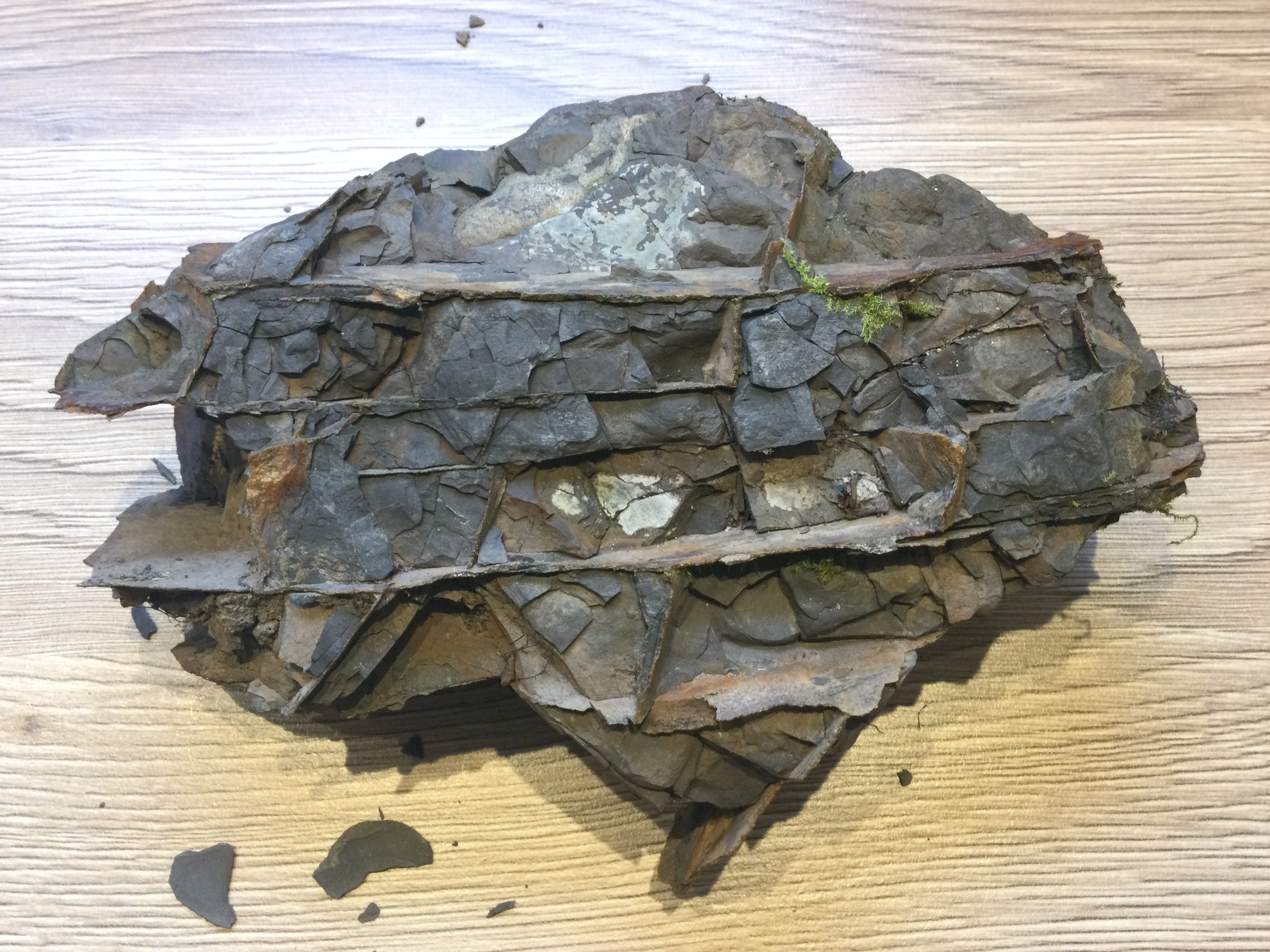 Een steen in laagjes die snel verbrokkelt. Maar tussen die groeven zit een vulling van iets. Geen steen, het is een beetje soepel. Ik dacht eerst iets van vloeibaar plastic dat erdoor gelopen is, maar de kleur is erg organisch.
