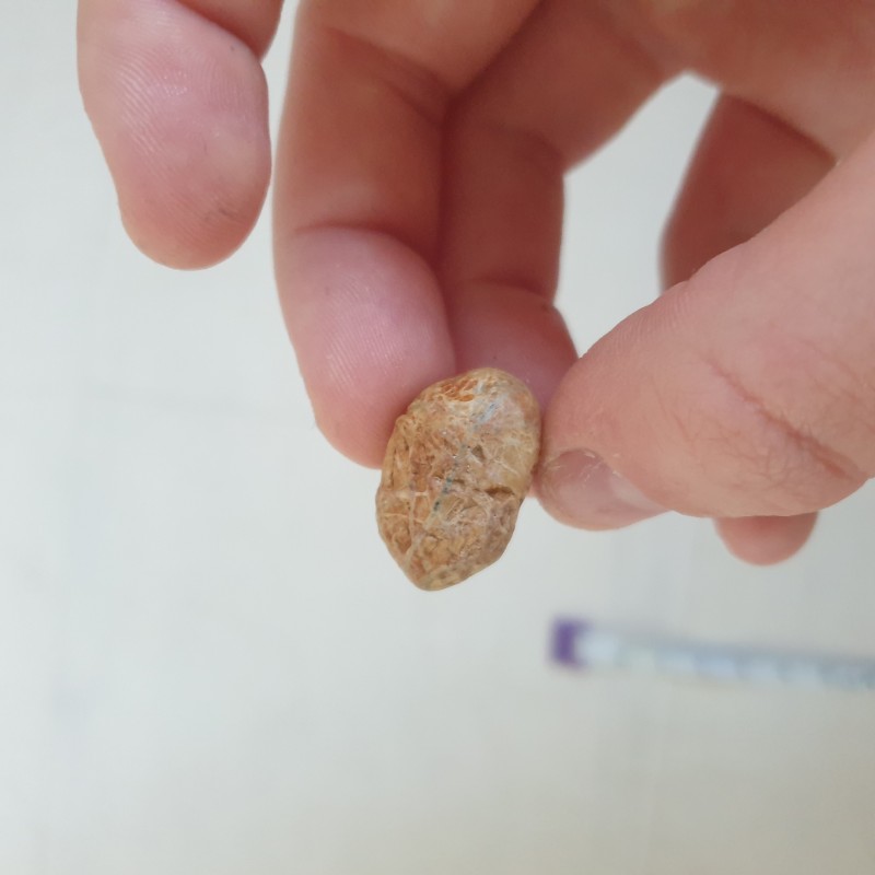 Het is ongeveer zo groot als doppinda. Het is hard. Voelt als steen/ijzer. Voelt ook koud aan. Het is niet magnetisch.