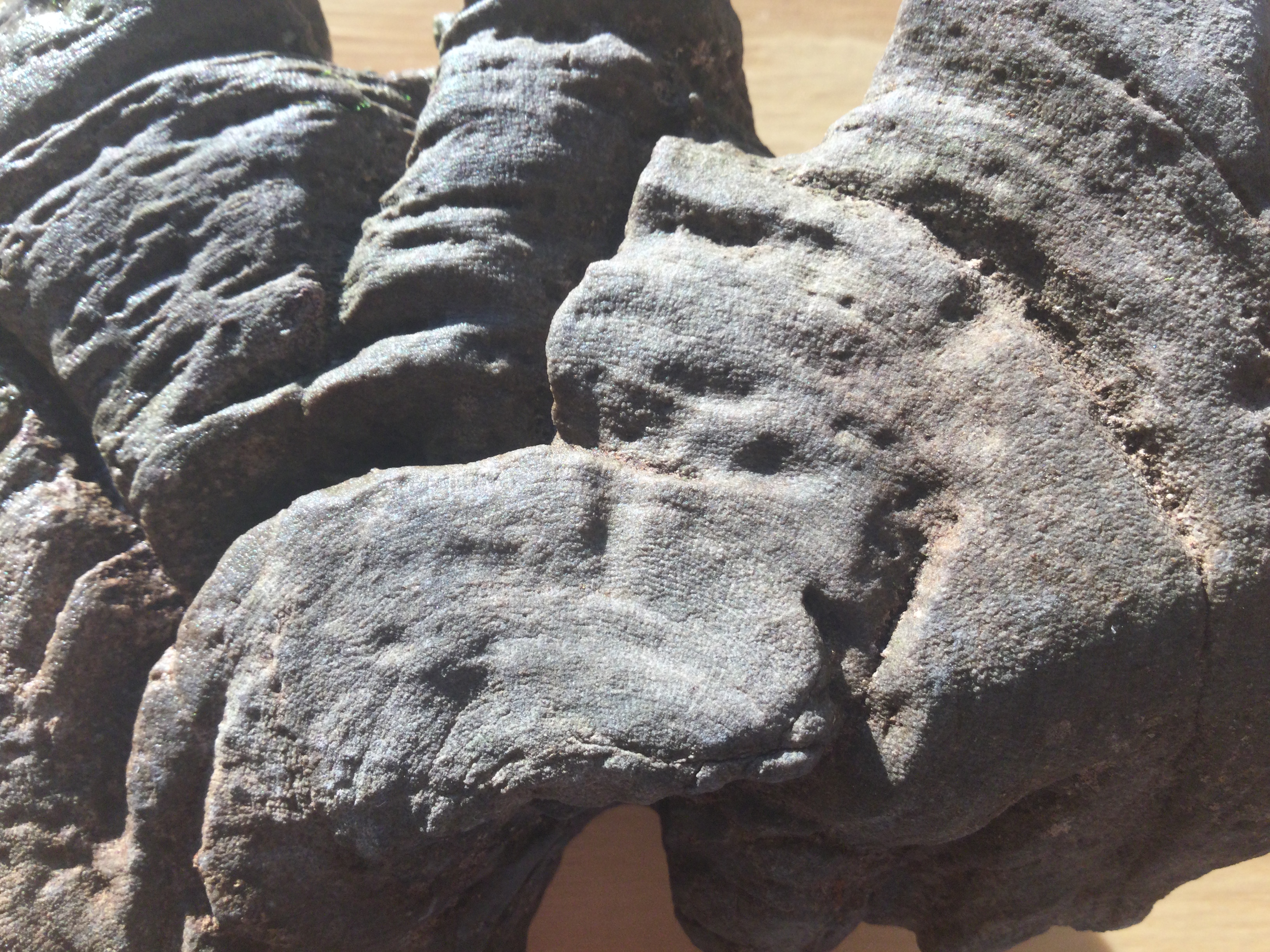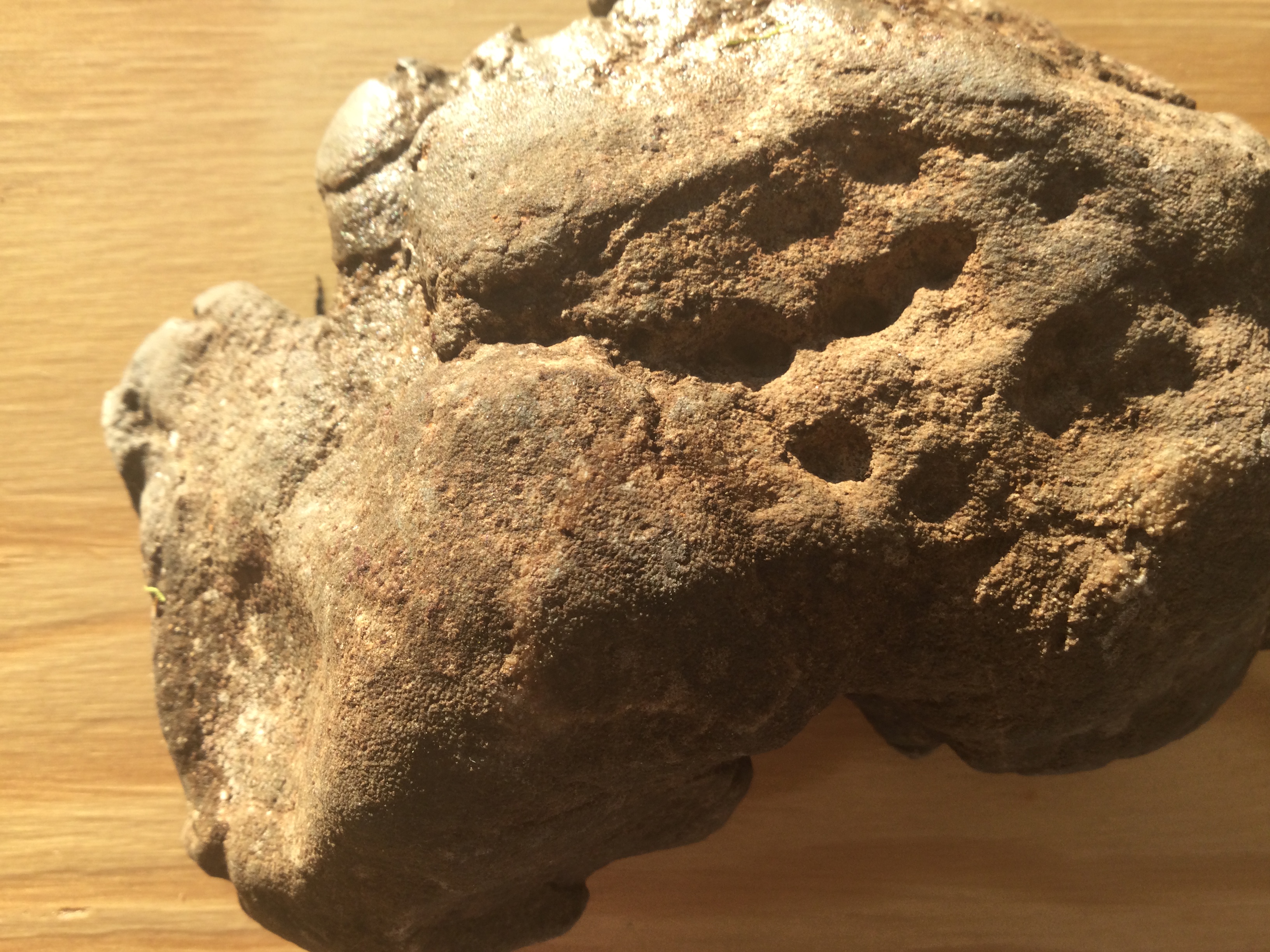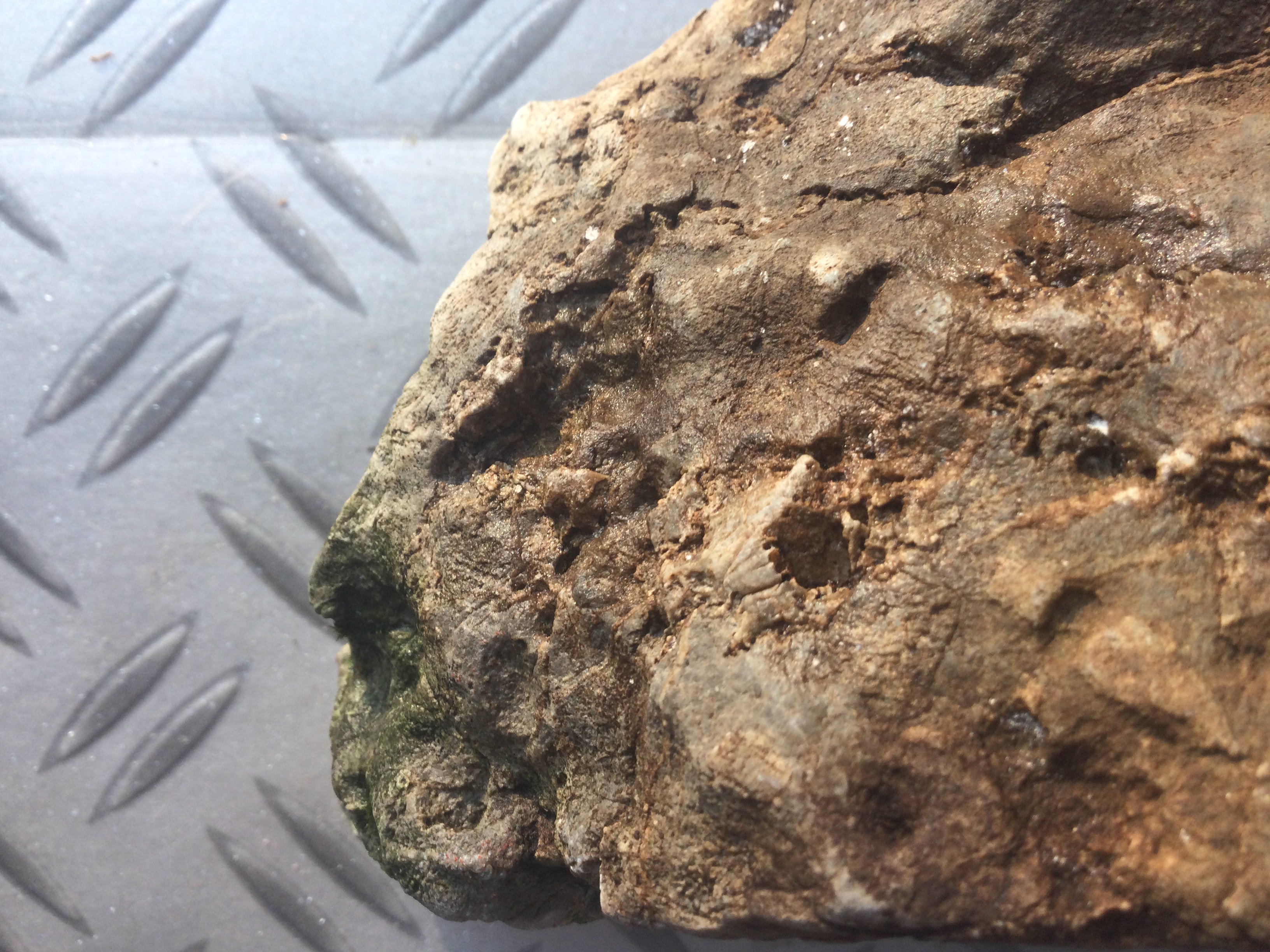 Daar vonden we deze vreemde stenen, fossielen,…? Eerst lijkt dat steen, dan hout en dan misschien iets sponsachtigs? Ik zou echt niet weten wat dit is. Is er een bepaald gesteente dat zo gevormd is?
