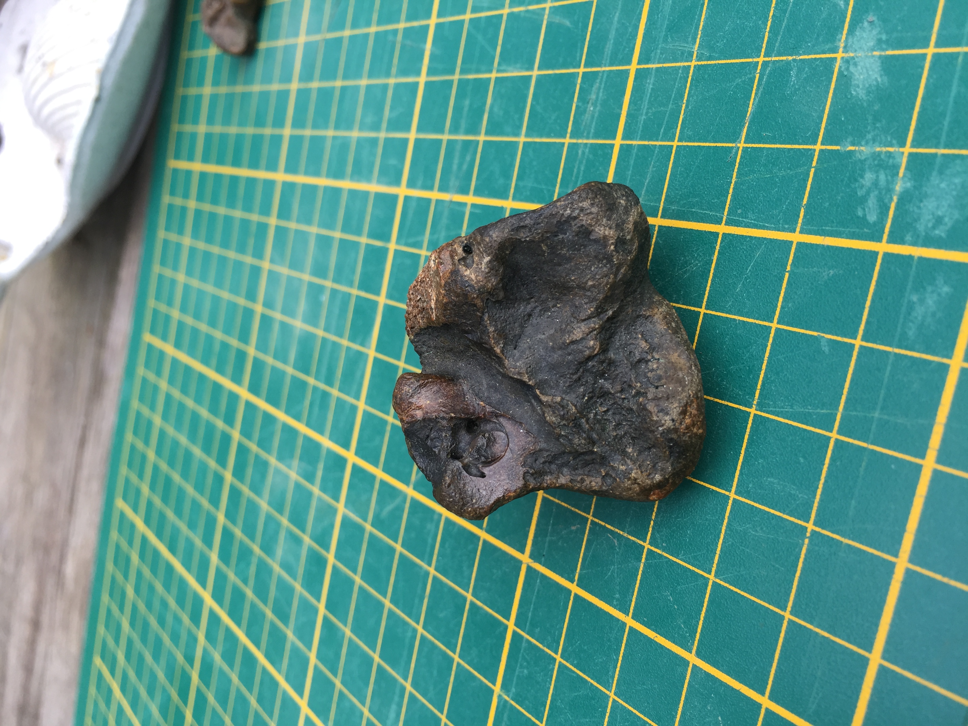 Ik heb dit bot gevonden in de omgeving Antwerpen . ik vermoed een bot met een deel van een gehoorbeen van een dolfijn eraan . maar ik weet het niet zeker