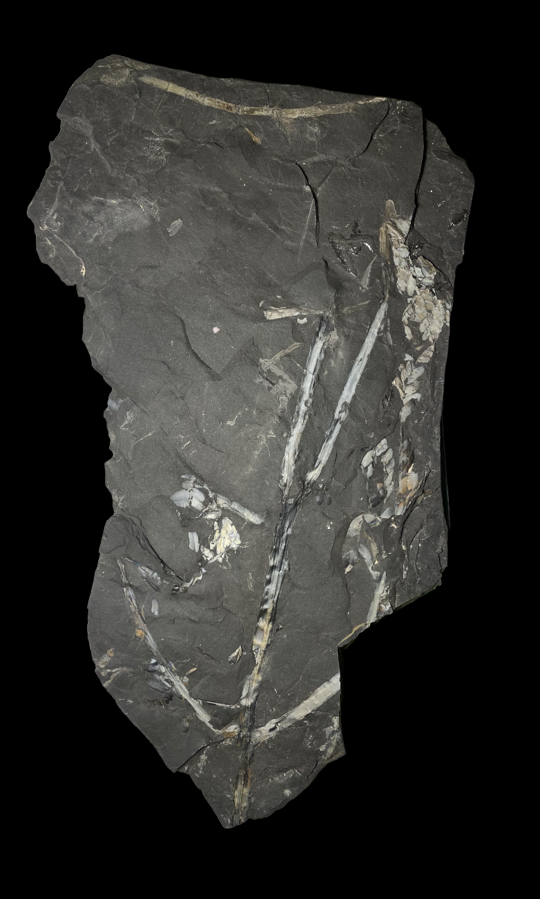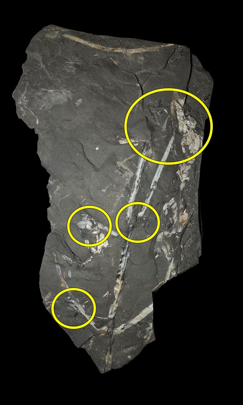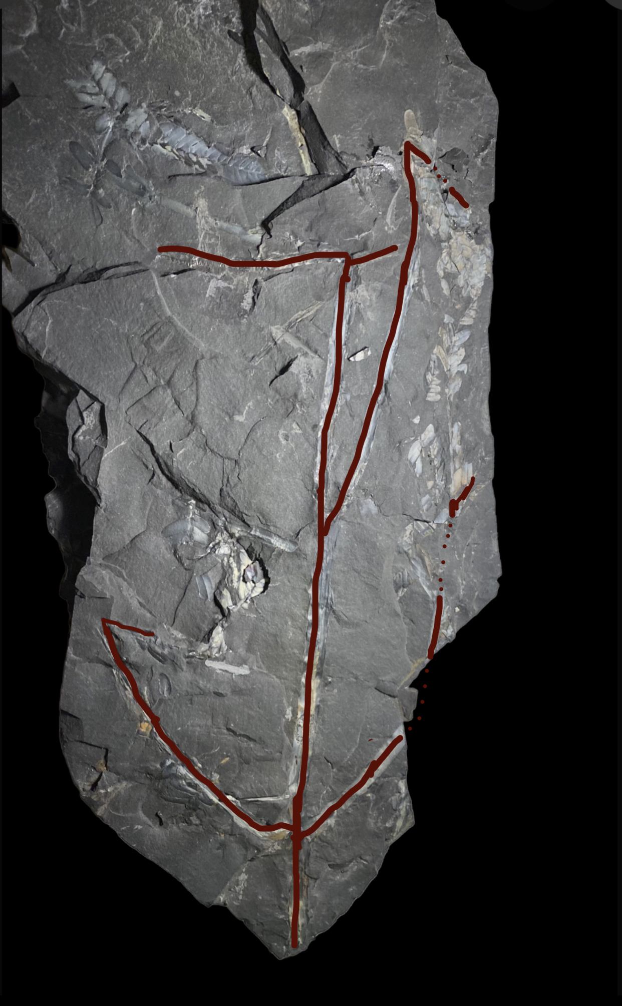 Visualisatie van wat ik nu zie.Carboon schreef: ↑23 sep 2022, 17:25 Bedankt voor de extra foto's. De pinnules die je kunt zien behoren zeker tot een neuropteride plant. Het is echter onduidelijk of deze pinnules ook in organische connectie staan met de "zich vertakkende tak". Deze tak is vrij apart, met zowel een bifurcatie als een splitsing in drieën. Dit laatste heb ik nog niet eerder in neuropteride bladvormen gezien. Kan natuurlijk zijn dat tak en pinnules niet bij elkaar horen? Sowieso een leuk stuk!