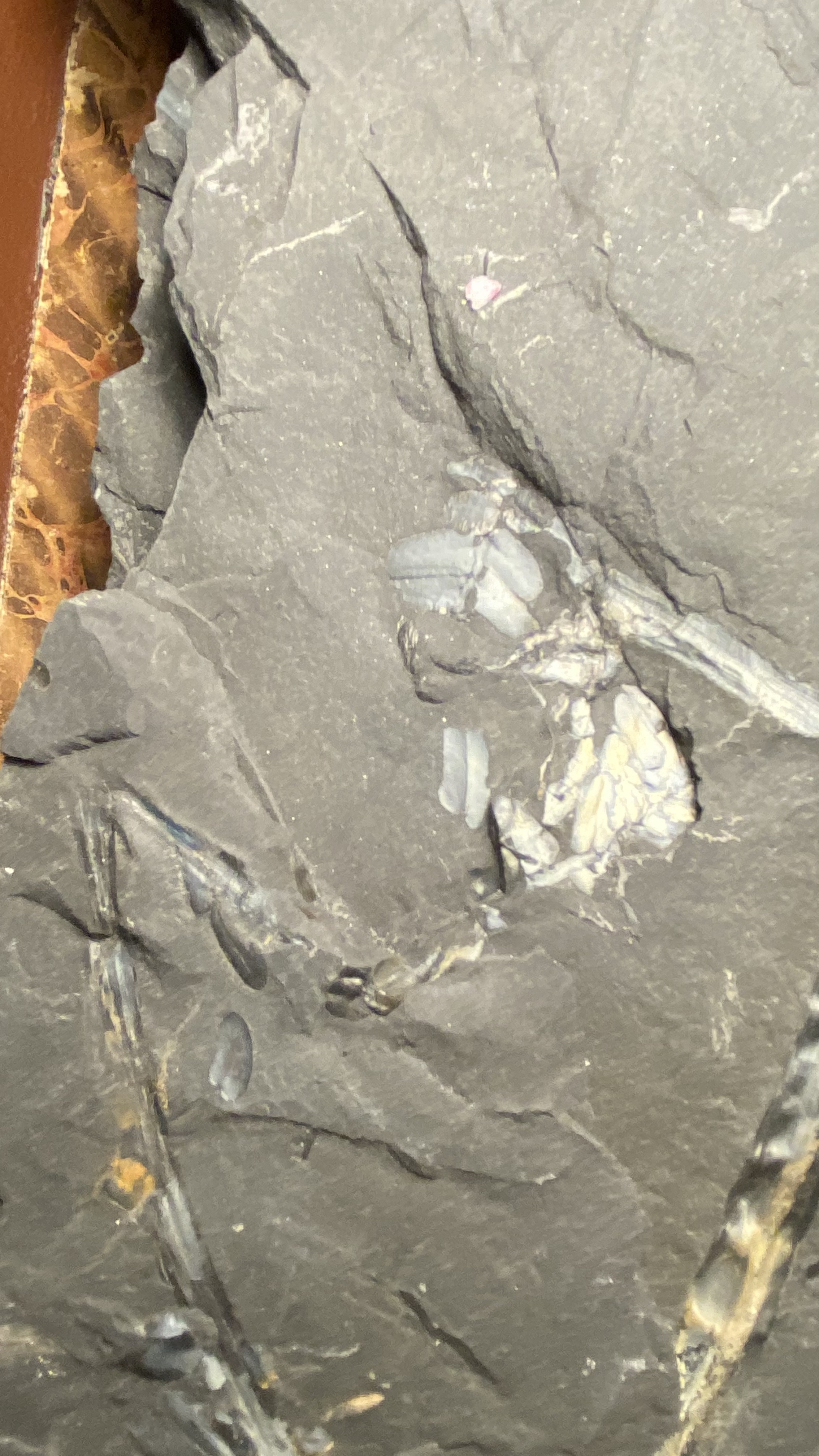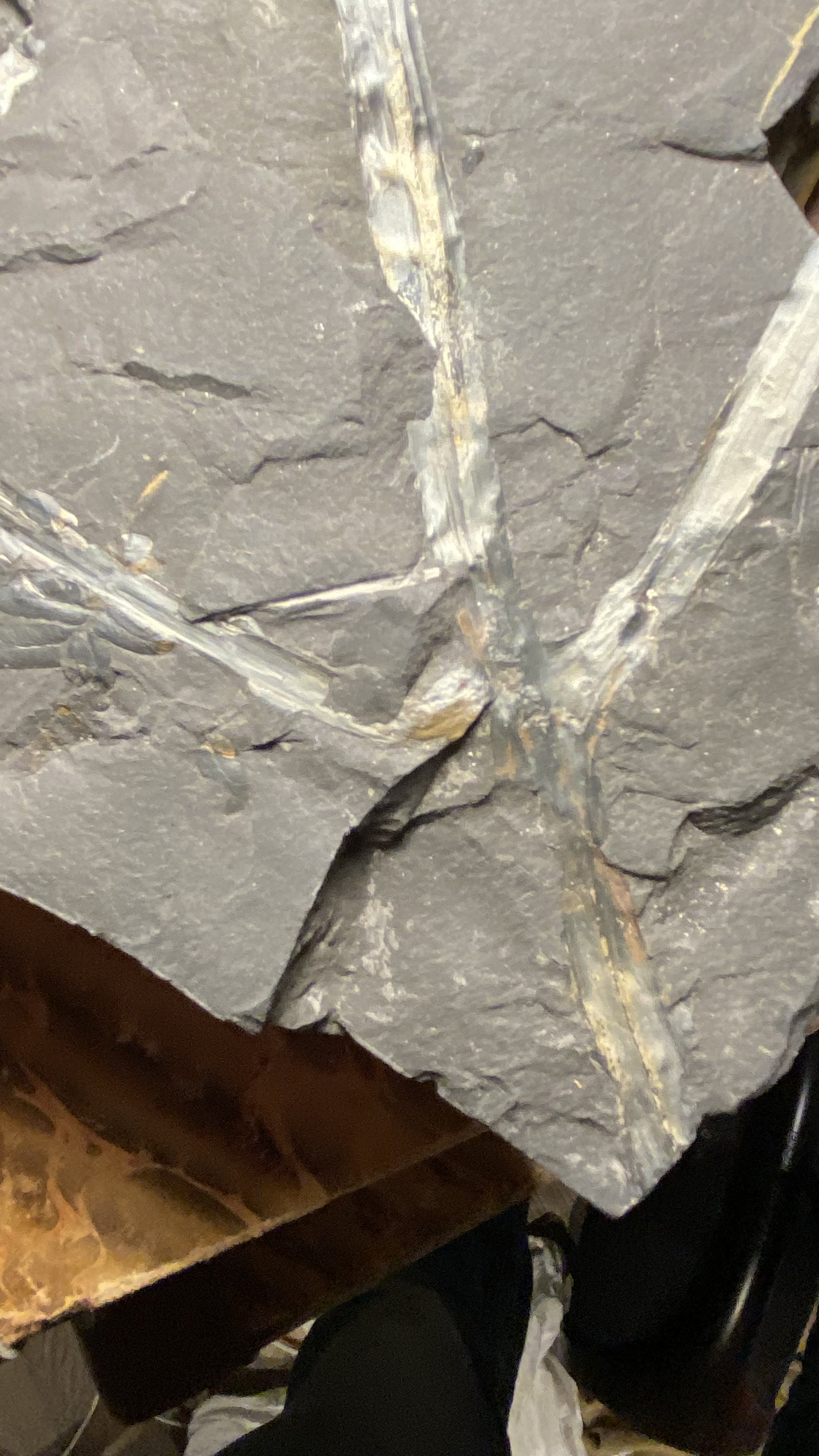 Bedankt voor de extra foto's. De pinnules die je kunt zien behoren zeker tot een neuropteride plant. Het is echter onduidelijk of deze pinnules ook in organische connectie staan met de "zich vertakkende tak". Deze tak is vrij apart, met zowel een bifurcatie als een splitsing in drieën. Dit laatste heb ik nog niet eerder in neuropteride bladvormen gezien. Kan natuurlijk zijn dat tak en pinnules niet bij elkaar horen? Sowieso een leuk stuk!