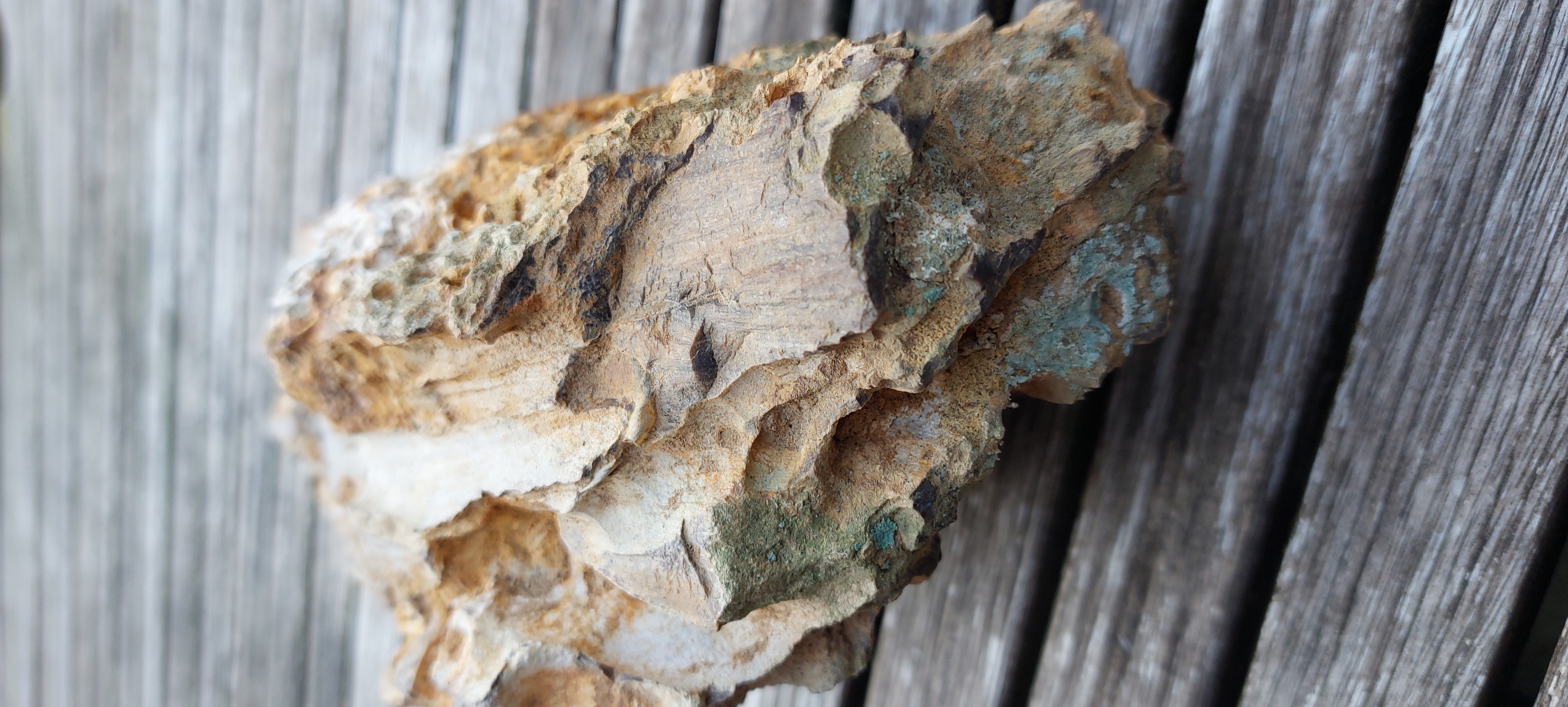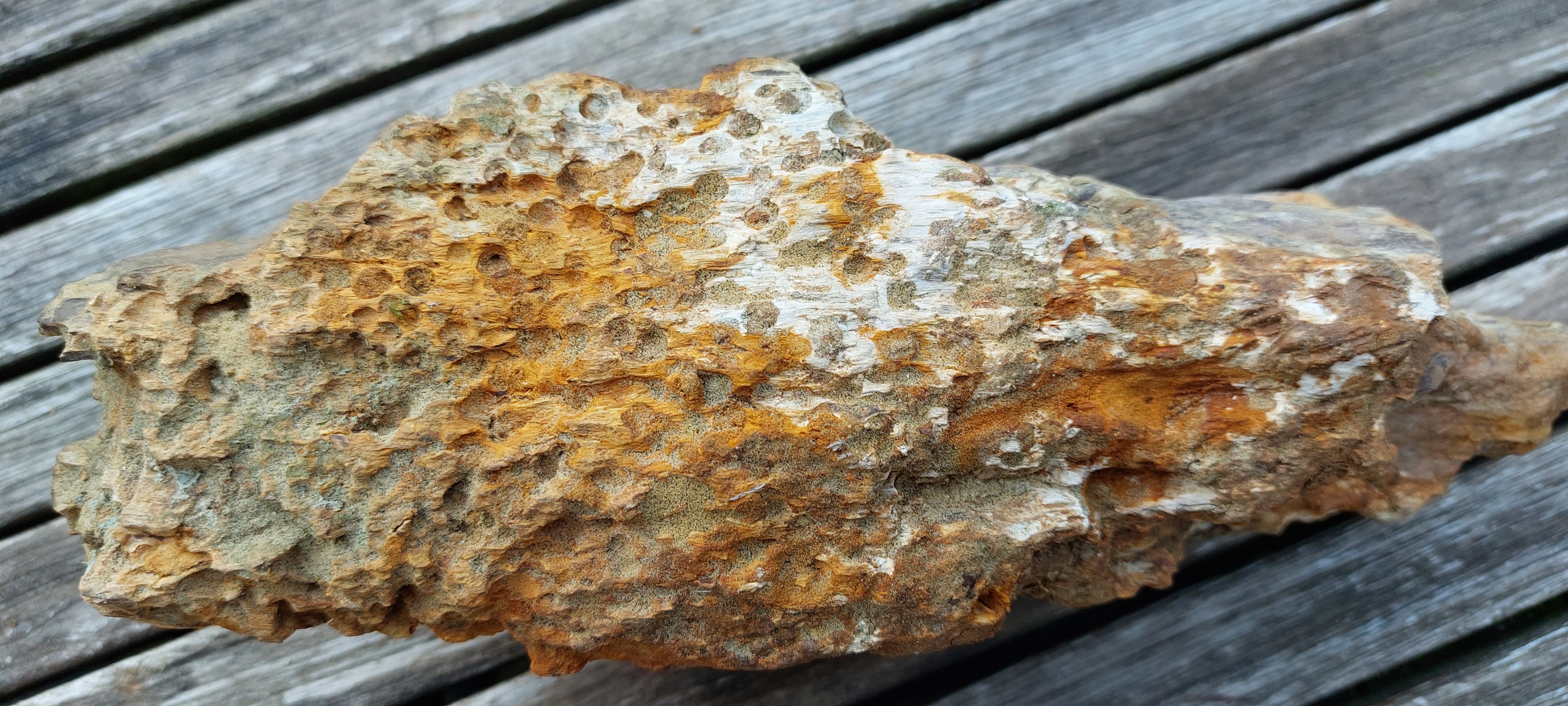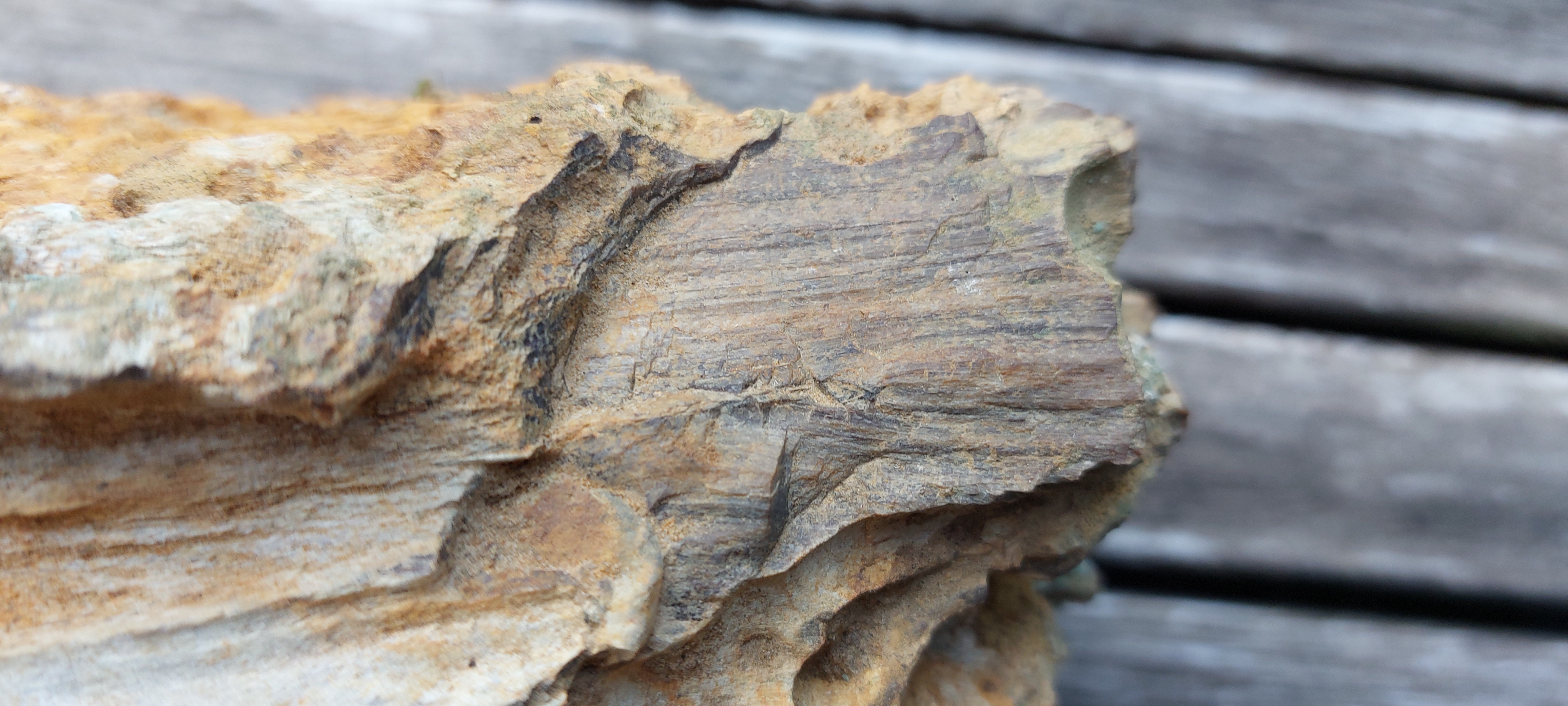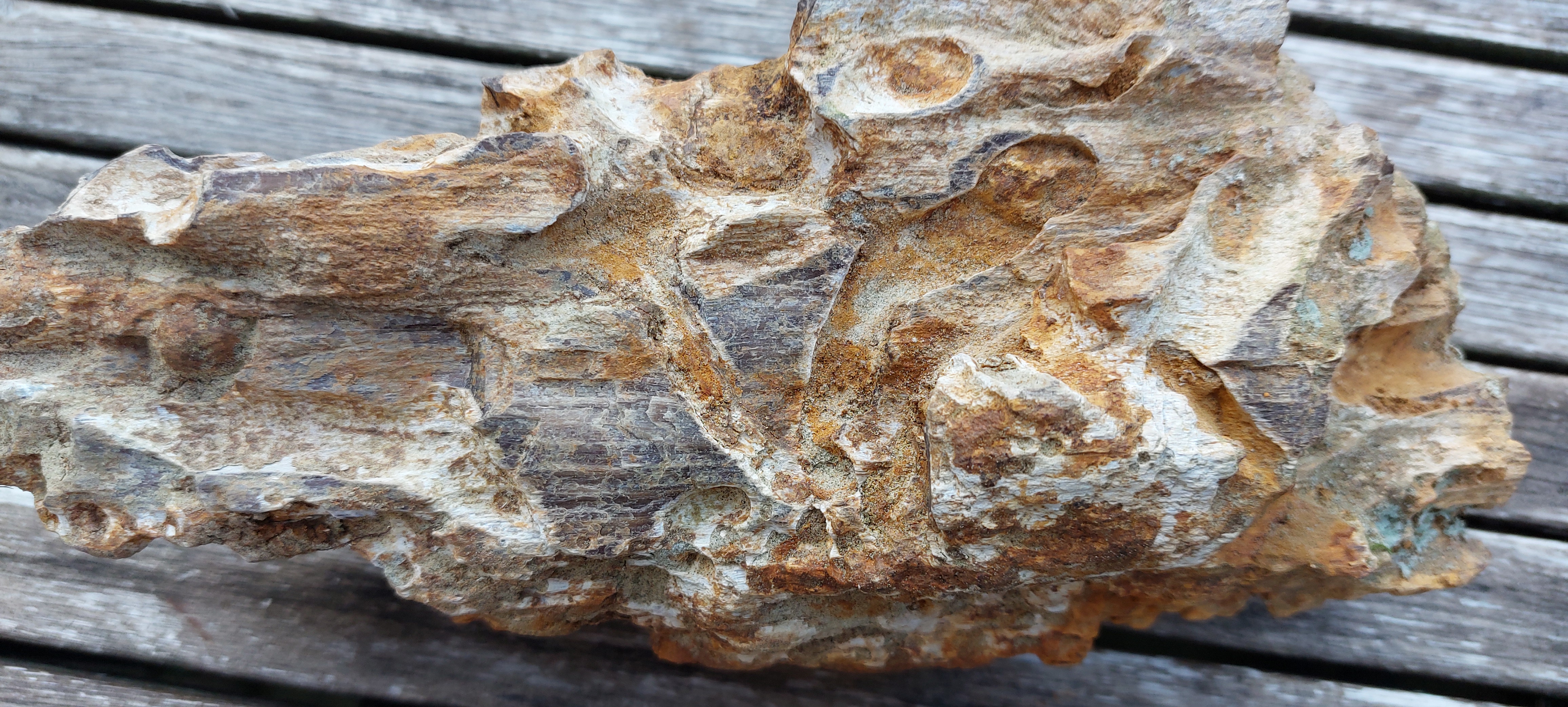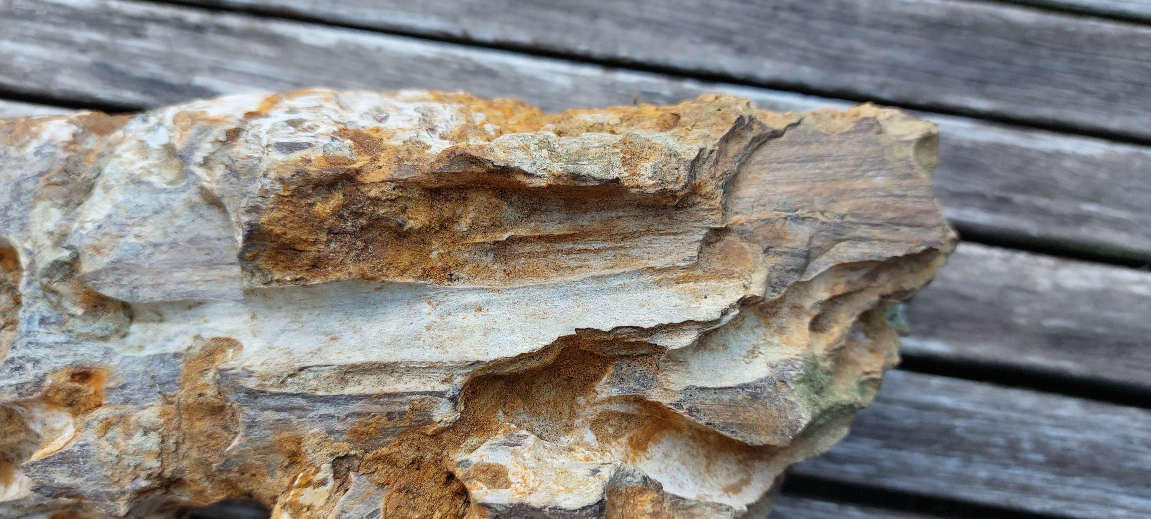 Ik ben een volslagen leek. In mijn jeugd heb ik wat fossielen gevonden en ook versteend hout maar daar blijft het wel bij. Vorige week liep ik tegen de "steen" aan op de foto's. Meegenomen omdat het een mooie steen was maar thuis had ik het idee dat er een hout structuur in zit. Er "gebeurd erg veel" in die "steen" om het zo maar te zeggen. Gevonden aan de Belgische kant van de Vaalserberg, aan de zijkant van een holle weg. Ongeveer 30 cm lang en 10 cm breed. Gewicht komt overeen met wat je van een steen van deze omvang zou verwachten. Er zit nog hrt nodige aan klei/loss aan. Wie weet wat dit is?