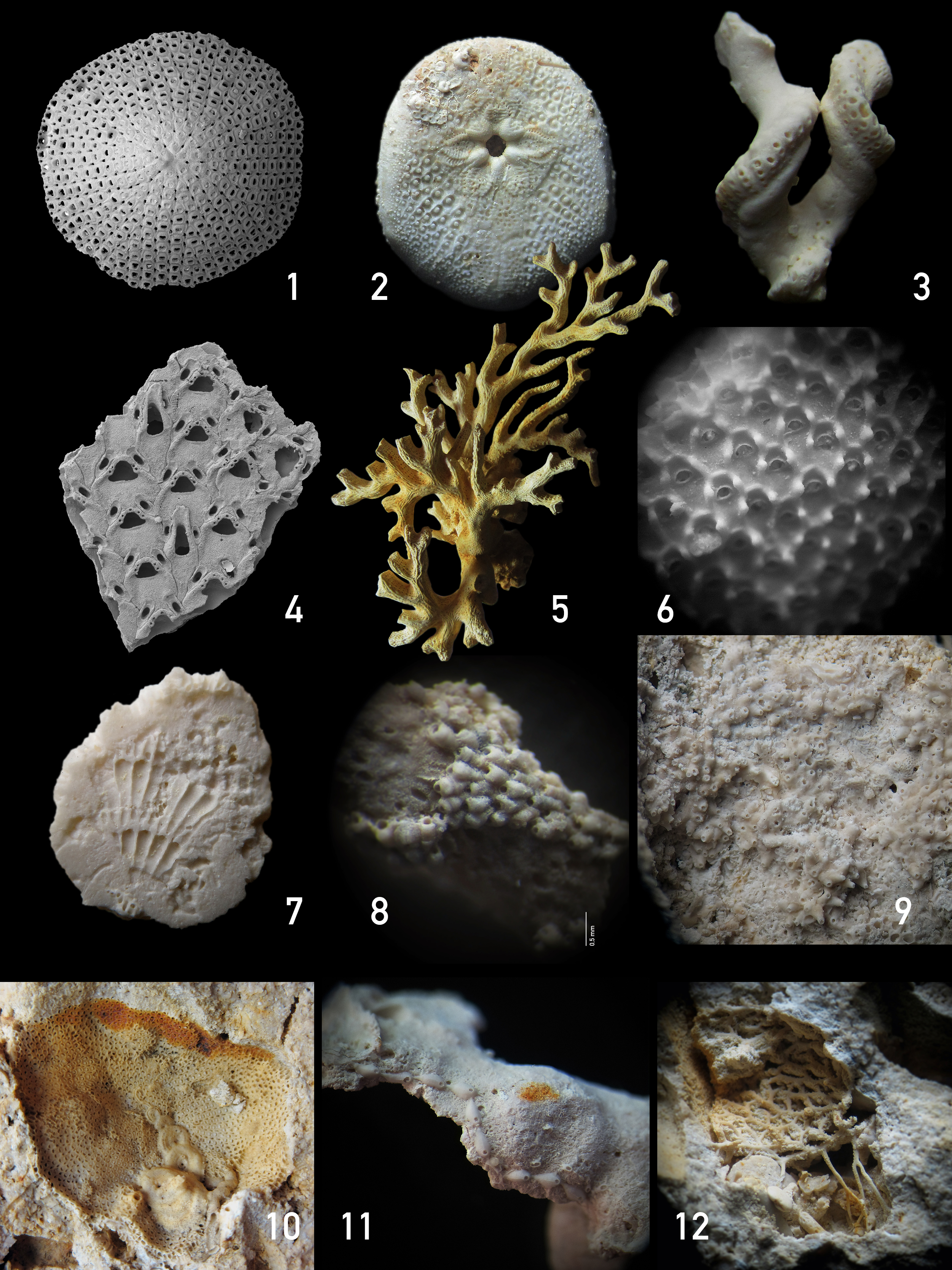Foto 6: Deze soort (Escharifora quoyiana) vormt kleine tuberkels ("knobbeltjes") rond de celrand als zij zich op zeegras vasthecht. De tuberkels beschermen de dieren tegen beschadiging. In een ander milieu worden deze tuberkels niet ontwikkeld.