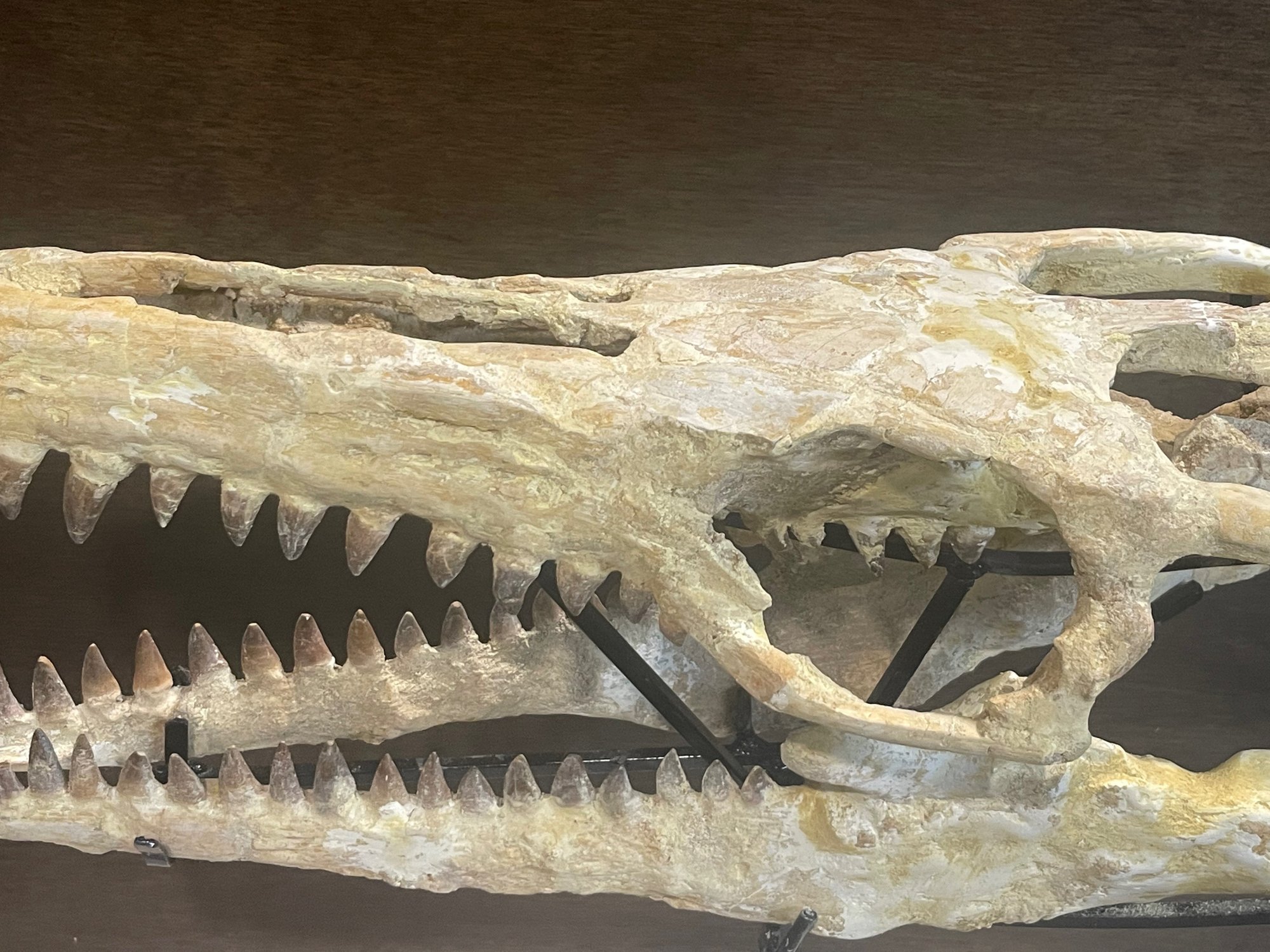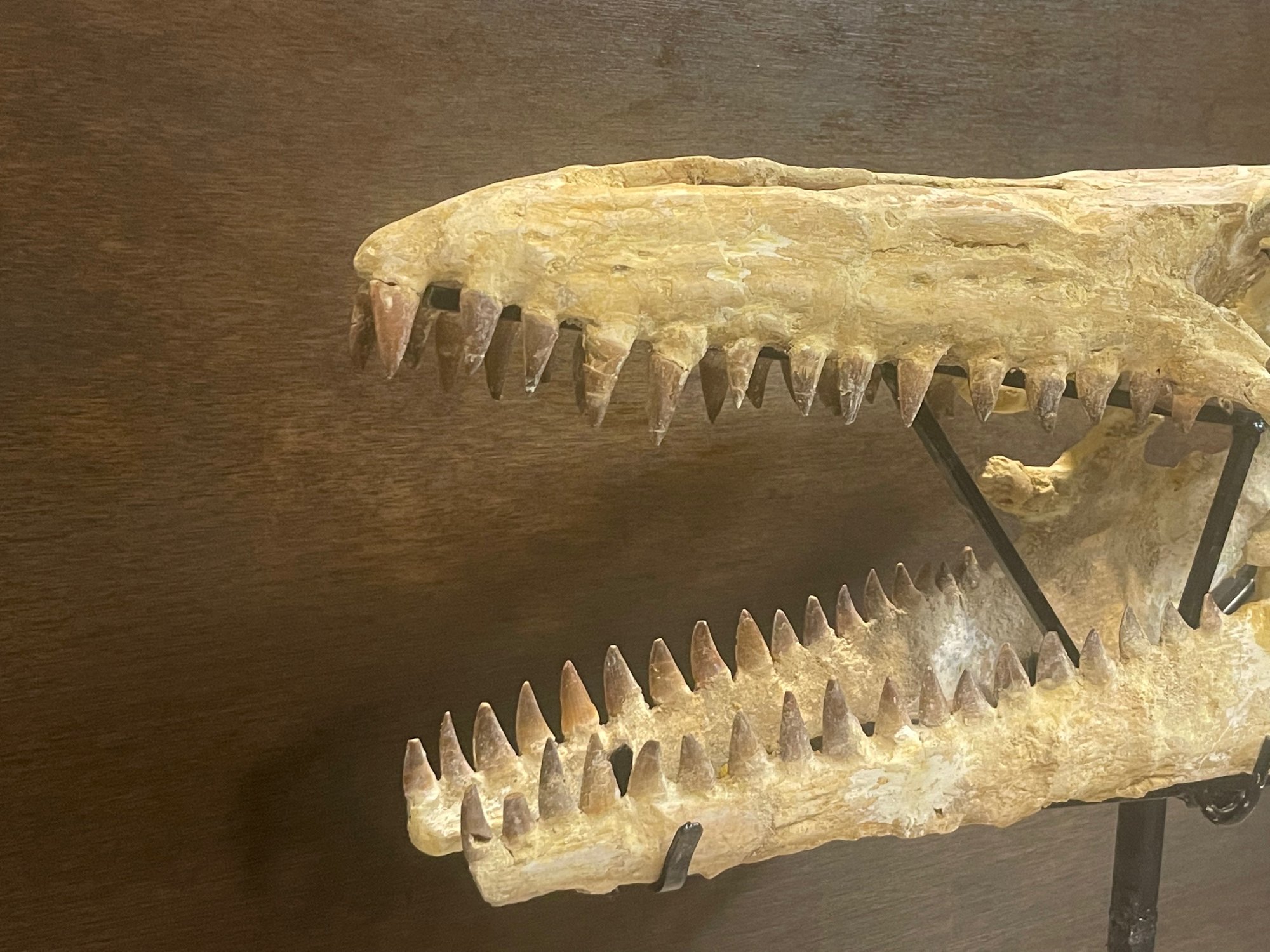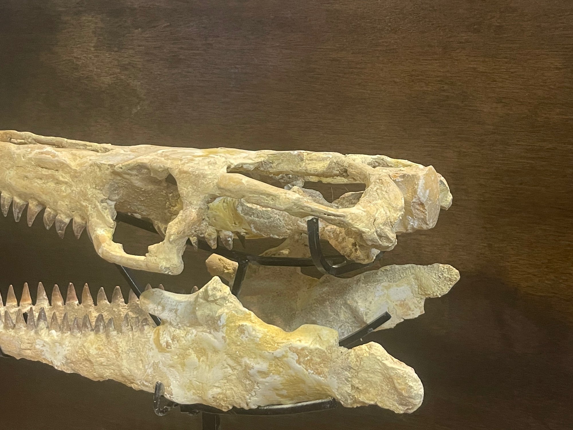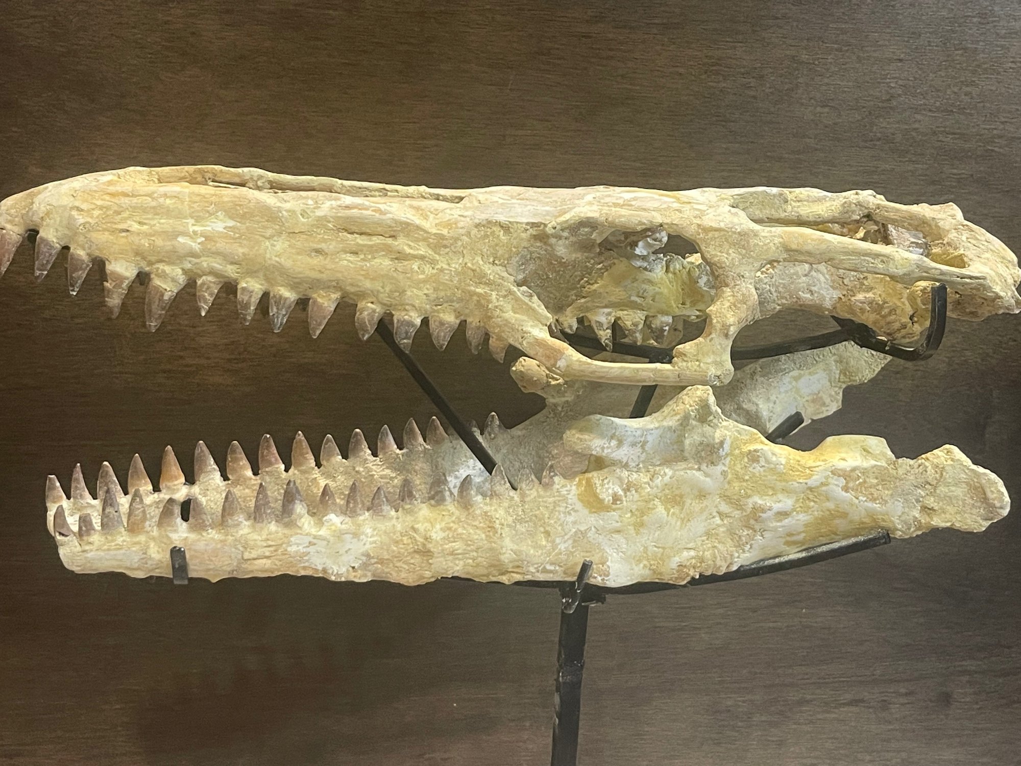 Ik ben het met Joris eens: hoewel de anatomie van de schedel globaal wel klopt, is er maar vrij weinig bot zichtbaar - daarin zou je namelijk bottextuur en zaken als foramina moeten kunnen herkennen, en dat is hier niet het geval. De botten ogen daarvoor ook veel te oneven. Anatomisch klopt er weinig van de onderkaak, waarbij de coronoid als ware los bovenop de uit één stuk bestaande kaken geplaatst is, en het onderscheid tussen dentary en surangular niet gemaakt is. Ook zijn alle tanden geplaatst, al lijken ze op het eerste gezicht wel tot dezelfde soort te behoren. Maar doorgaans worden dit soort schedels ook niet met zoveel tanden gevonden.