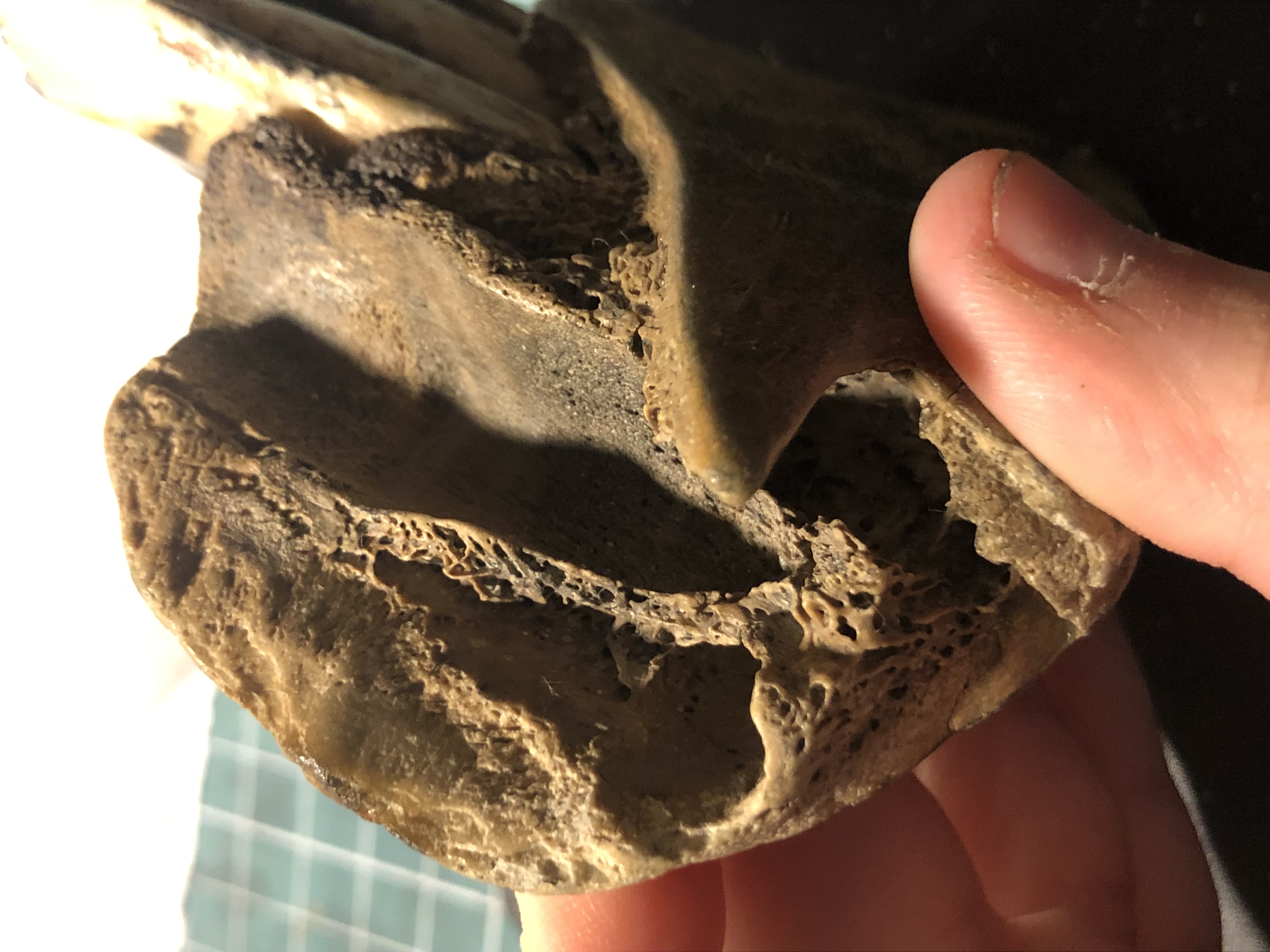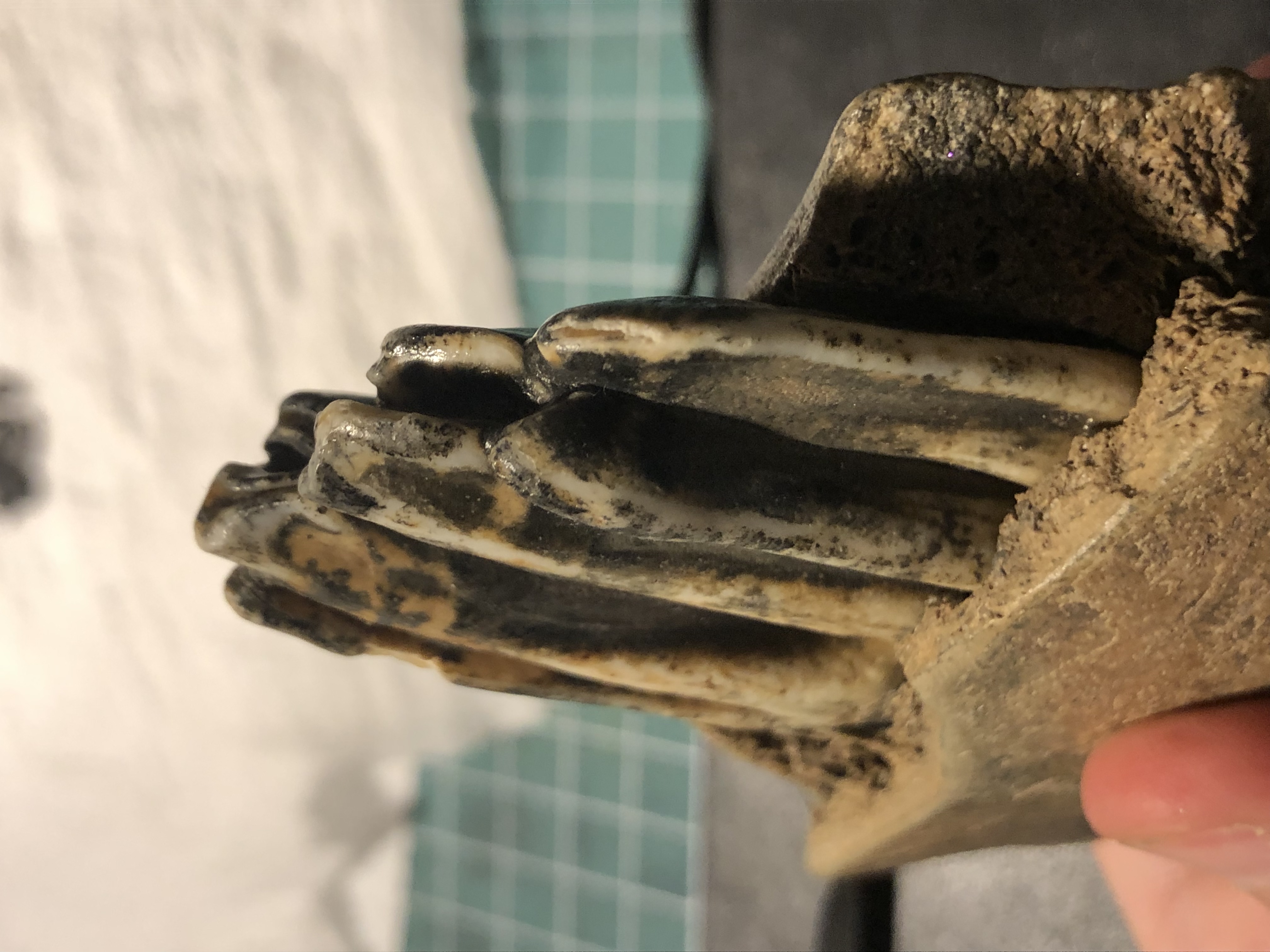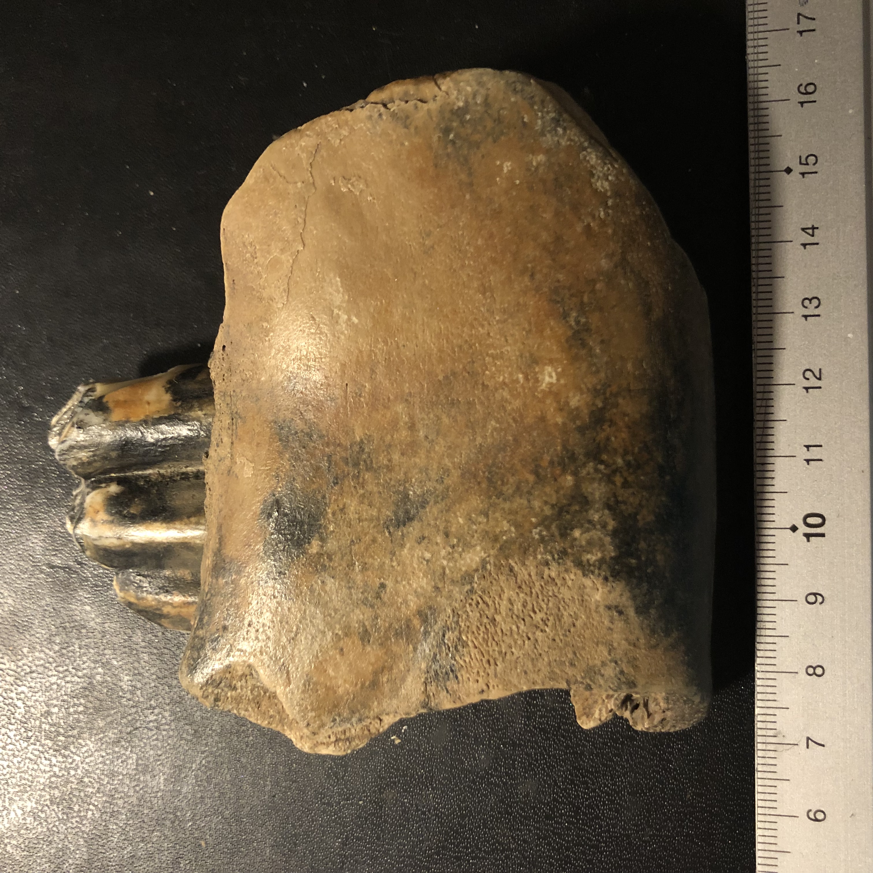 Ik vermoedde dat het van een gras-etend zoogdier was, mogelijk bizon/koe-achtig, maar ik heb geen ervaring en geen zekerheid. Heeft iemand ervaring met doggerlandfossielen en botresten uit de ijstijd?