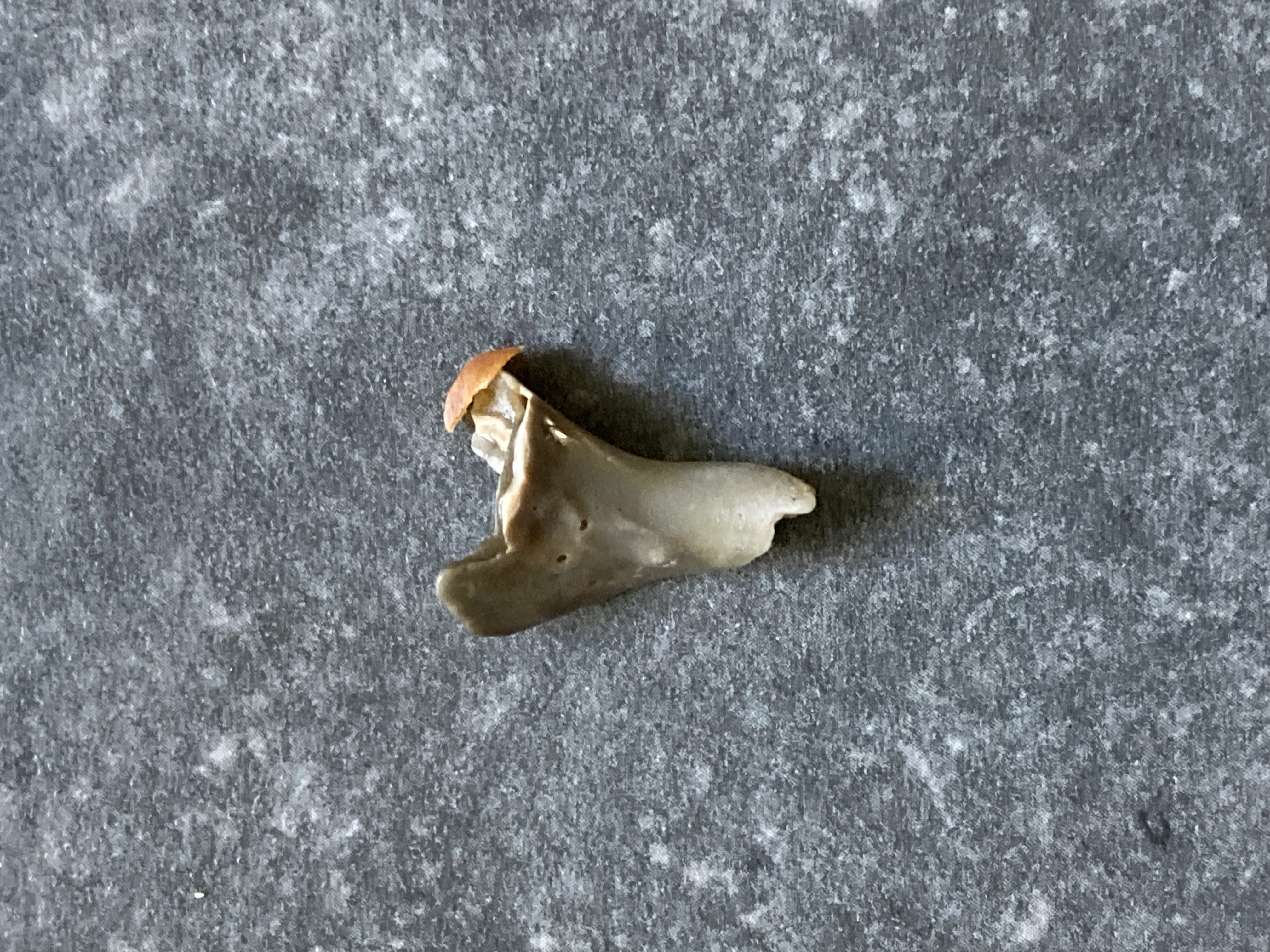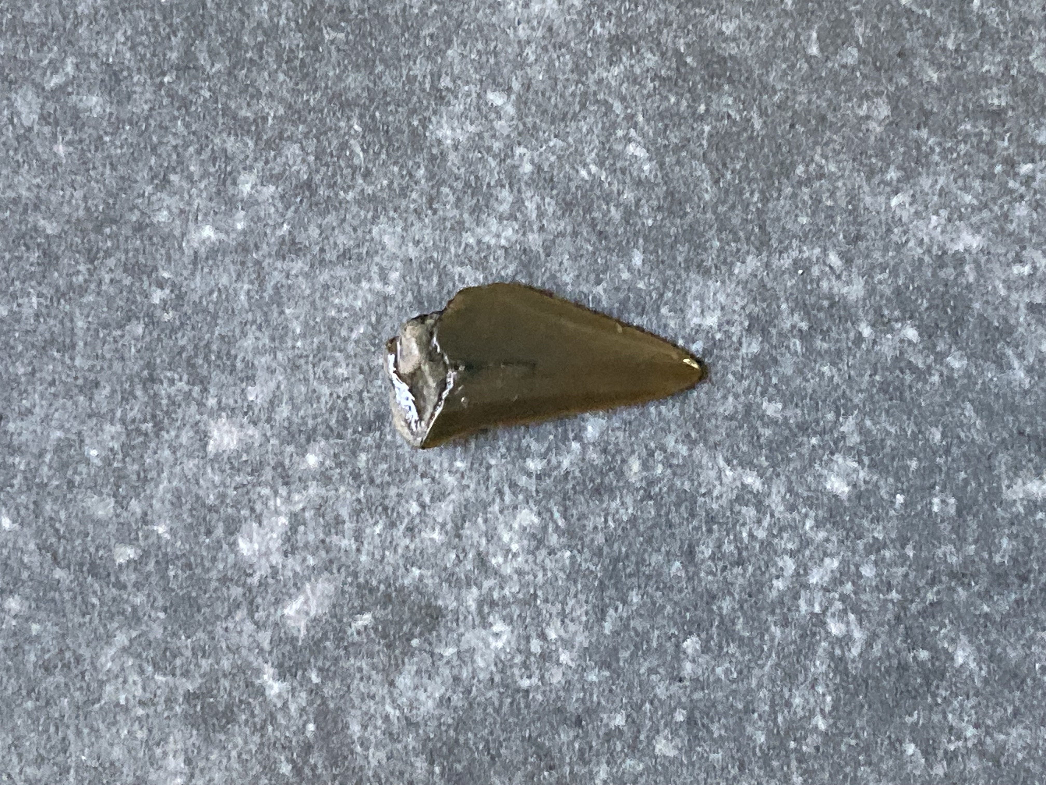 Tand 1; zwart-bruin van kleur. Een puntige tand, ongeveer 1 cm breed en 2,5 cm hoog. Gelukstreffer, kwam aanspoelen onder het zoeken.