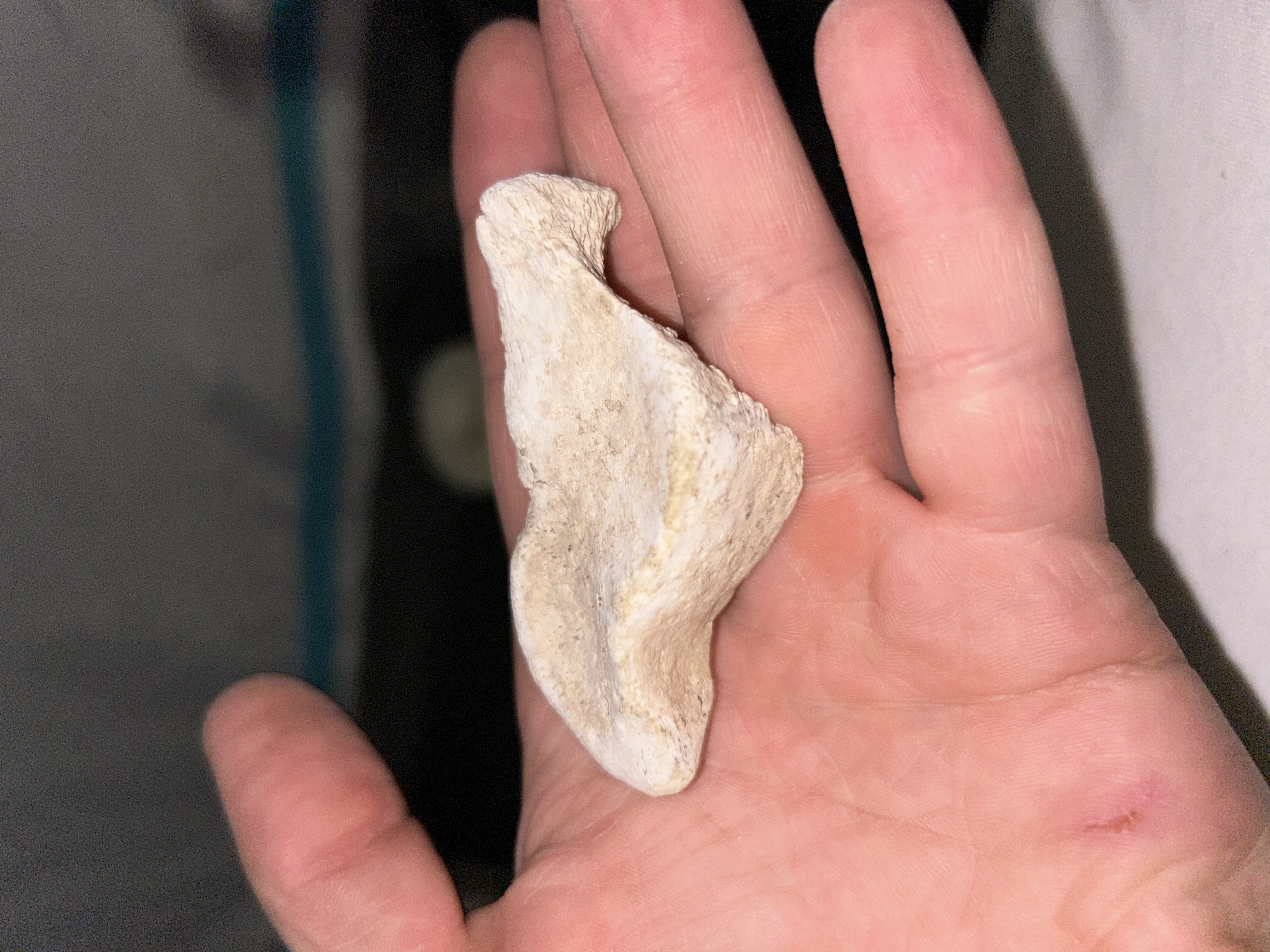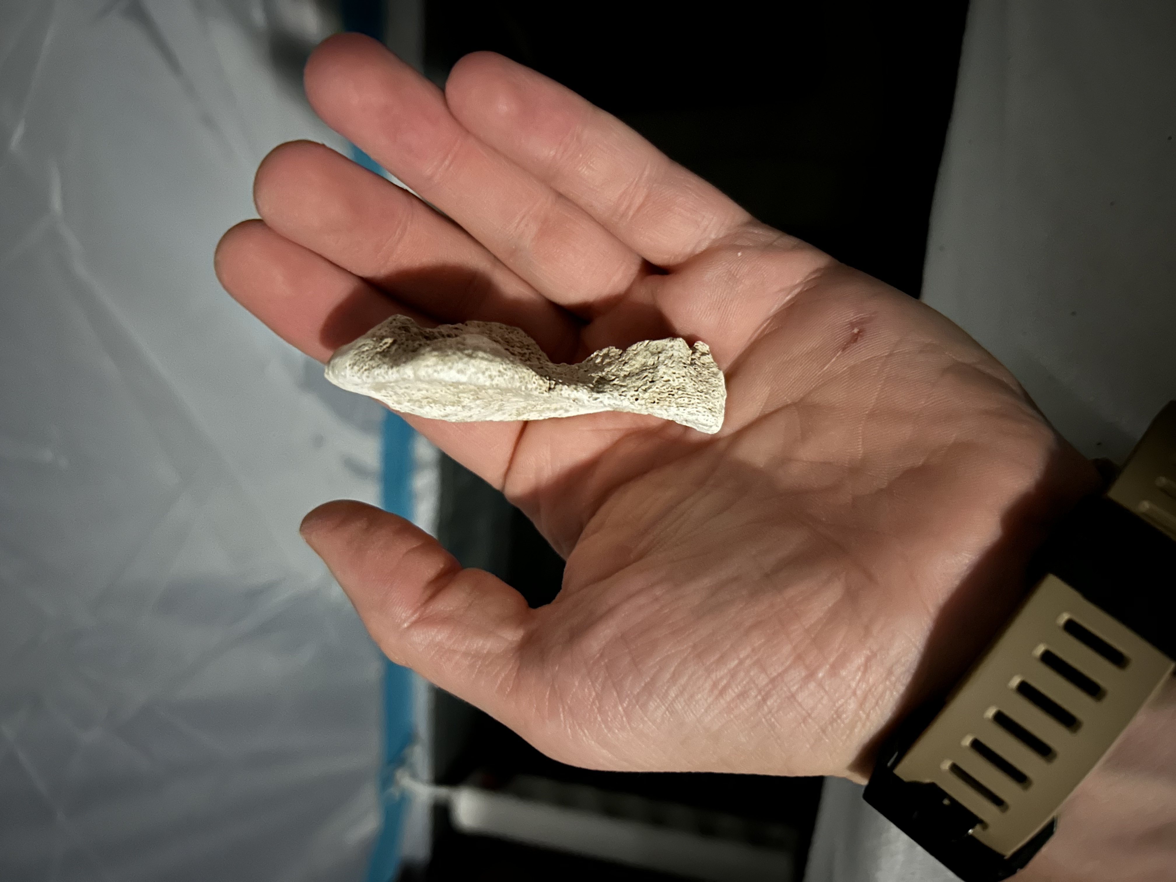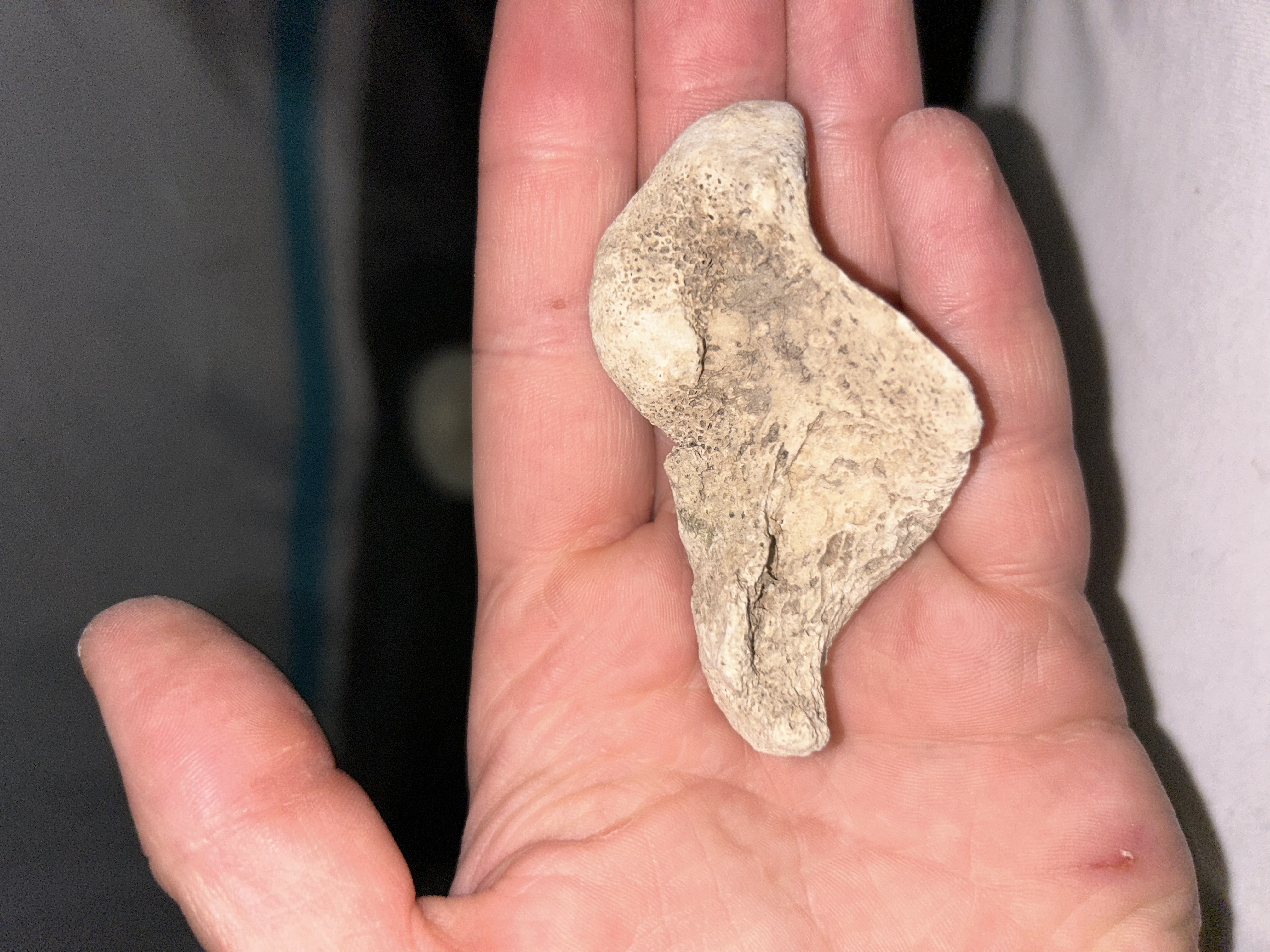 Normaal ligt mijn fascinatie bij het vinden van ammonieten etc langs de rivieren van Frankrijk. Maar tijdens een wandeling in de Ardèche bij het plaatsje Balazuc vond ik dit bot fragment. Het lag tussen de stenen van de rivierbedding. De stenen langs de rivier hadden de zelfde kleur, vandaar dat hij niet opviel.