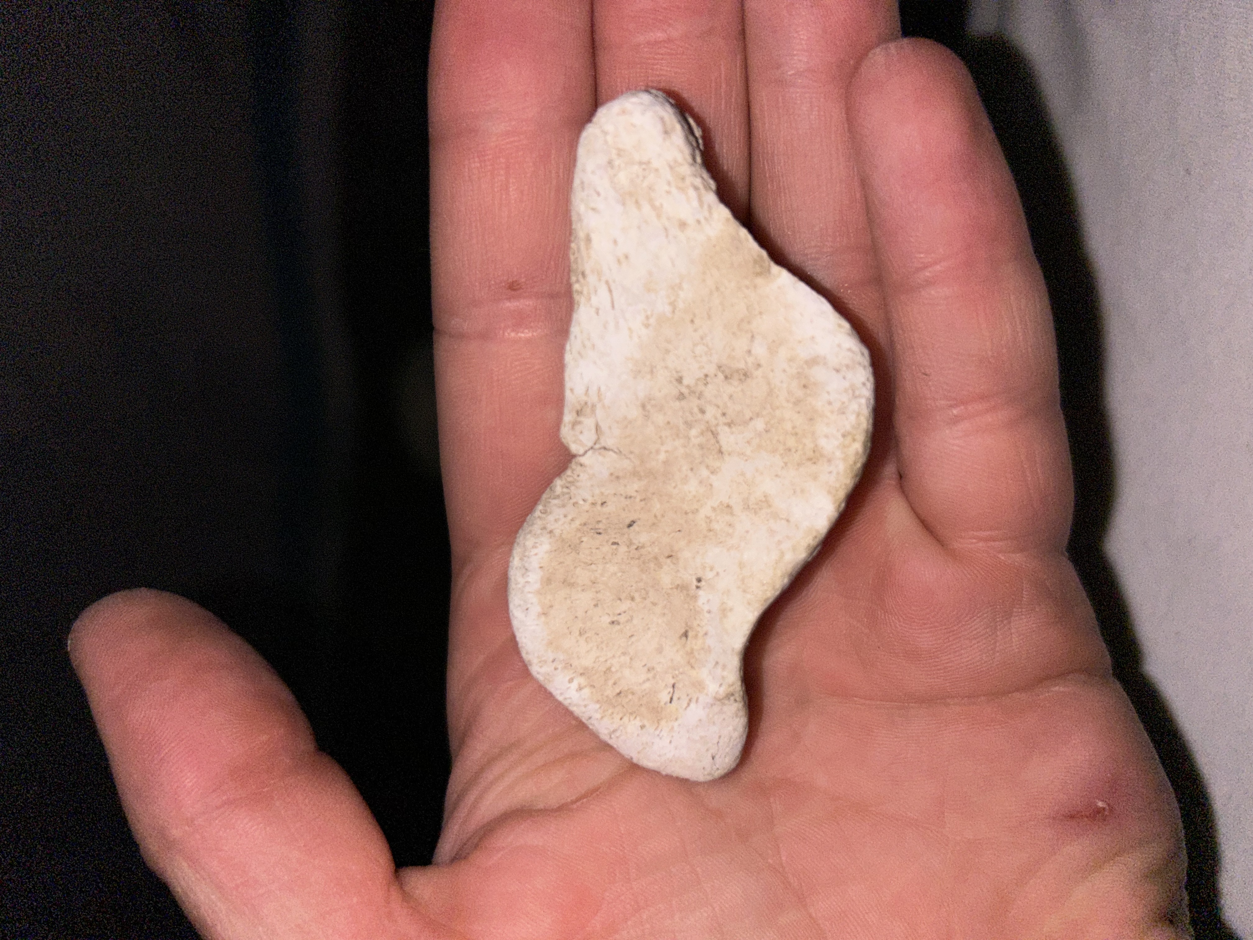 Ik durf niet te zeggen van welk zoogdier dit is geweest of tot welke botgroep dit behoord. Ik denk dat het een kom of een halve wervel is. Mogelijk dat het niet eens heel oud is. Hopelijk kunnen jullie helpen met het achterhalen van welk dier dit bot is geweest
