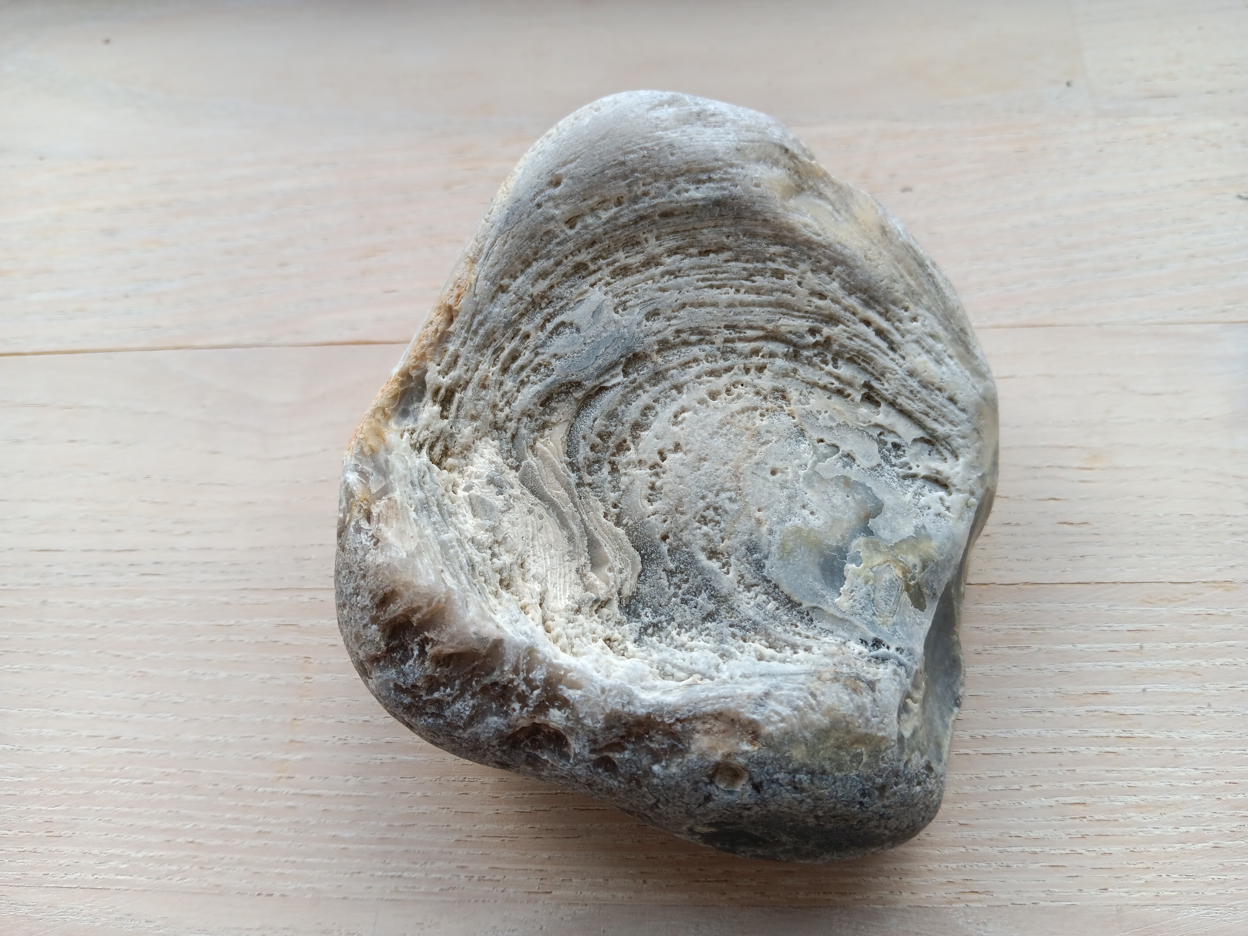 Volgens mij is dit een fossiele oester (vuursteen). Ook deze heb ik gevonden tijdens mijn vakantie op Mons Klint. Naast een aantal kleinere exemplaren die ik heb gevonden, is dit wel een mooie grotere. Mooi om de kenmerkende 'banden' in de versteende schaal te zien