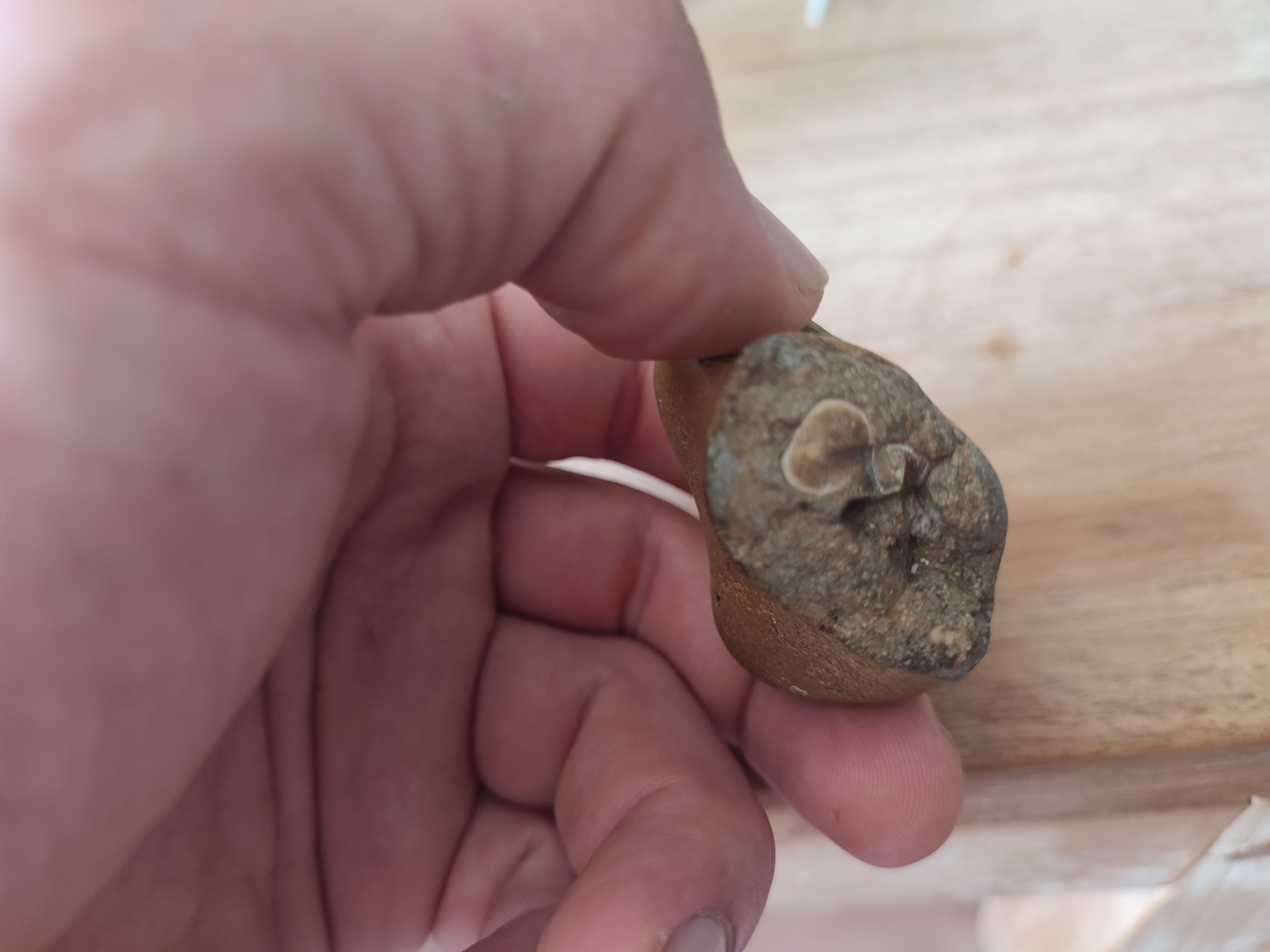 Het is wat lastig te beoordelen van de foto, al lijk ik een opvulling van een tweekleppige schelp te zien. Op Texel kan je van die zandsteen vinden met schelpen er in. Deze moet je niet prepareren en Johan’s advies volgen.