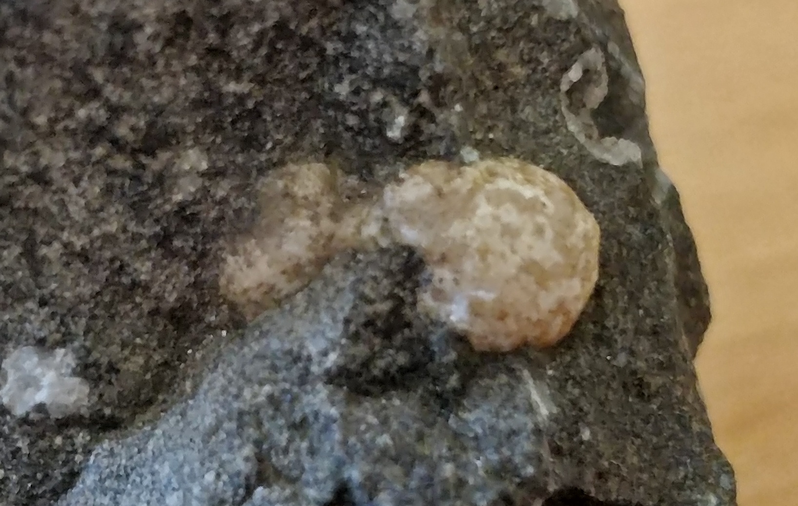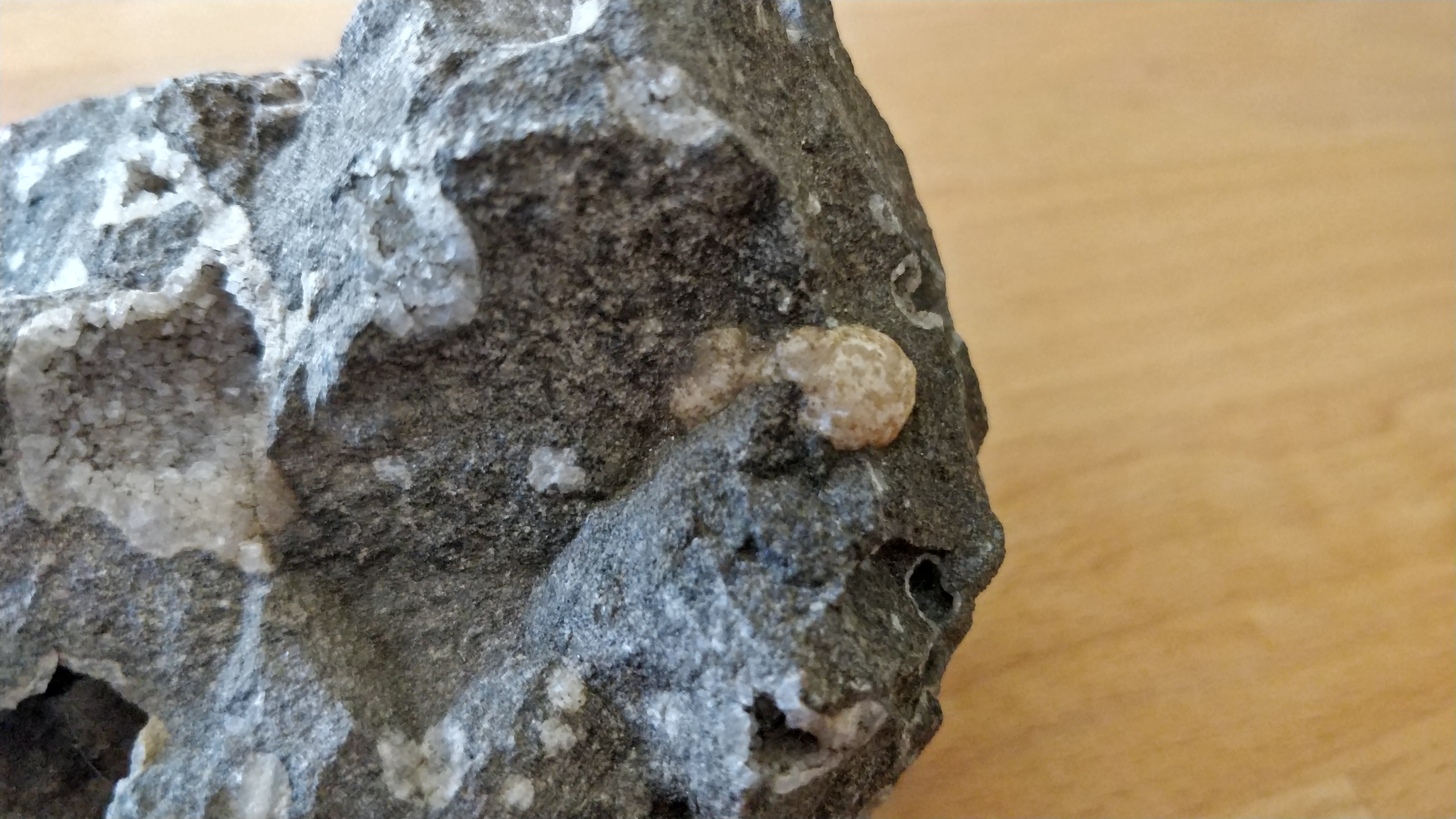De bolle structuur lijkt me een geode, vergelijkbaar met de holle structuur met witte rand die op de eerste foto rechtsboven de bolle structuur te zien is. De meeste geodes worden opengebroken gevonden. Deze lijkt op het contact tussen het moedergesteente en de mineraalgroei te hebben losgelaten.