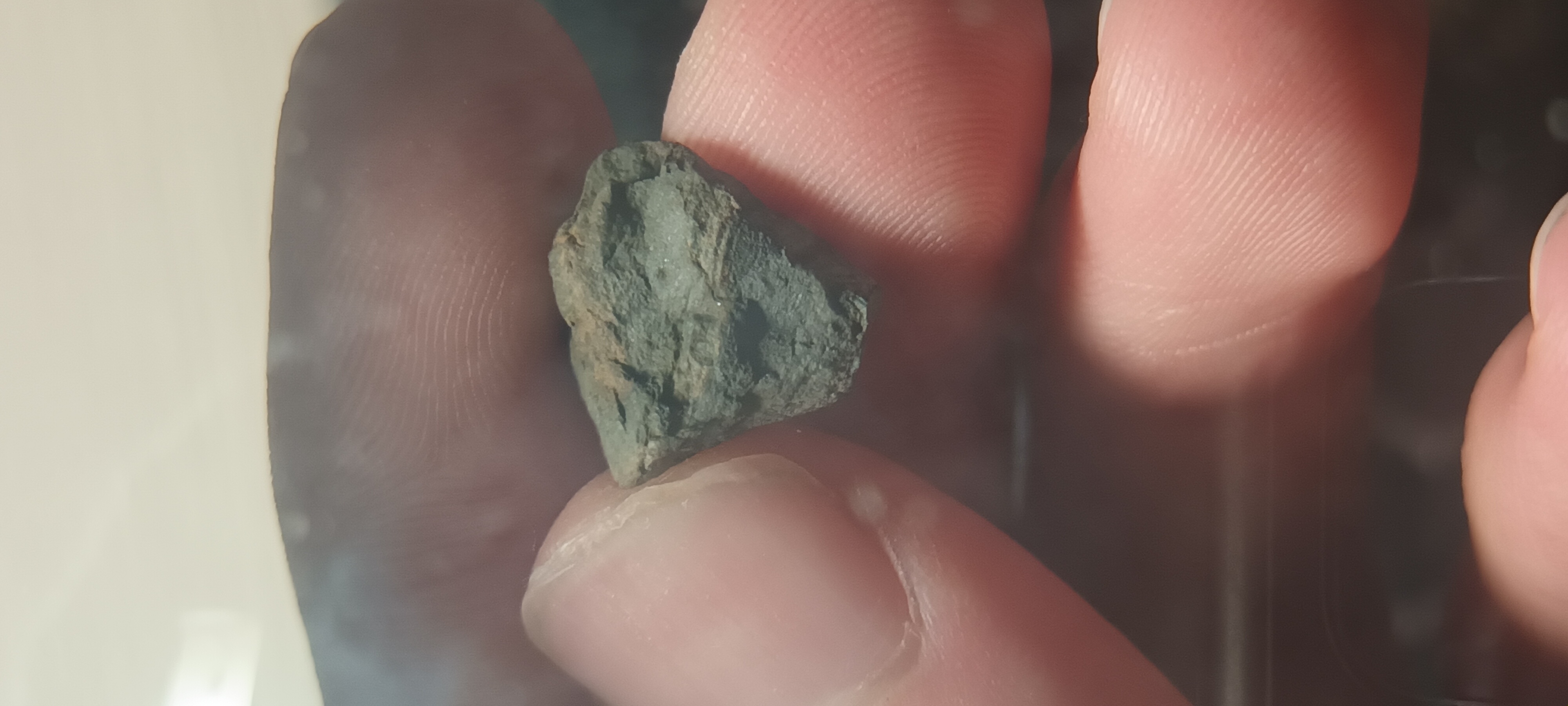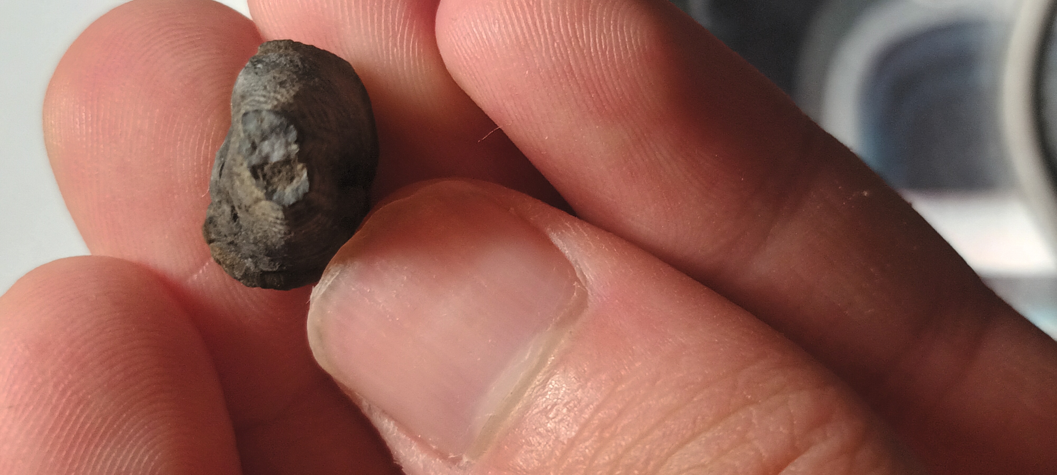 Het gaat hier om een vermoedelijk fossiel van een rostroconch uit het Late Eifeliaan afkomstig van de oude groeve in Resteigne (Tellin), uit de Hanonet Formatie. Ik heb het fossiel niet zelf geïdentificeerd, maar na het posten van de vondst op The Fossil Forum denk ik, zoals anderen op het forum suggereerden, dat het inderdaad om een rostroconch gaat, hoewel er een kans bestaat dat het om een coraal uit de orde Rugosa gaat. Hieronder zijn enkele foto's van het fossiel. De afmetingen zijn 1,3 cm op 1,5 cm. Ook zijn er twee foto's ter vergelijking met Calceola sandalina (links).