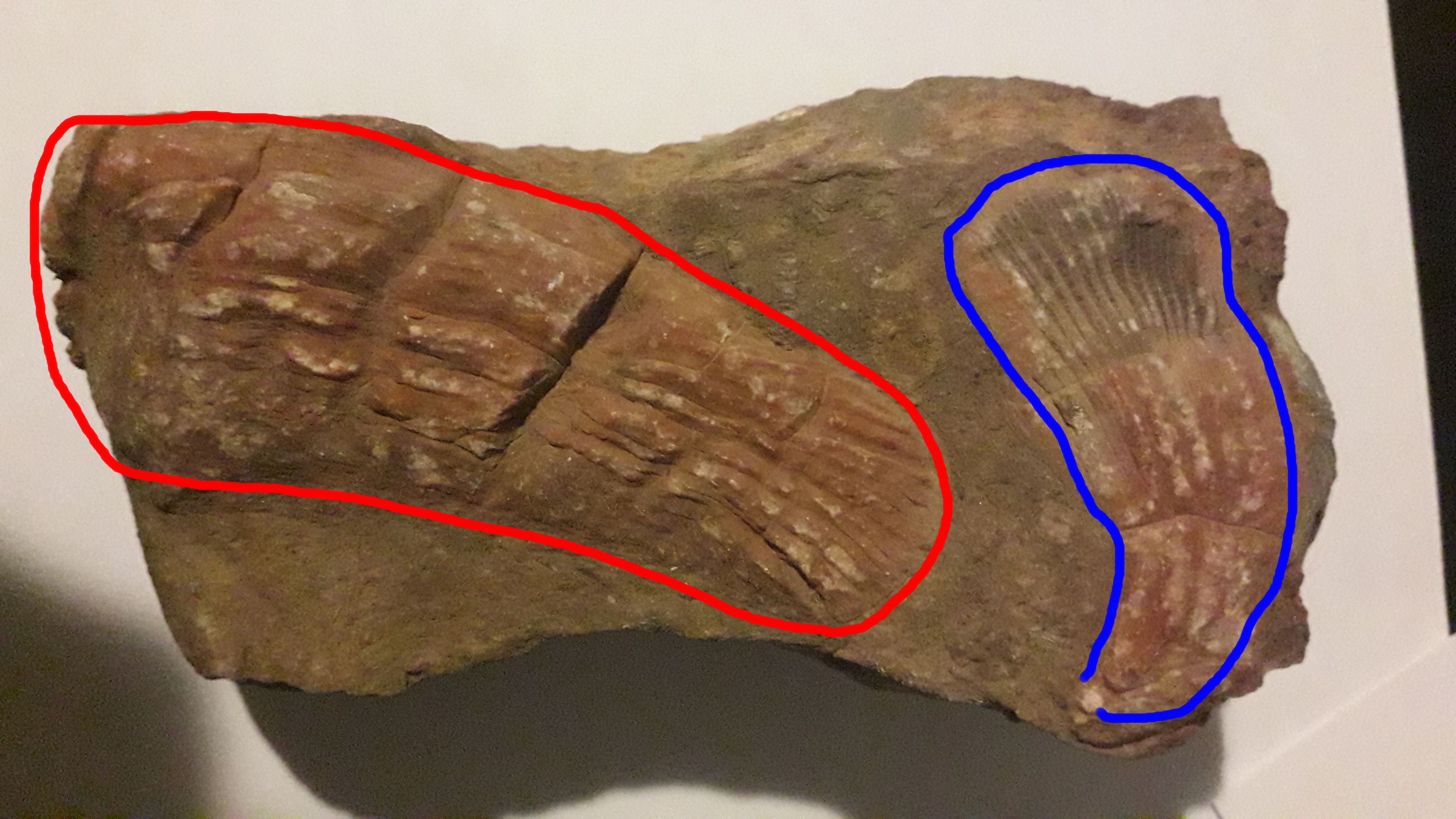 Nu ben ik zeker geen expert op het gebied van Marokkaanse fossielen, maar ik zie twee structuren in je steen (hieronder in rood en blauw omlijnd). Vooral die blauwe structuur doet me enigszins denken aan een lengtedoorsnede door een hoorkoraal o.i.d. Zulke koralen zijn goed gekend uit Marokko (zie bijvoorbeeld dit exemplaar). Merk wel op dat die lengtedoorsnede dan niet mooi door het midden van het koraal zou lopen, maar meer naar de rand toe, waardoor je over een langere lengte de septa aansnijdt. De rode structuur herken ik niet zo direct, maar mogelijk is dit ook een zeer slecht bewaard koraal? Geen idee, helaas. Maar in ieder geval zou ik je stuk niet direct als een knutselwerkje willen afschrijven...