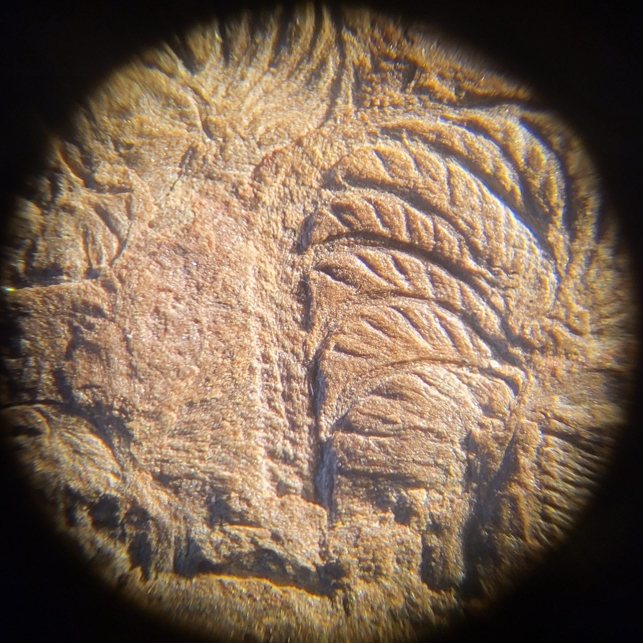 Hierbij de beloofde extra foto's; moest even op daglicht wachten. Ik meen hier minuscule, opgerolde blaadjes in te herkennen, met een enigszins "harig" steeltje. Het zouden wel best kleine "Spiropteris sp." zijn. Maar die C-vormige structuur ernaast blijft me een raadsel. Is deze gerelateerd aan de spiralen of niet?
