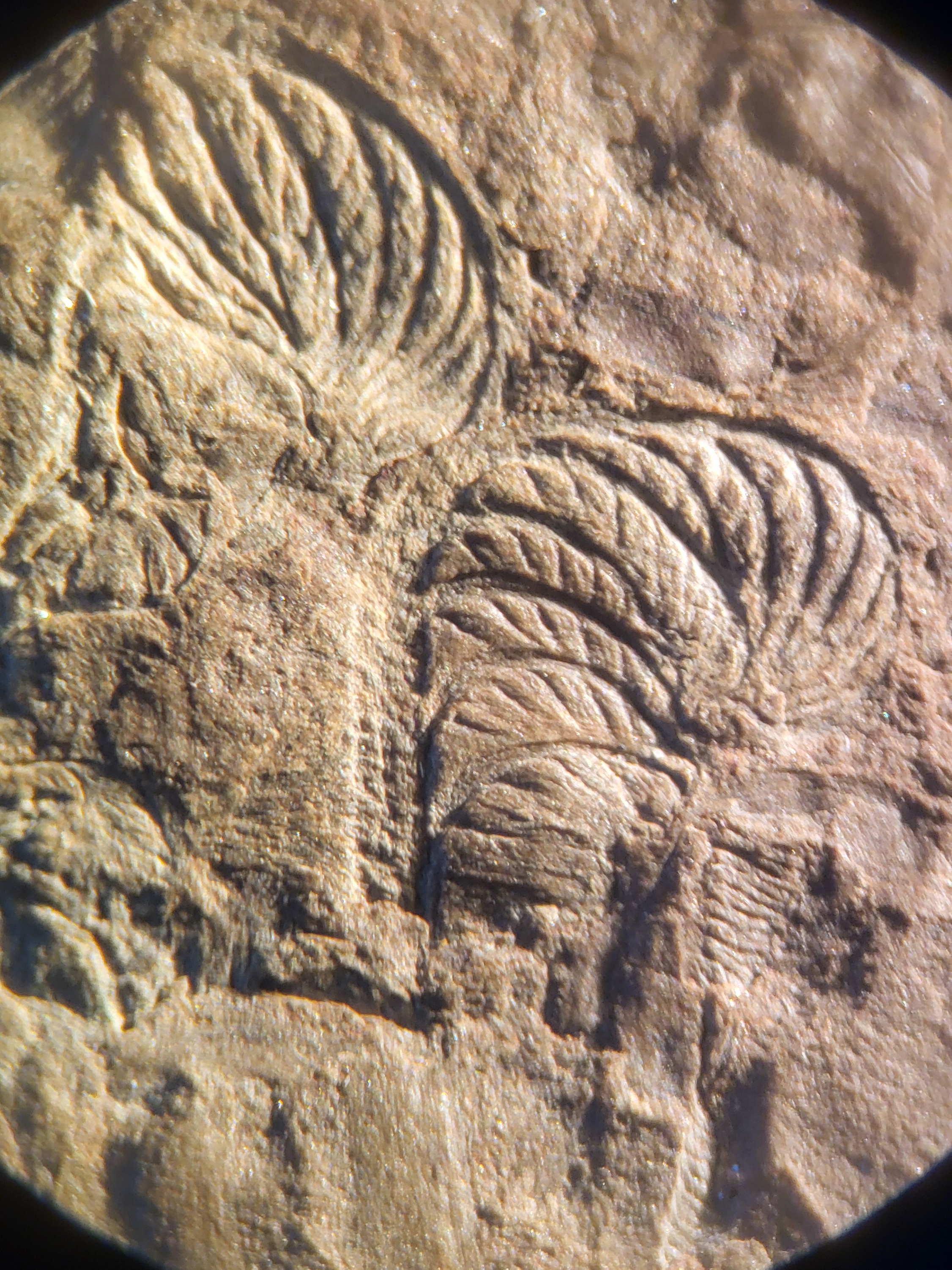 Hierbij nog een foto van een fossiel dat al een tijdje naamloos in mijn verzameling zit. Het fossiel in kwestie komt uit het Westfaliaan (Boven Carboon) van Noord Frankrijk. Op de achtergrond zijn meerdere pinnulae te zien, maar het gaat me om de drie "spiralen" rechts in beeld en de "C-vormige" structuur centraal op de foto. De drie spiralen samen zijn 16 mm hoog op de foto.