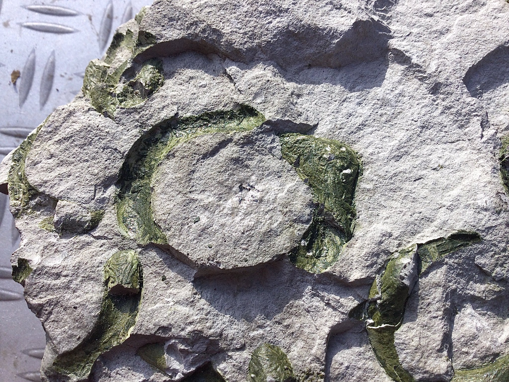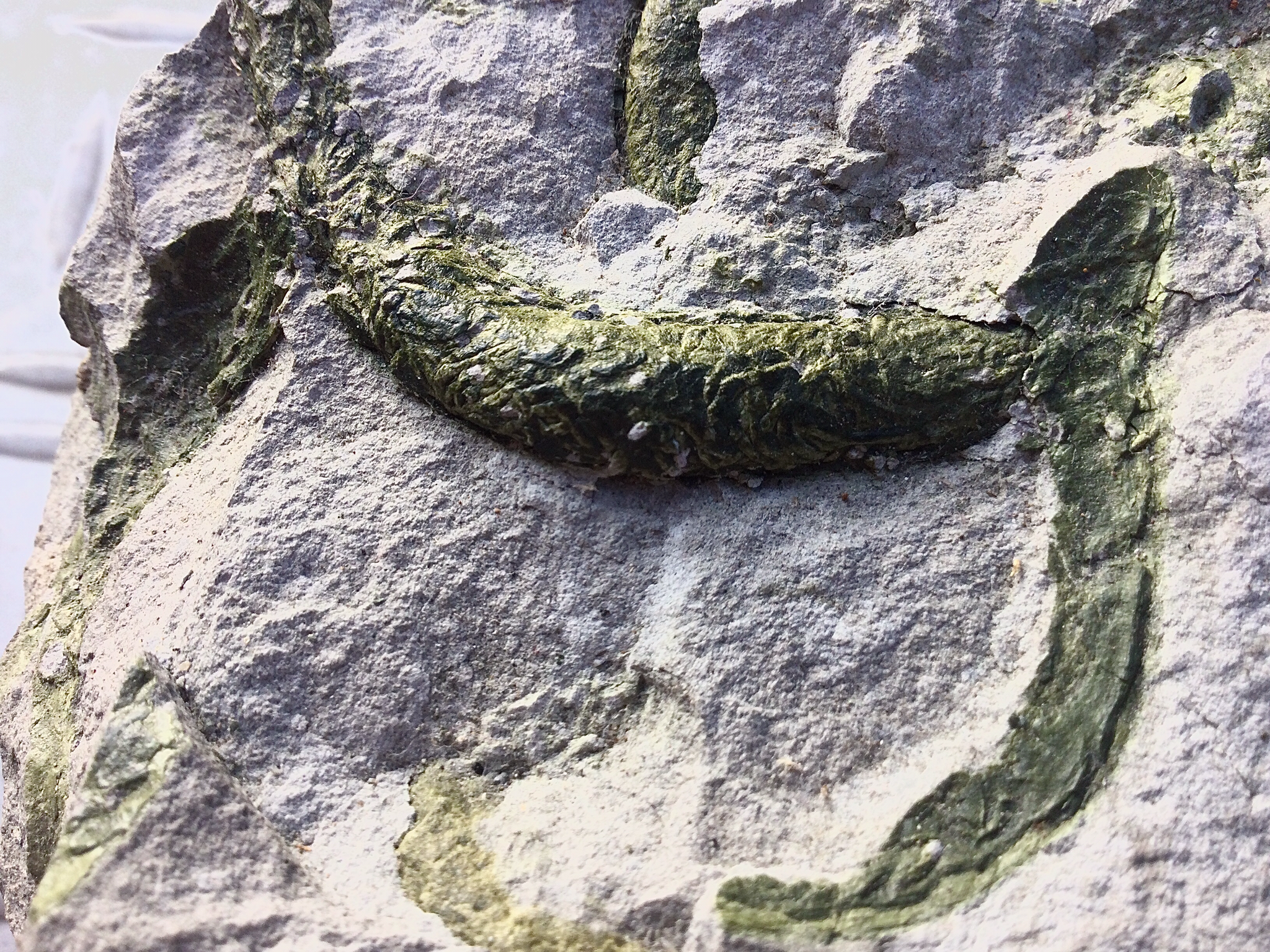 Een brok die ik al enige tijd heb liggen, niet uit het Carboon, maar wel met een netwerk aan kruipgangen. De structuur ervan en de manier waarop ze op de steen liggen/er als afdruk in zitten lijkt wel op de C.