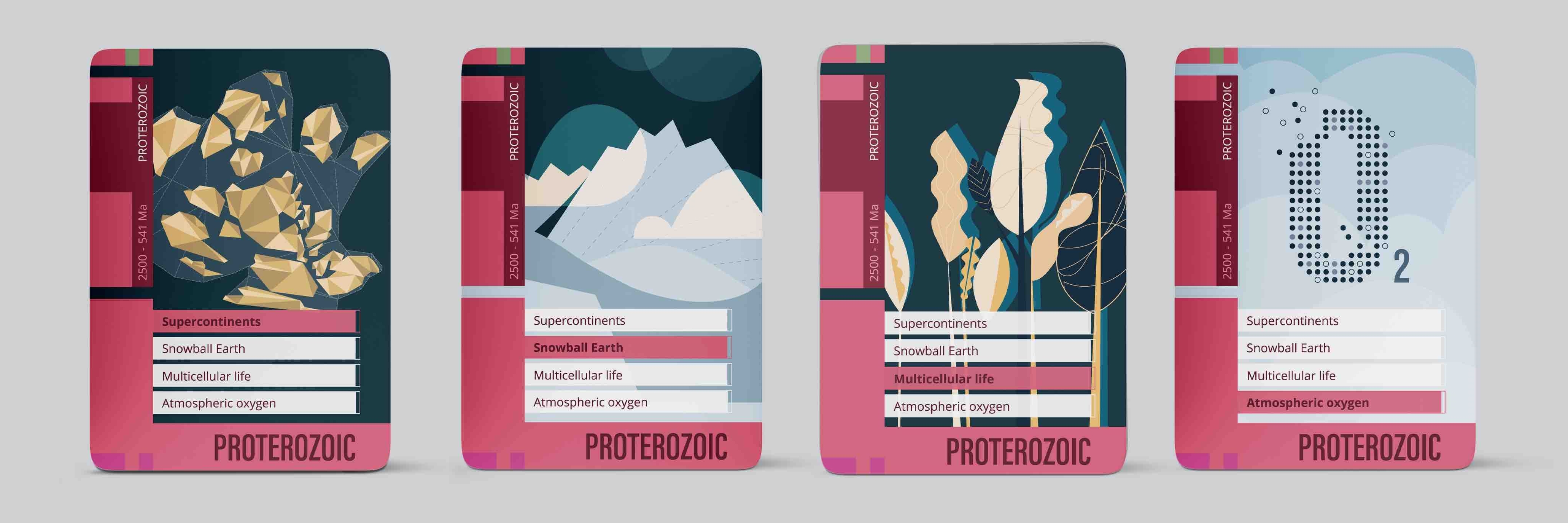 De speelkaarten zijn ontworpen door aardwetenschapper en freelance illustrator Lucia Perez-Diaz. De afbeeldingen zien er mooi uit en gebruiken bovendien het officiële kleurenschema voor de geologische tijdschaal van de Internationale Commissie voor Stratigrafie. Iris stuurde mij deze set kaarten voor het Proterozoïcum als voorproefje: