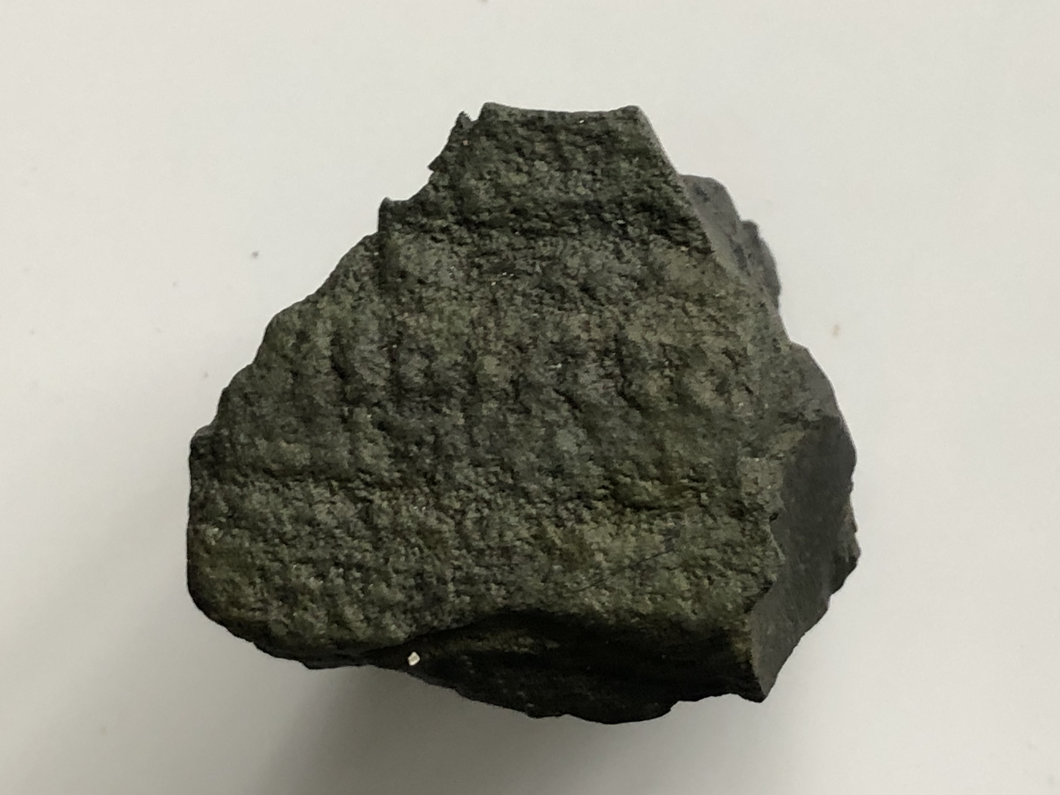 Deze steen werd gevonden aan de kust nabij Achadh Chuirn van het eiland Skye in Schotland. Wegens de structuur bovenaan denk ik dat het om een fossiel gaat, bv. een plant. De steen is donkergrijs en de structuur eerder donkergrijs-groen (kan niet afgeveegd worden). Is dit een fossiel? (Afmeting: 3,5 x 3,5 x 3 cm.)