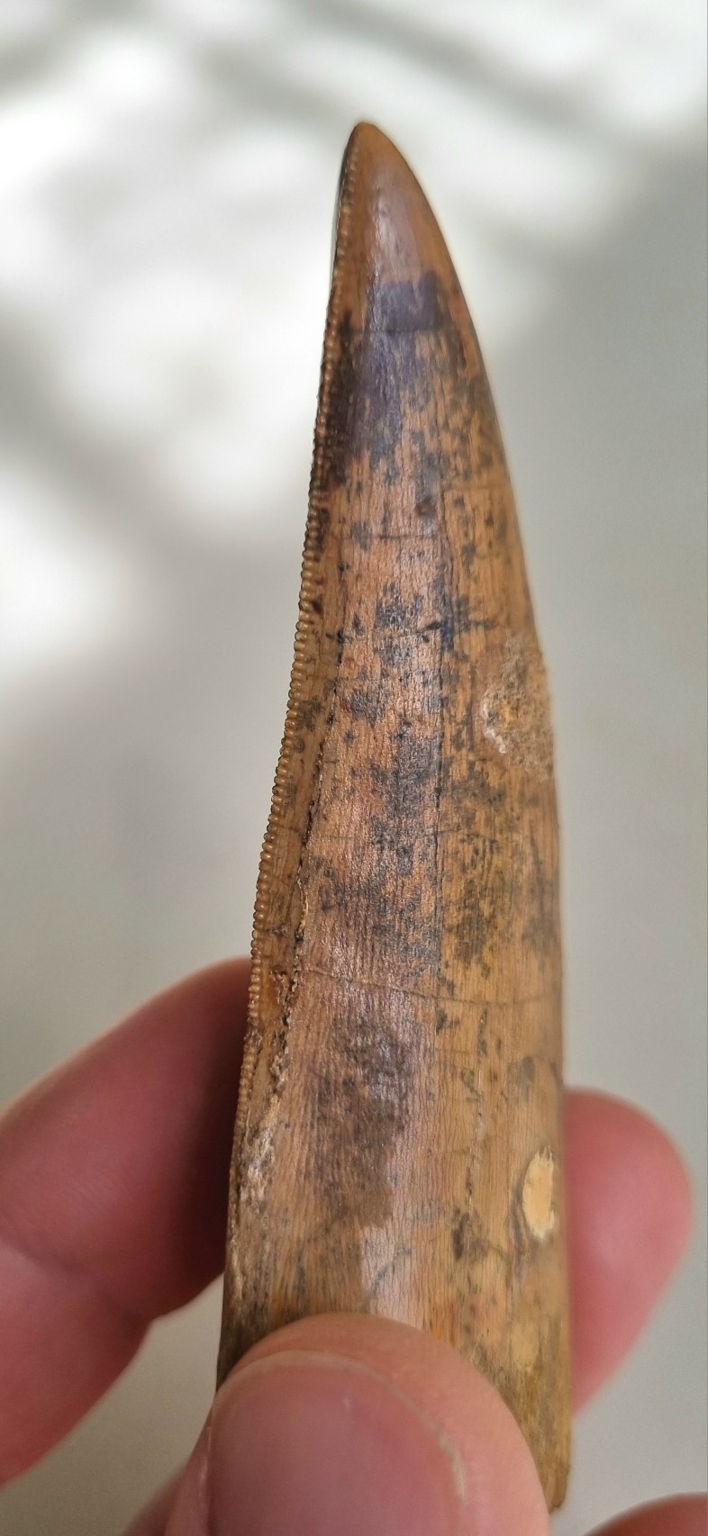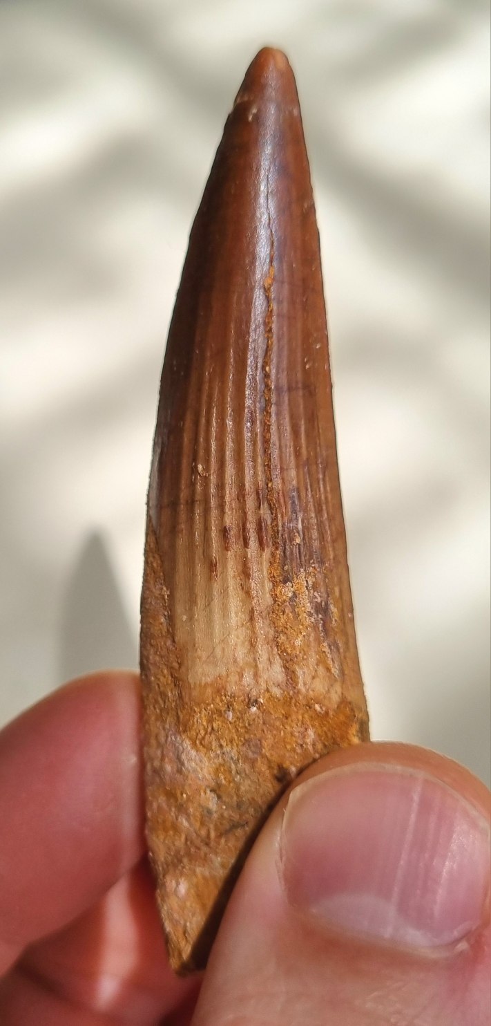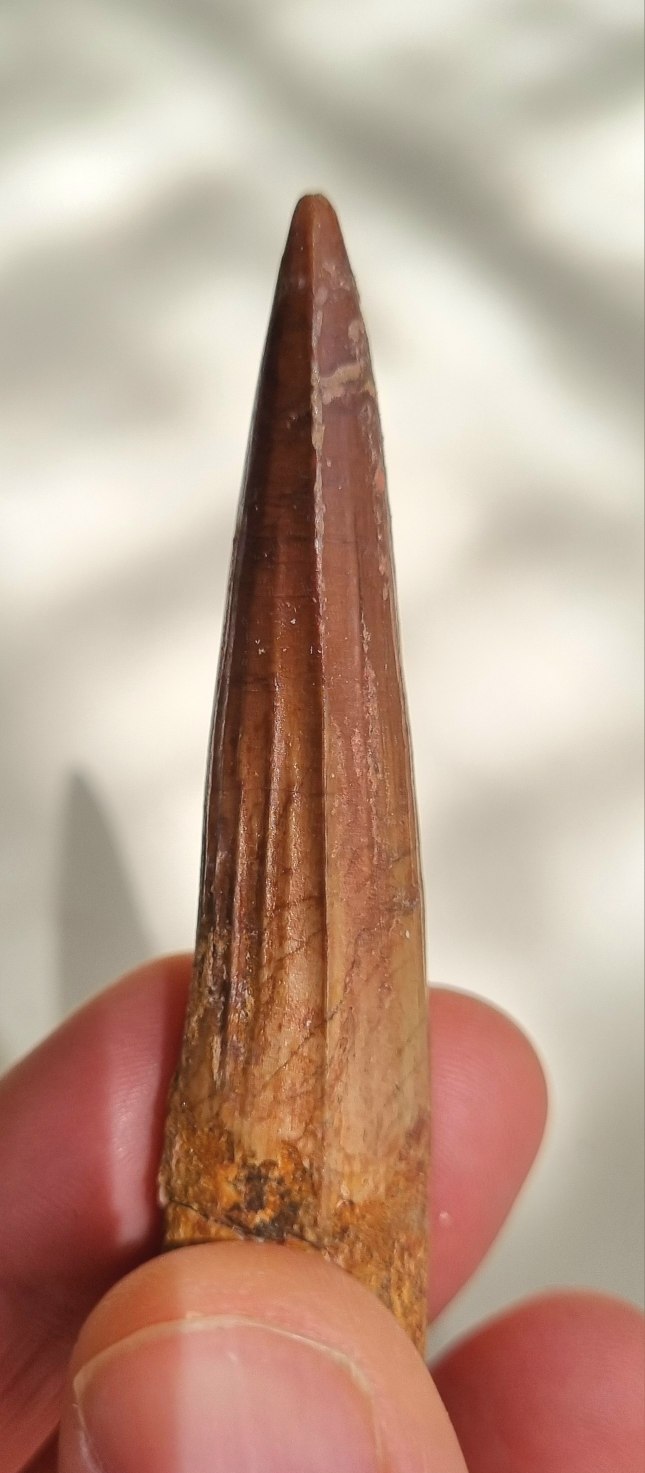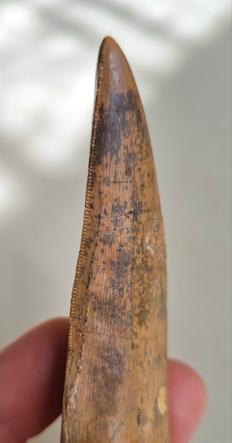 Spinosaurus aegypticus tooth 8.5cm, Kem Kem 04.jpg
