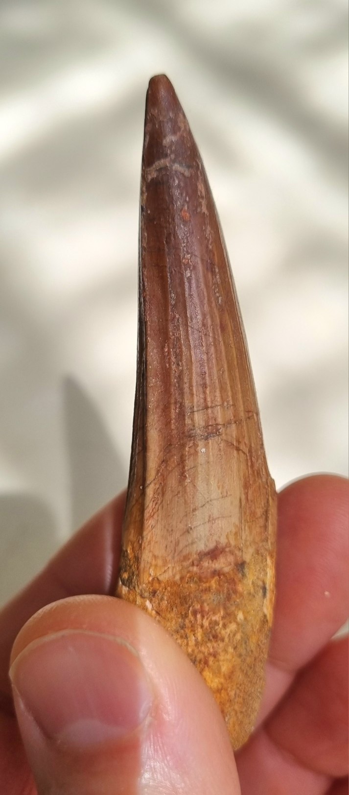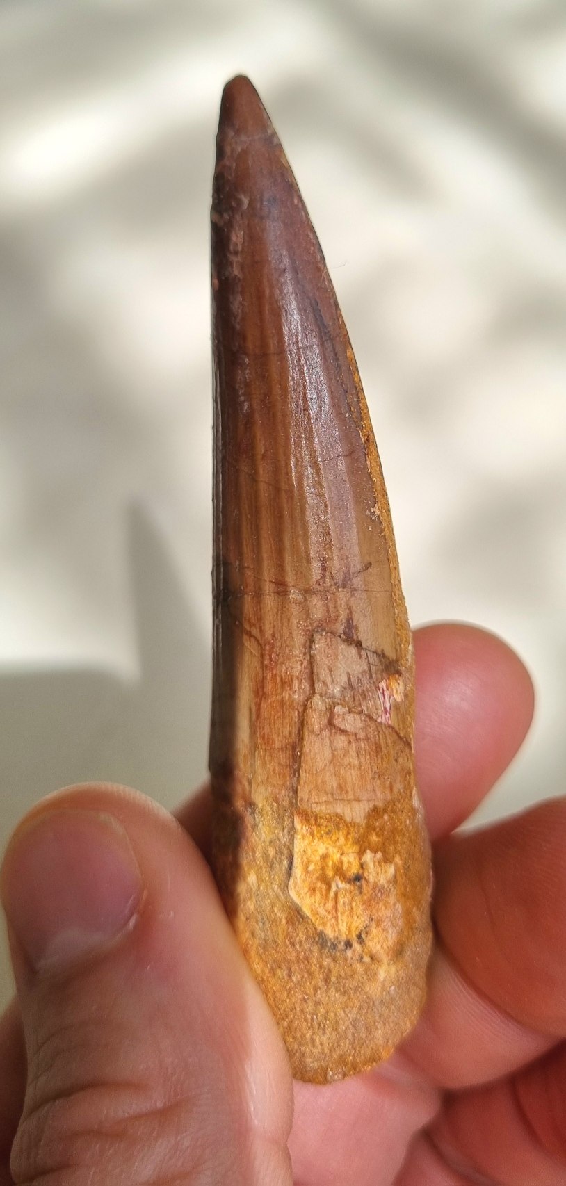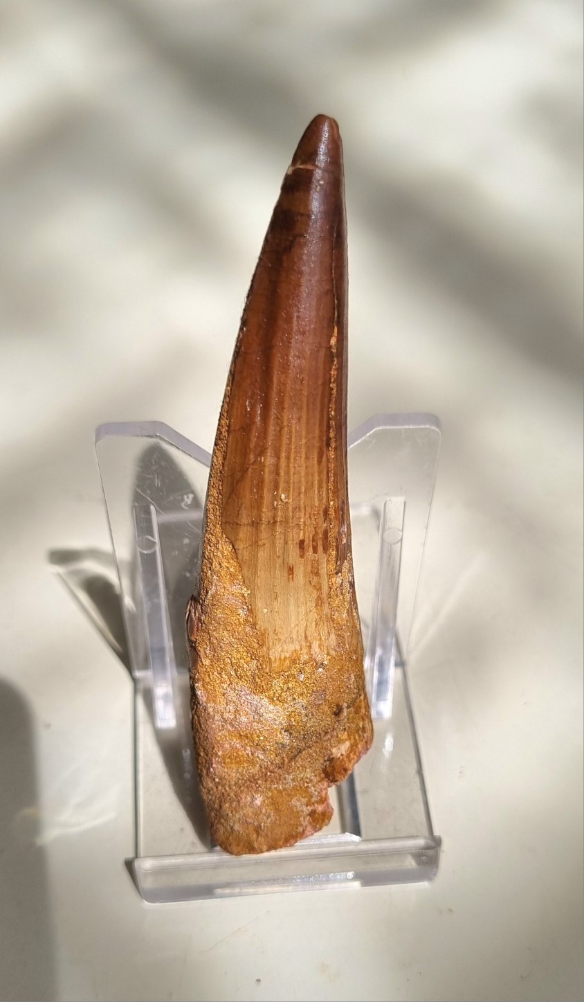 Spinosaurus aegypticus tooth 8.5cm, Kem Kem 04.jpg
