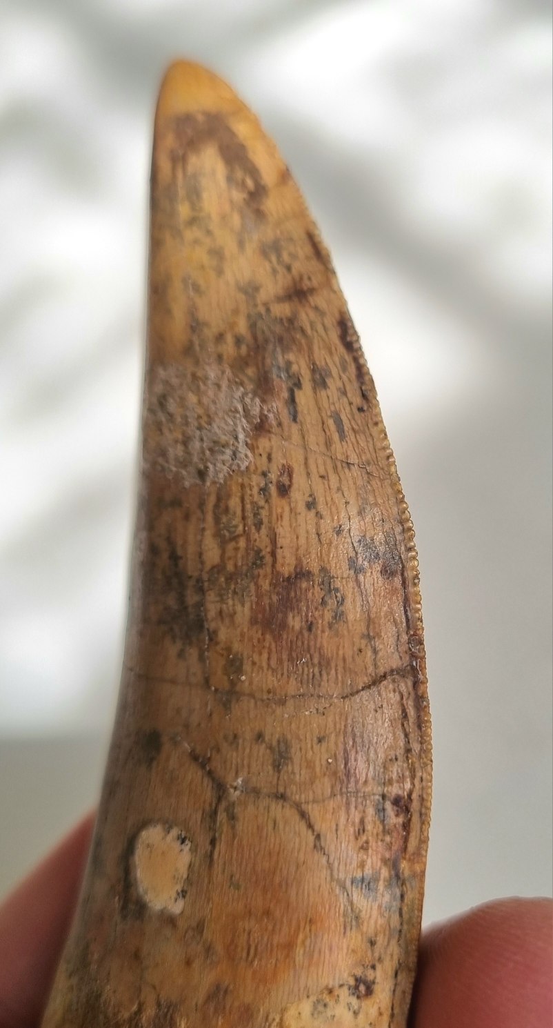 Grote, 11cm Carcharodontosaurus saharicus tand. Erg mooi behouden, met uitstekende karteling. Afkomstig uit de Kem Kem van Marokko. €650 VERKOCHT