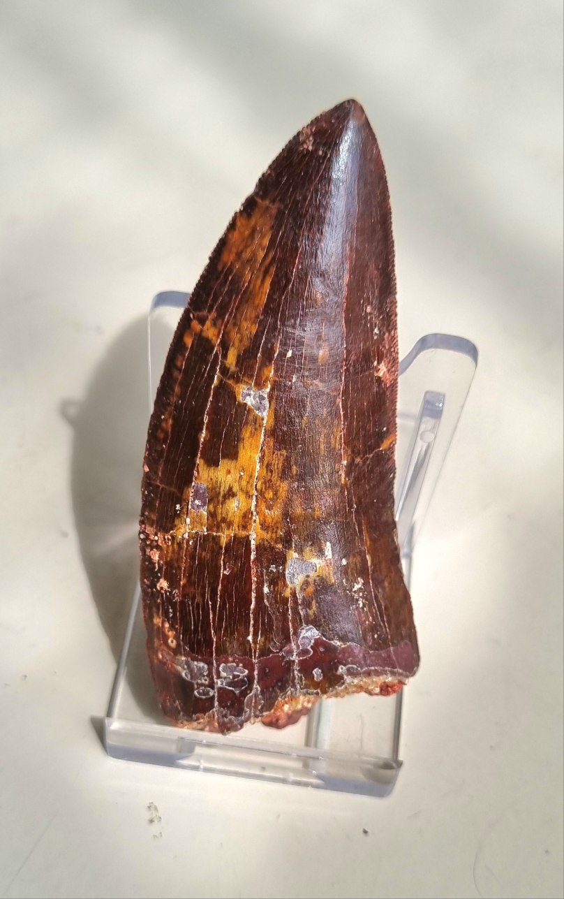 Spectaculair rood gekleurde 9cm grote Carcharodontosaurus saharicus tand uit de Kem Kem van Marokko. Bijzonder goed behouden karteling. €550 VERKOCHT