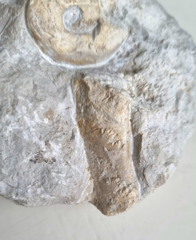 Perisphinctes sp. uit het ondere "Weißjura" (Kimmeridgiaan) van de bergen rondom Balingen in Duitsland. Ca. 7,2 cm op een stuk matrix van 13,2 x 8,3 cm, met daarop nog een tweede ammoniet van zo'n 2,8 cm. €30 VERKOCHT