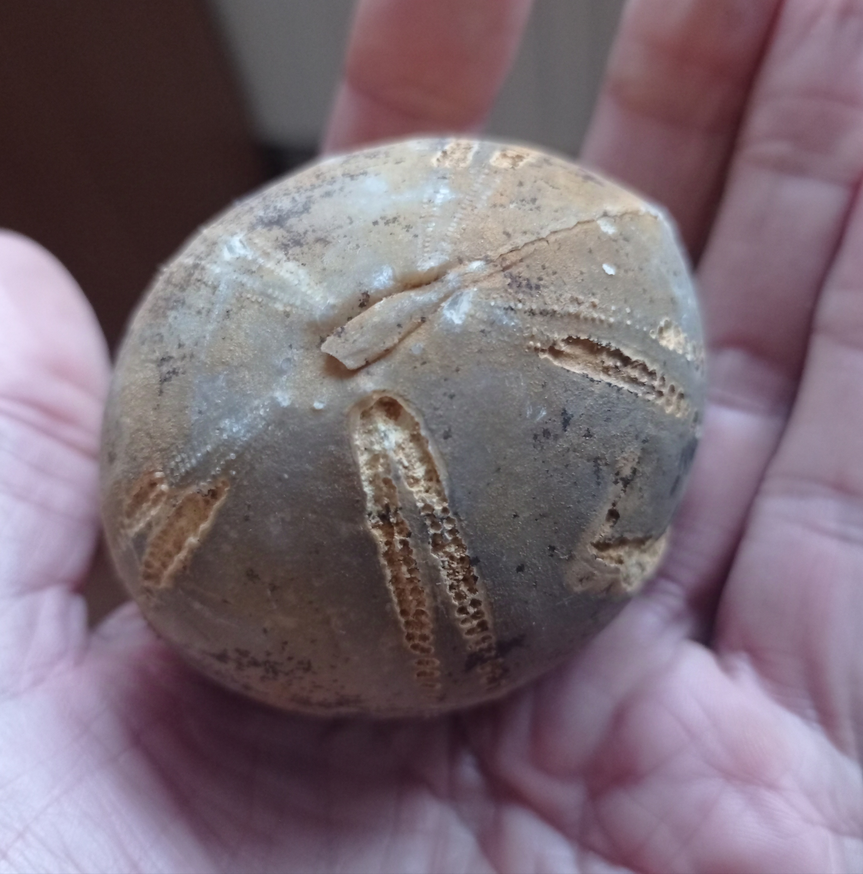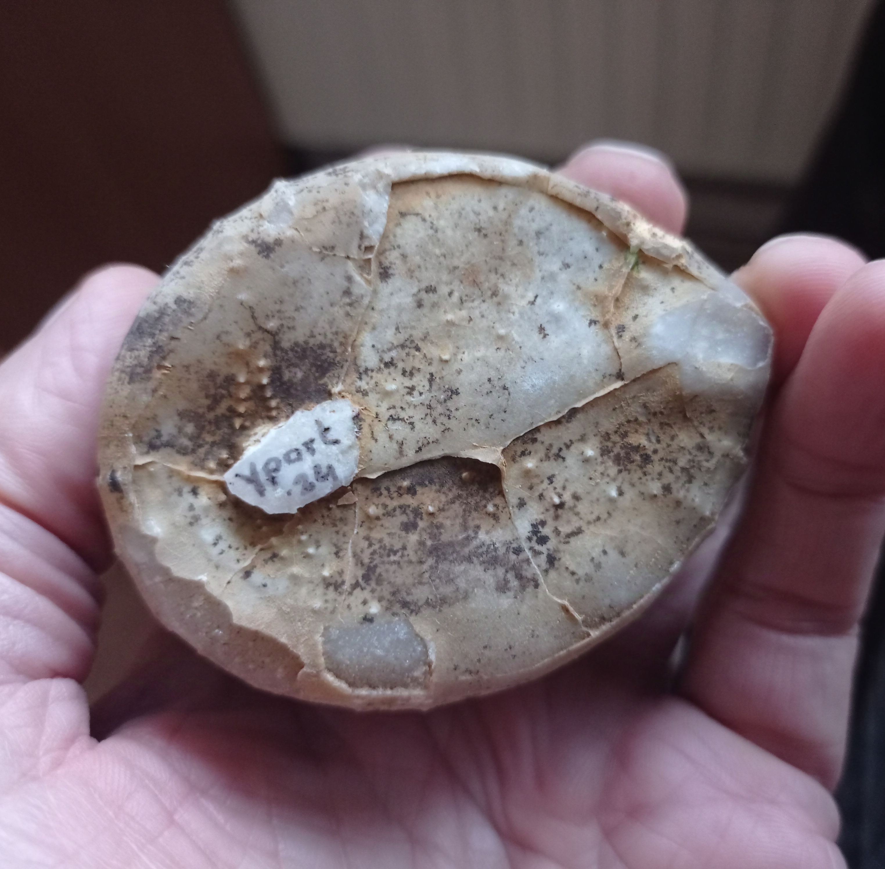 Een maand geleden heeft mijn kleinzoon deze Echinocorys onderaan het klif uit de leem gegraven.