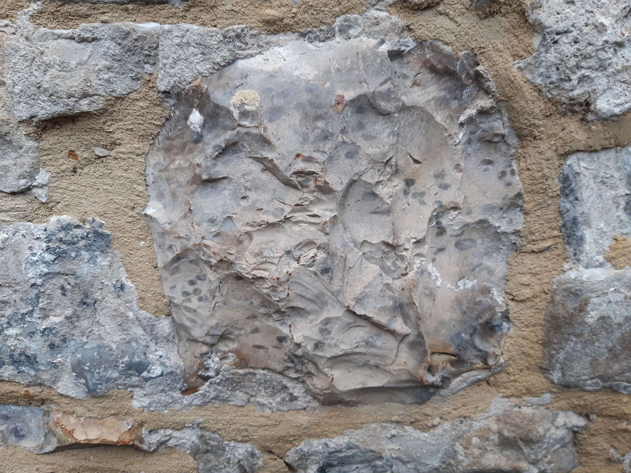 - Muur bestaande uit verschillende gesteentes, hier een vuursteen ertussen.