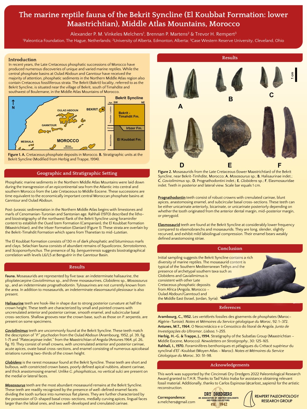 Van 13 tot 15 september dit jaar vond de 7e driejaarlijkse Mosasaurus Meeting in Maastricht plaats, dat veel van de grote namen uit het mosasaurusonderzoek bij elkaar heeft gebracht. Ook ons onderzoeksteam was vertegenwoordig met een tweetal abstracts en bijbehorende posters. De ene daarvan omschrijft de zeereptielenfauna uit Bekrit in Marokko op basis van, in de zogenaamde "olieschalie" van de El Koubbat Formatie, gevonden tanden; de ander de spaarzame vondsten van mosasauriërs materiaal uit de Puskwaskau Formatie van Alberta, Canada.