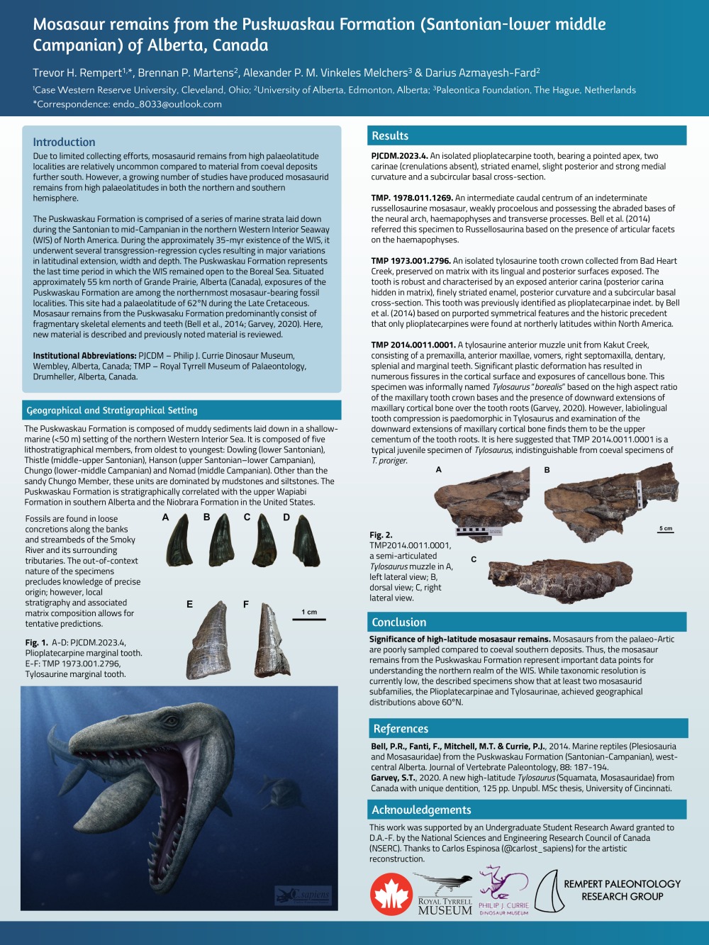 Onderzoeksposters over de zeereptielenfauna van Bekrit en mosasauriërs uit de Puskwaskau Formatie van Alberta, Canada