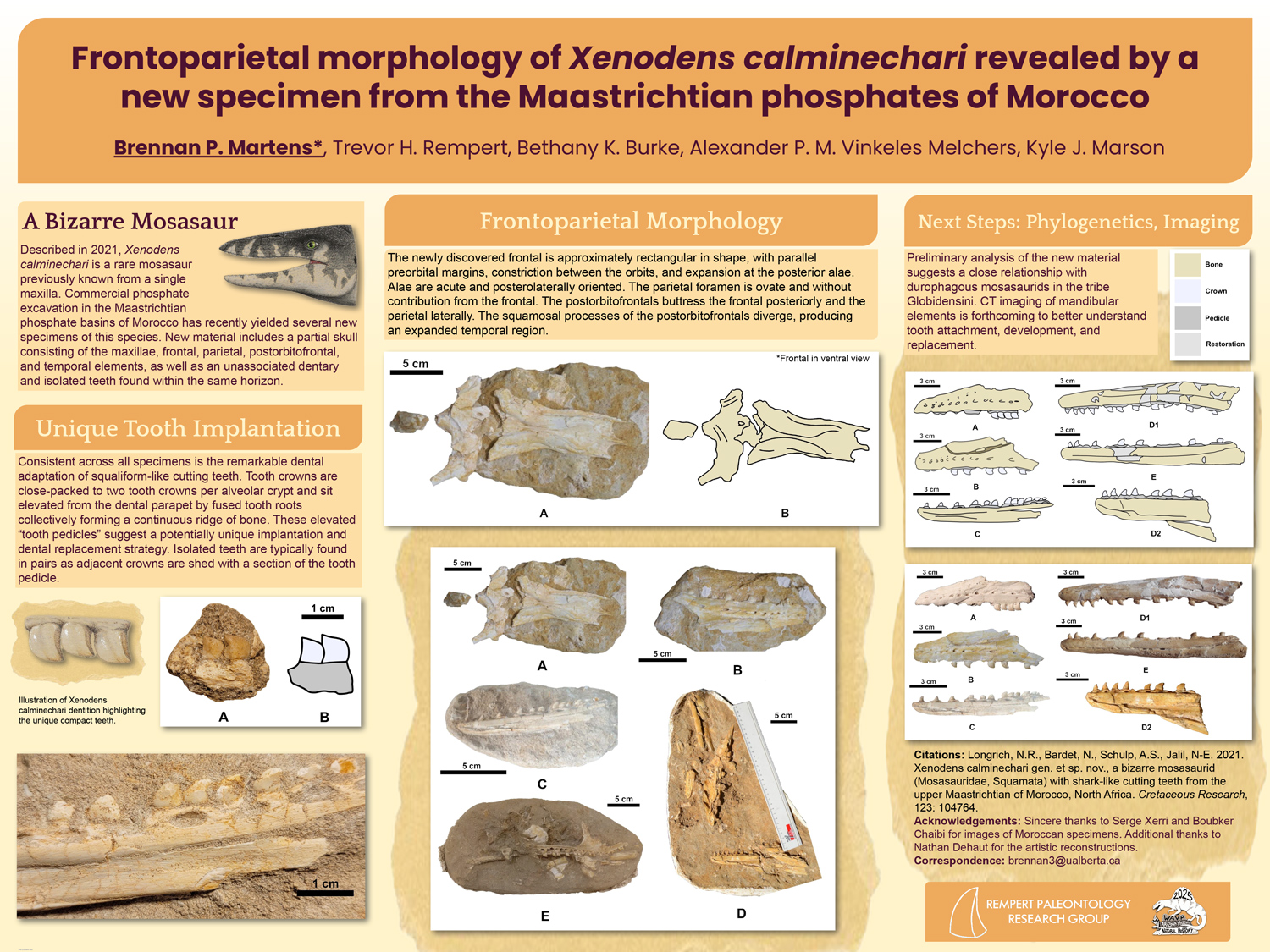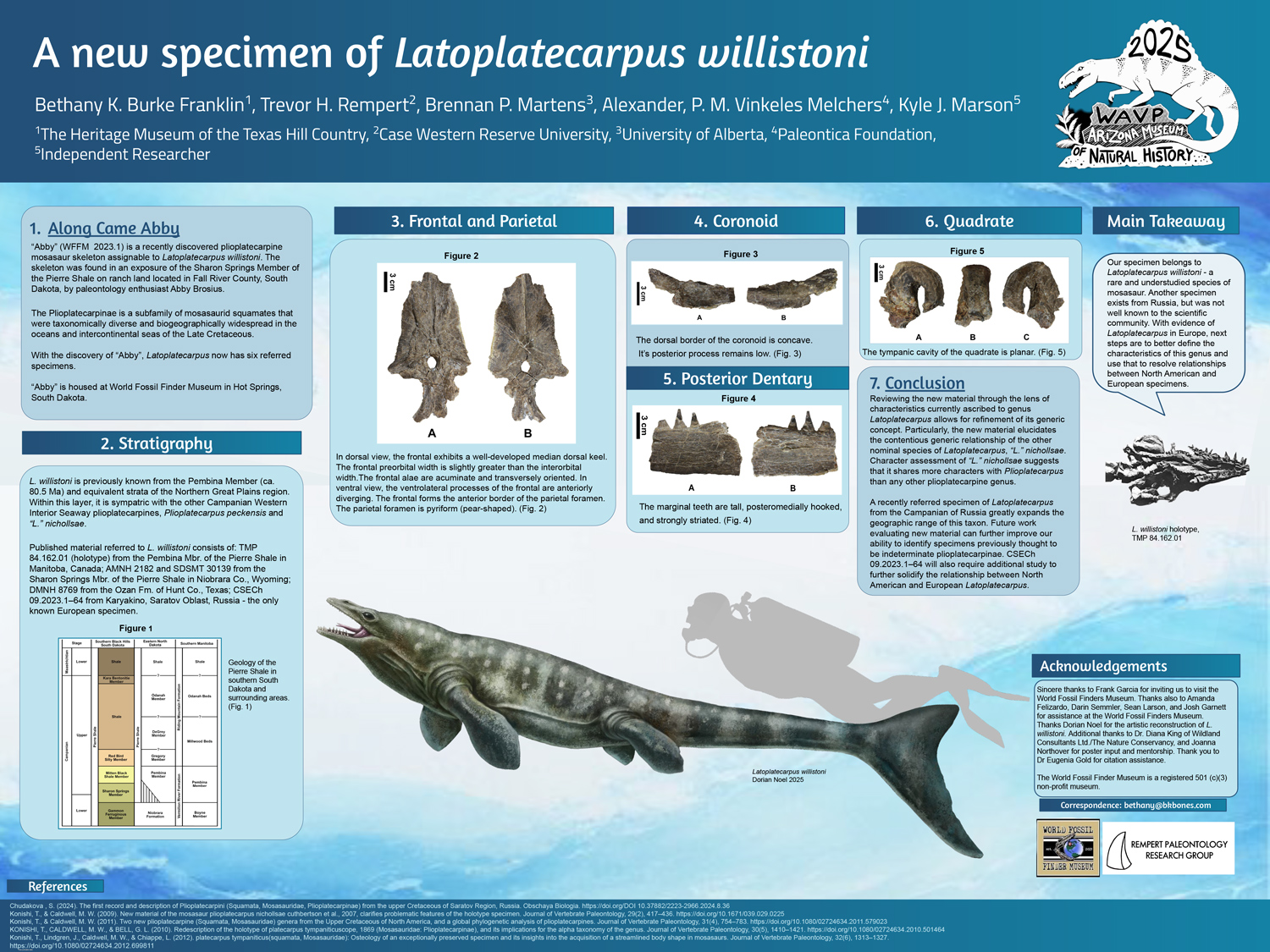 Na de onderzoeksposters die we eind vorig jaar tijdens het 7e driejaarlijkse Mosasaurus Meeting in Maastricht gepresenteerd hebben, heeft onze onderzoeksgroep nu op de jaarvergadering van de Western Association of Vertebrate Paleontology weer een tweetal posters gepresenteerd, beiden over ongebruikelijke en zeldzame mosasaurussoorten. De ene beschrijft schedelmateriaal van de weinig bekende en nog enigmatische mosasaurus Xenodens calminechari uit de fosfaatmijnen van Marokko, de ander van de ongebruikelijke plioplatecarpine mosasauriër Latoplatecarpus willistoni uit South Dakota.
