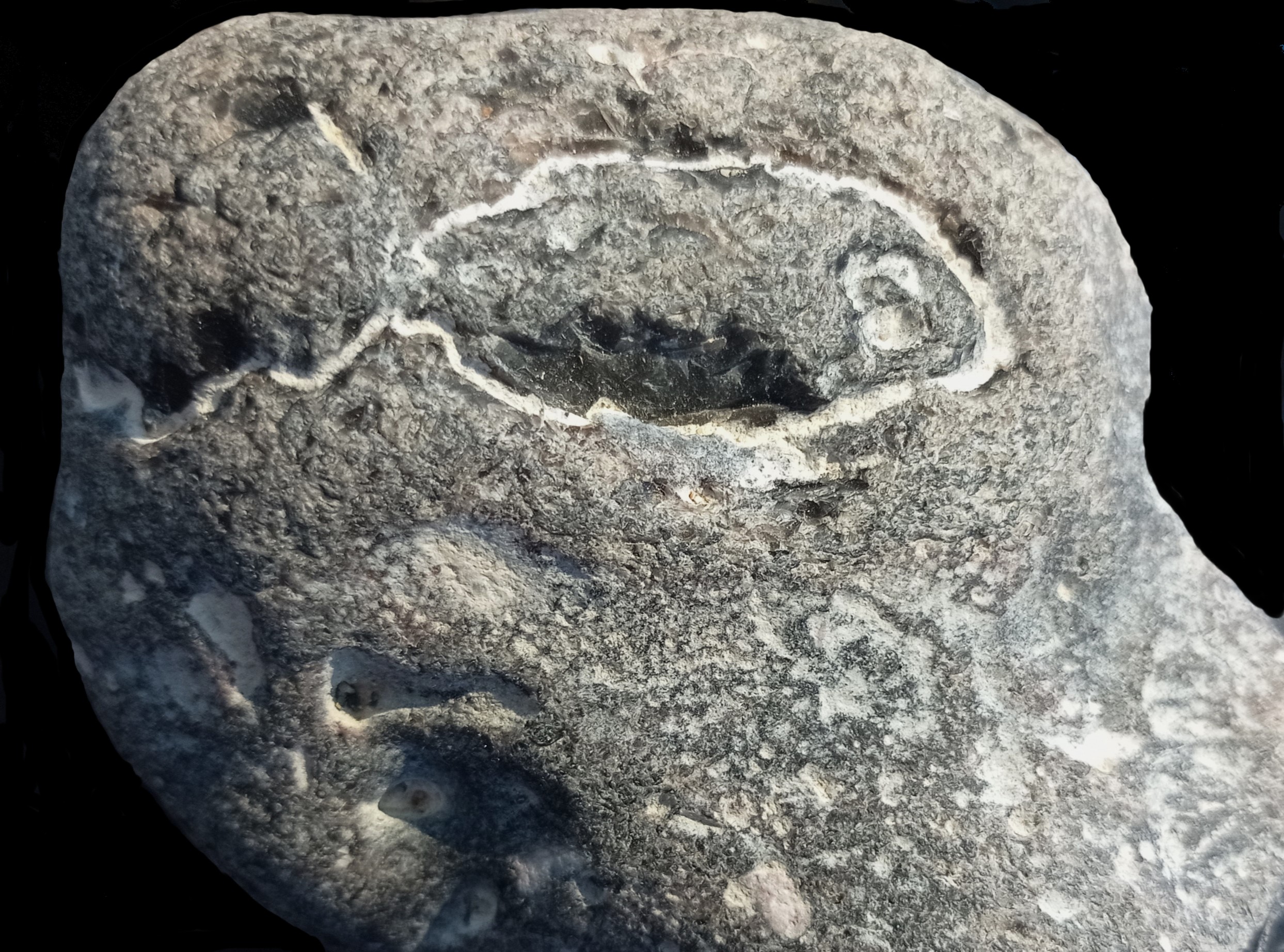 Gisteren heb ik op een vindplaats in de directe omgeving van mijn eigen huis (in Drenthe) een afgerond brok vuursteen gevonden met daarin de afdruk van een redelijk goed bewaarde fossiele vis van 5 tot 6 cm. Ik kon het haast niet geloven wat ik zag en tot nu toe is mij zoiets nog nooit eerder onder ogen gekomen. Daarom ben ik erg gelukkig met deze bijzondere vondst waarvoor ik graag een plekje zoek in de vitrine.
