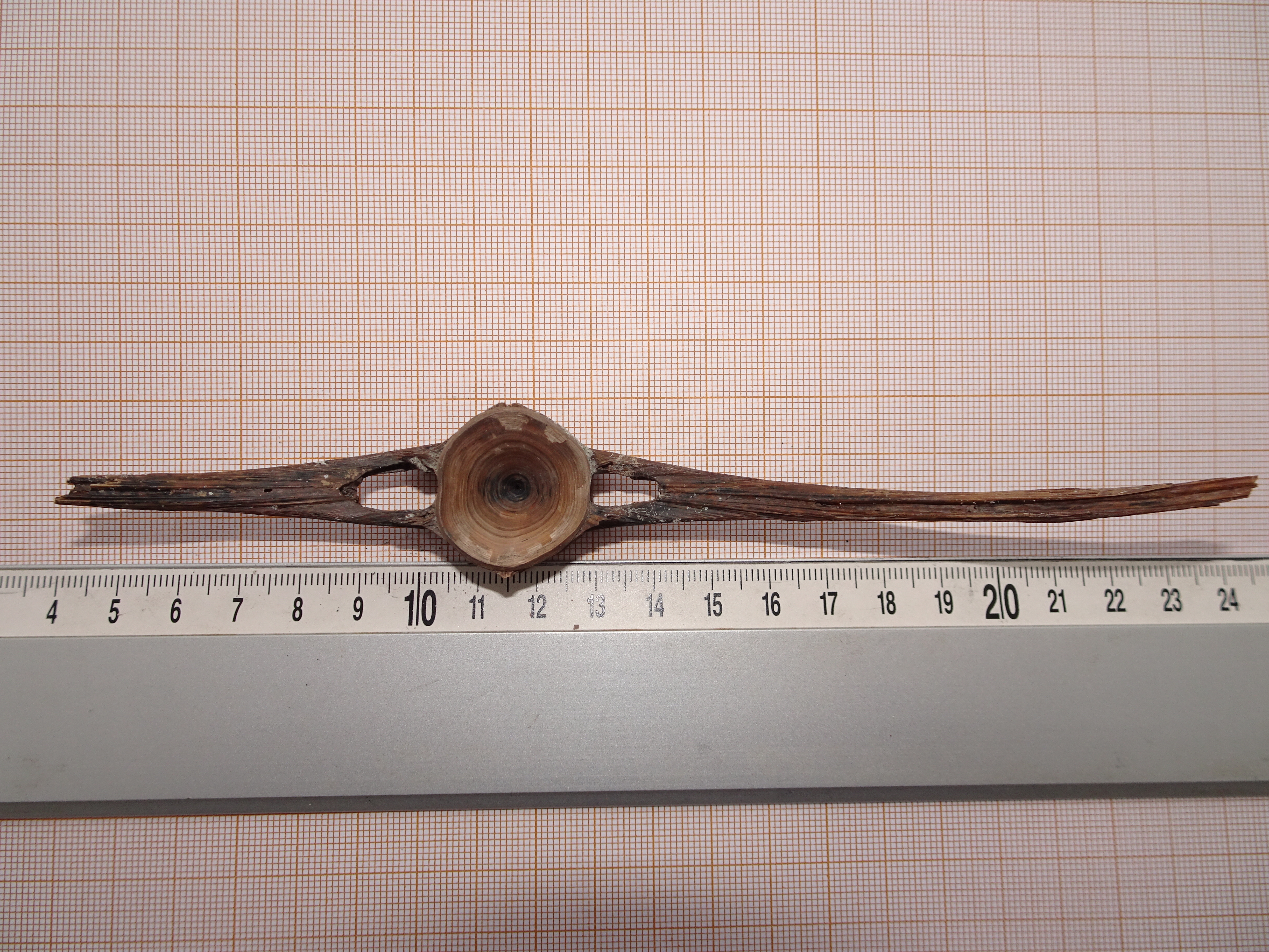 Deze beschadigde wervel van een beenvis heb ik onlangs gevonden op het strandje van De Kaloot (Zeeland). Het lijkt mij een caudale wervel (zeg maar tussen buikholte en staartwortel). Ik weet niet of hij echt fossiel is, hij is niet versteend, maar hij is in ieder geval ook niet vers. De lengte is 167 mm, maar omdat hij is beschadigd schat ik de oorspronkelijke lengte op circa 20 cm. Dat is een forse maat, en daarom denk ik dat de vis waarvan deze afkomstig is minimaal een lengte van een meter of meer moet hebben gehad. In onze zee-regio (Noordzee en Kanaal) zijn er maar weinig beenvissen die die lengte kunnen bereiken en waarvan deze wervel afkomstig kan zijn. Ik denk dan aan Tonijn, Steur, of eventueel ook Heilbot of Maanvis. Maar er zijn misschien nog wel meer mogelijkheden. Is er iemand die hier meer over kan zeggen, is mijn redenering correct, en is een soort of soortgroep te noemen waar deze vondst van afkomstig is?