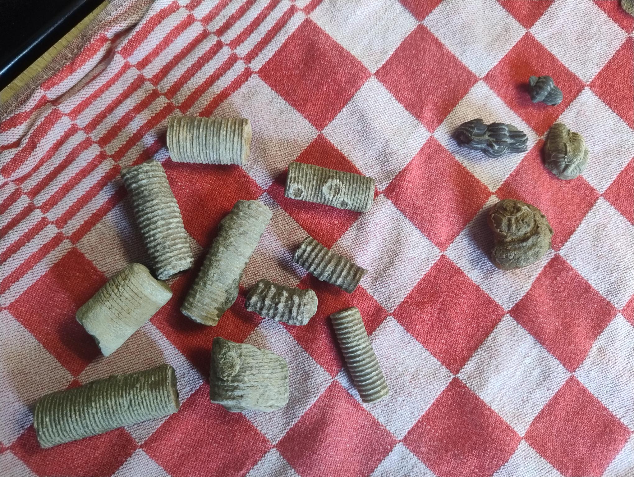 Hierbij nog de foto's van de vondsten uit de Eifel. Op één stukje crinoïde zitten meerdere rondjes. De segmentjes lijken gewoon door te lopen. Nog nooit gezien. Weet iemand wat dat is?