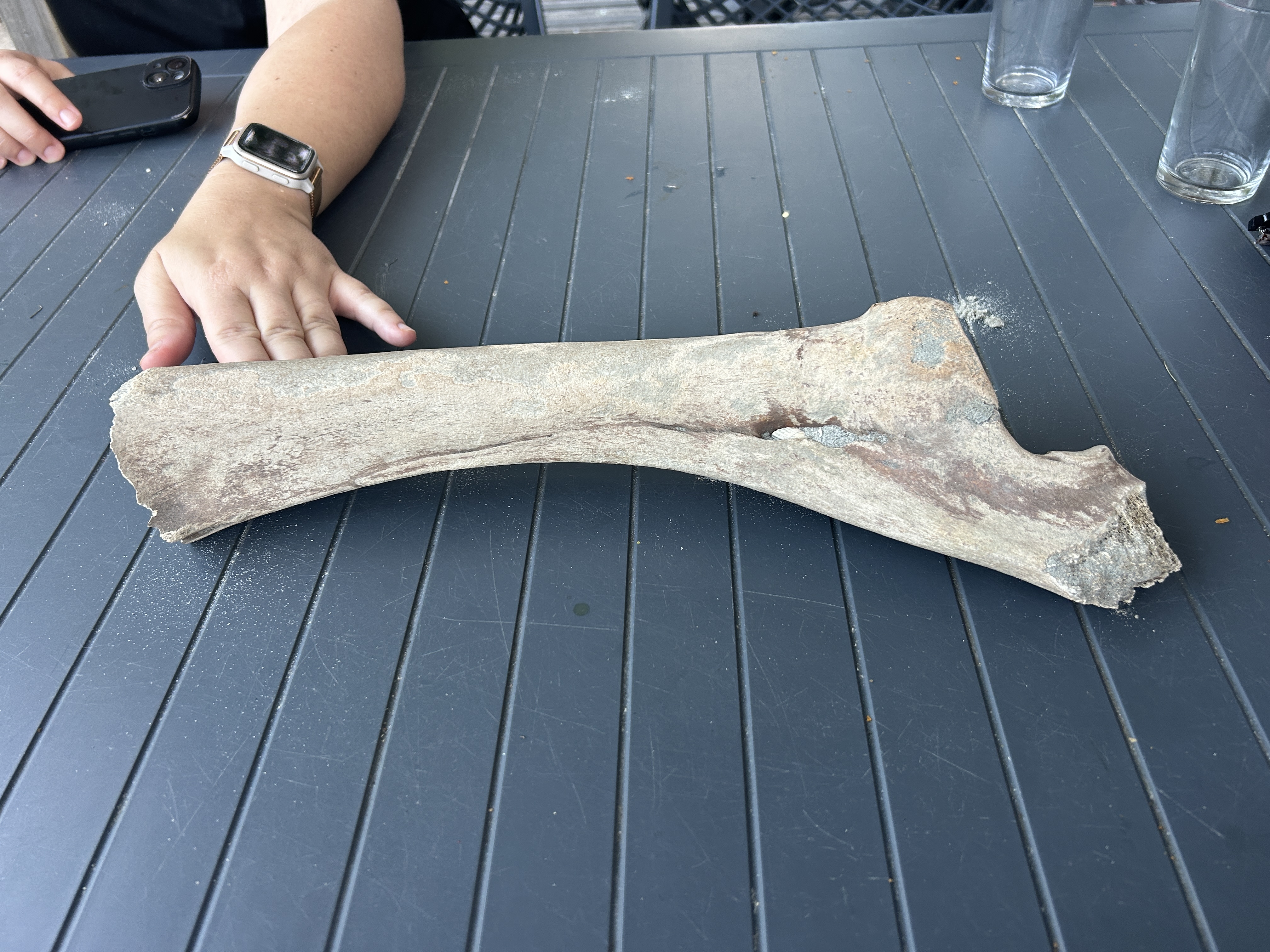 Volgens mij een dijbeen. Misschien van een groot rund. Ik kan de afmetingen niet goed inschatten, maar het lijkt een flink bot.