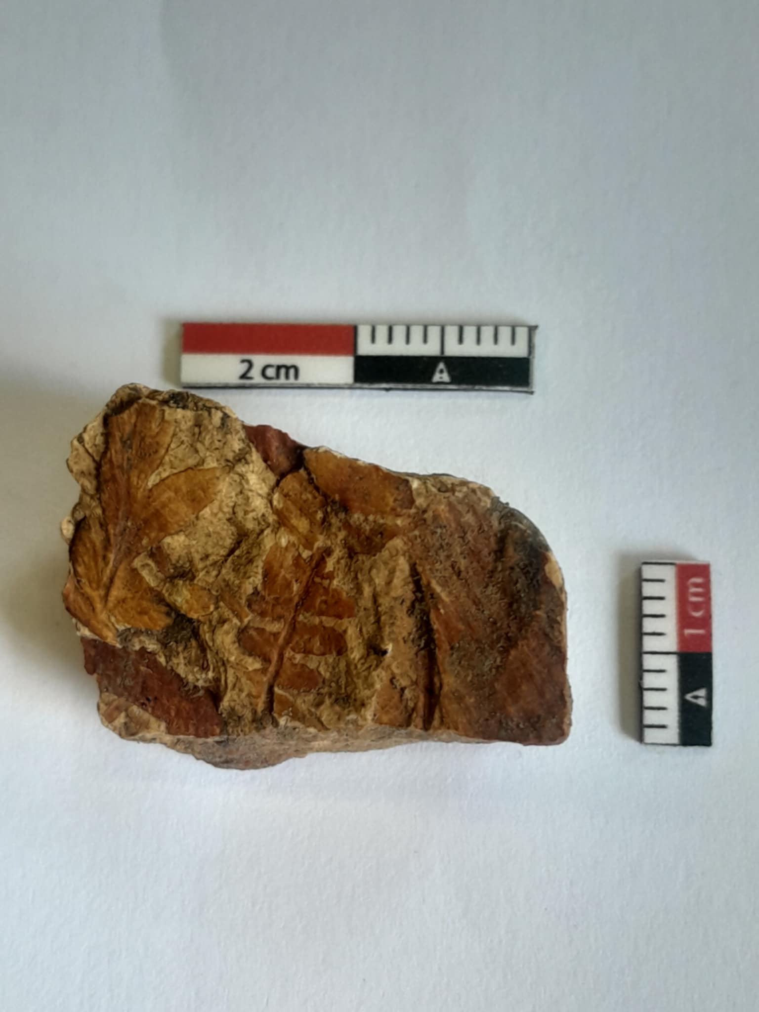 De steen zelf meet maar 3cm op 2cm. Aan één zijde zijn blaadjes zichtbaar, ik lijk meer dan twee verschillende soorten te herkennen.