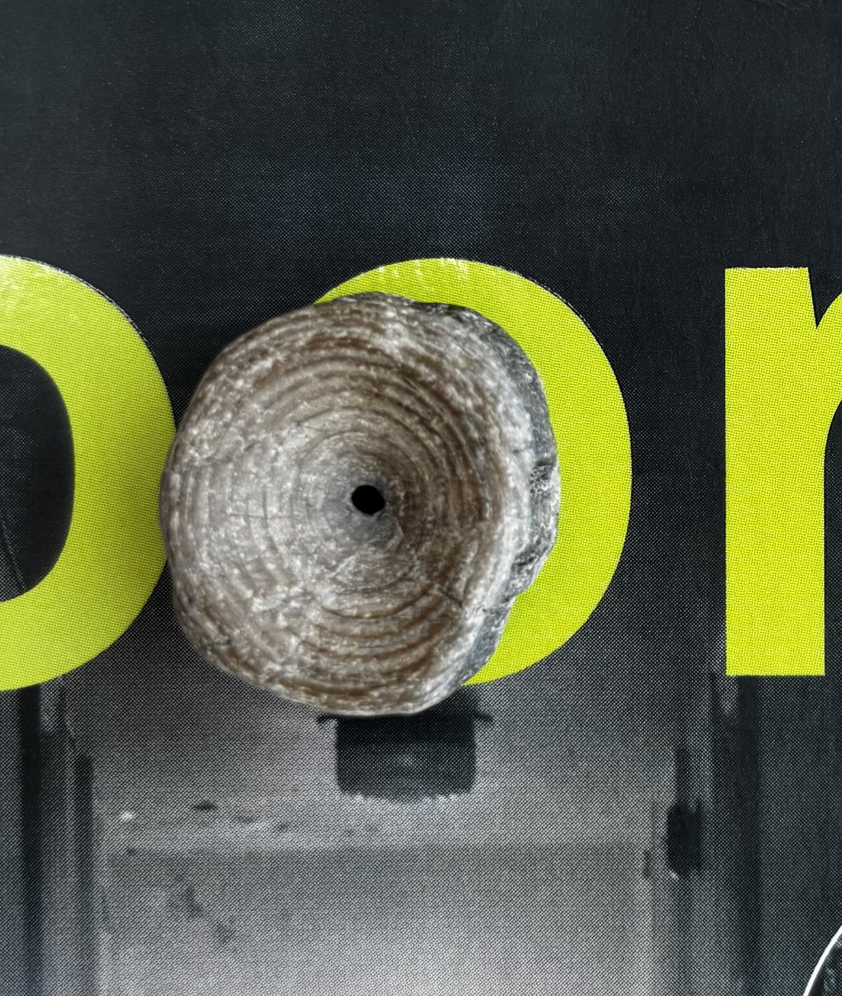 We vonden deze ‘steen’ op het strand van Bidart, Frans Baskenland. Hij is rond, 8 mm dik, grote van één euromunt. Met ringen en een gat in het midden, hij wordt ook dunner naarmate je naar het midden van de cirkel voelt. De buitenkant heeft rechthoekige inkepingen.